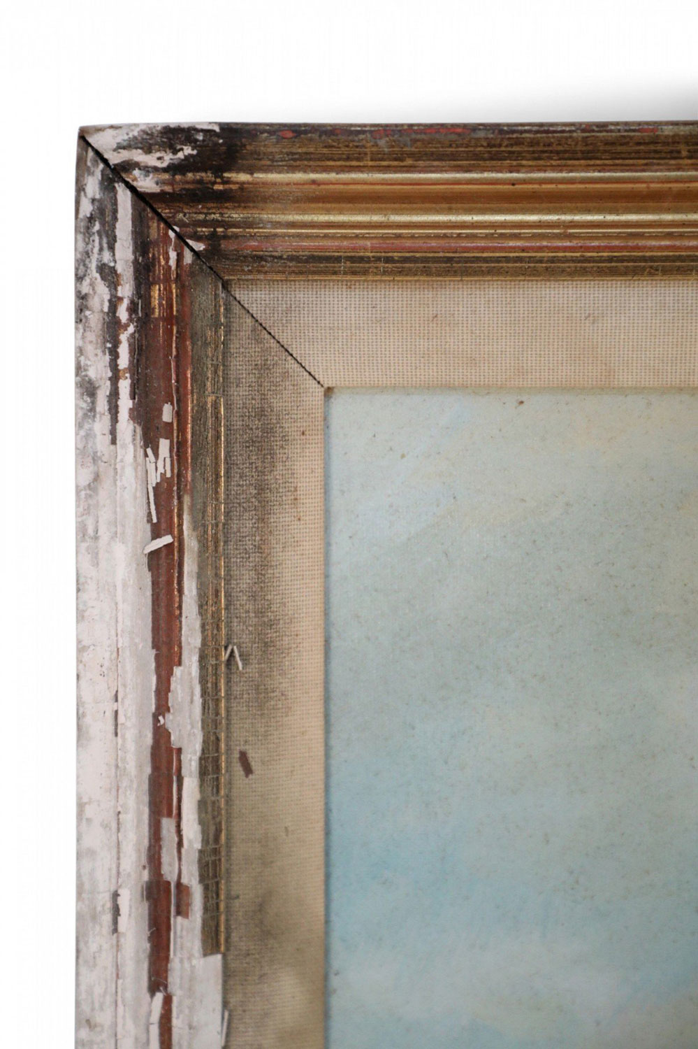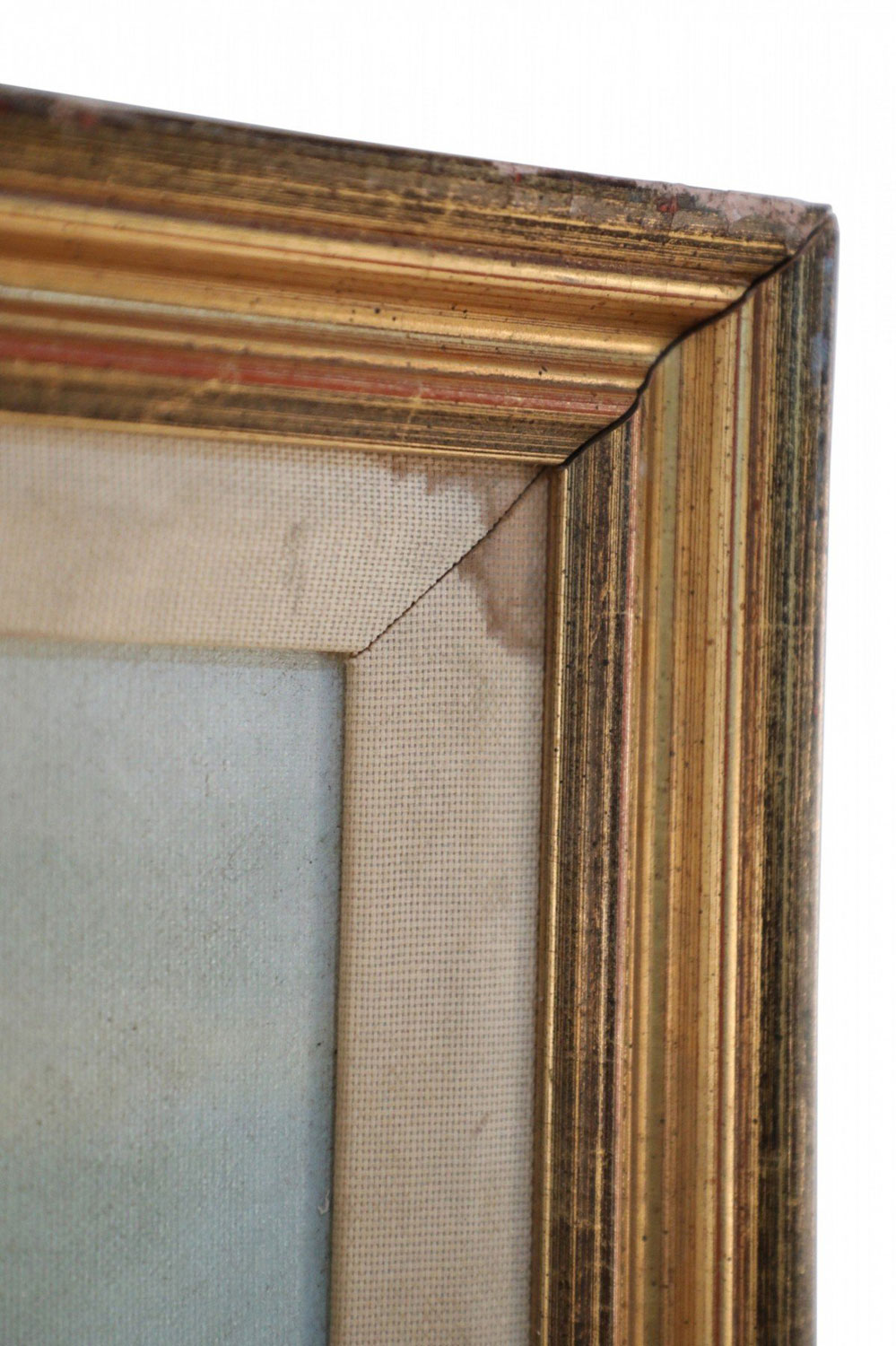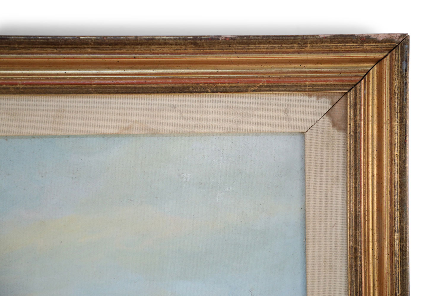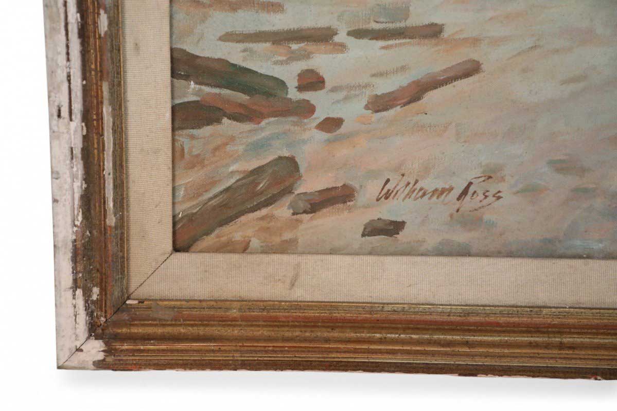 Vintage oil painting depicting boats pulled ashore alongside families in the sand, and a red roofed village in the distance, in a heavily distressed gold frame with a cloth liner.