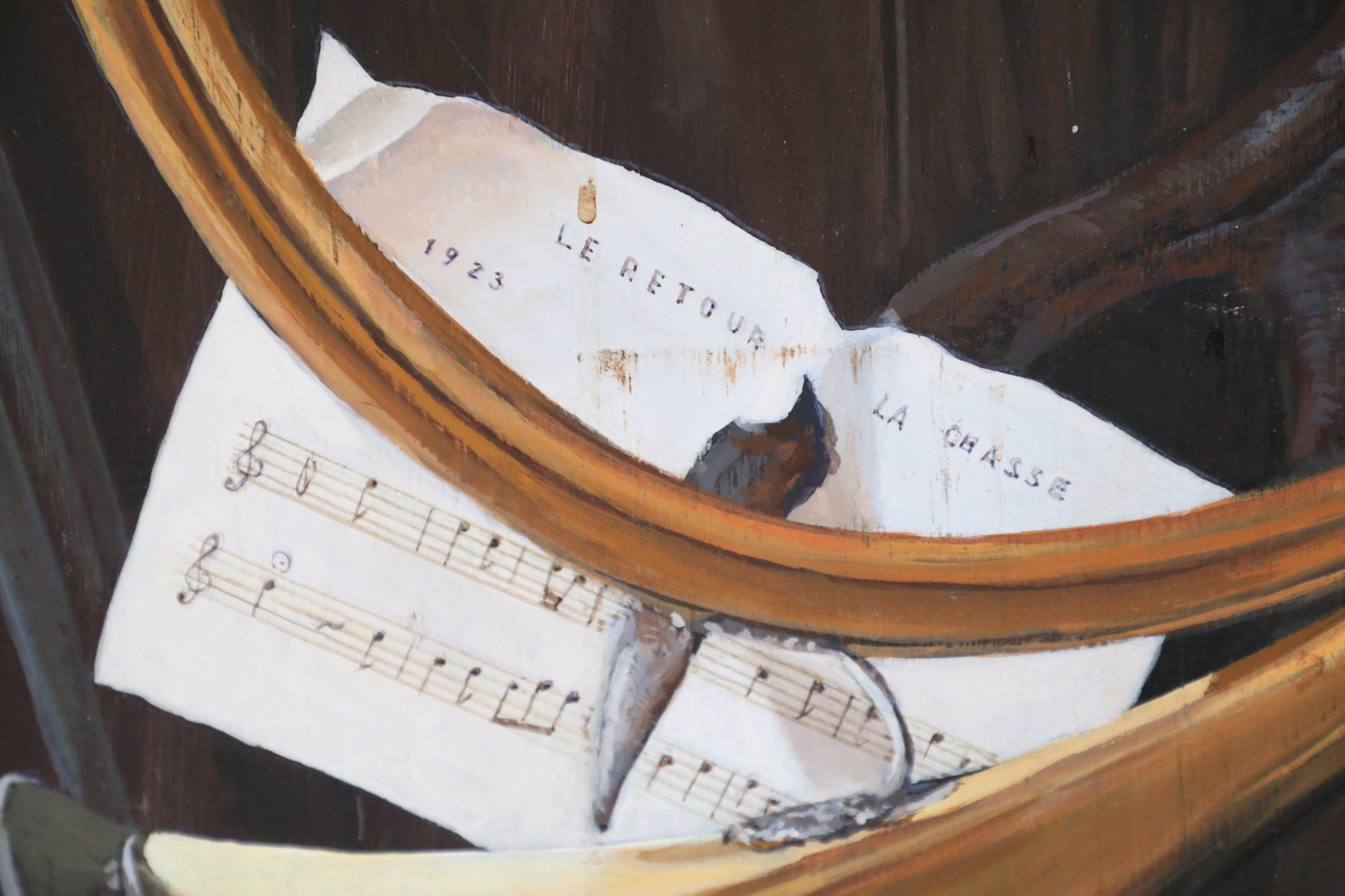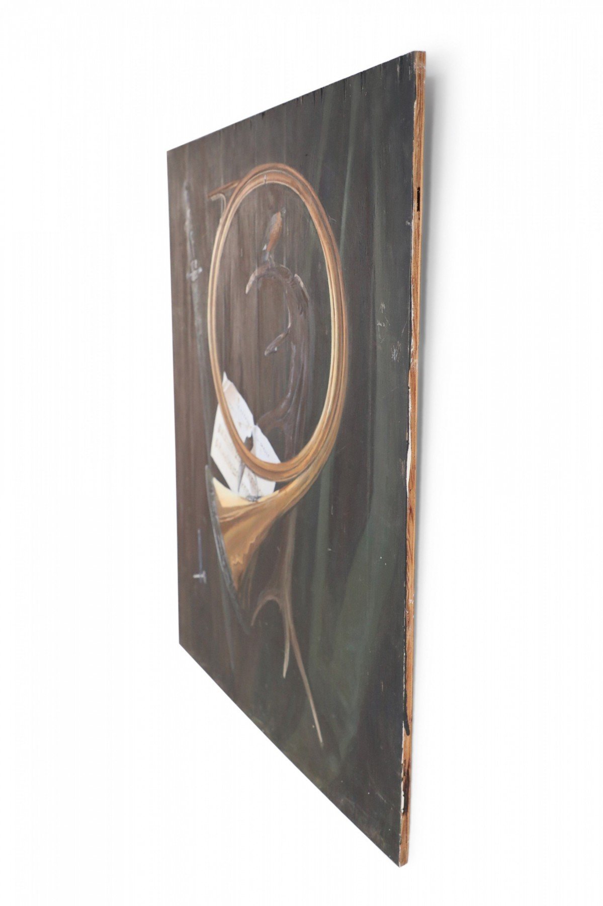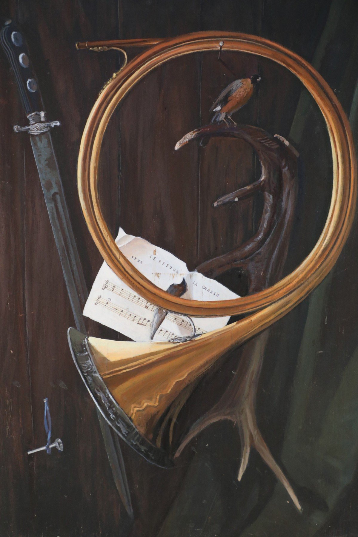Vintage (20th Century) acrylic still life of a brass horn and sword alongside a bird perched on an antler that is spearing sheet music reading, Painted on rectangular plywood. (Similar piece: NWL2240)."