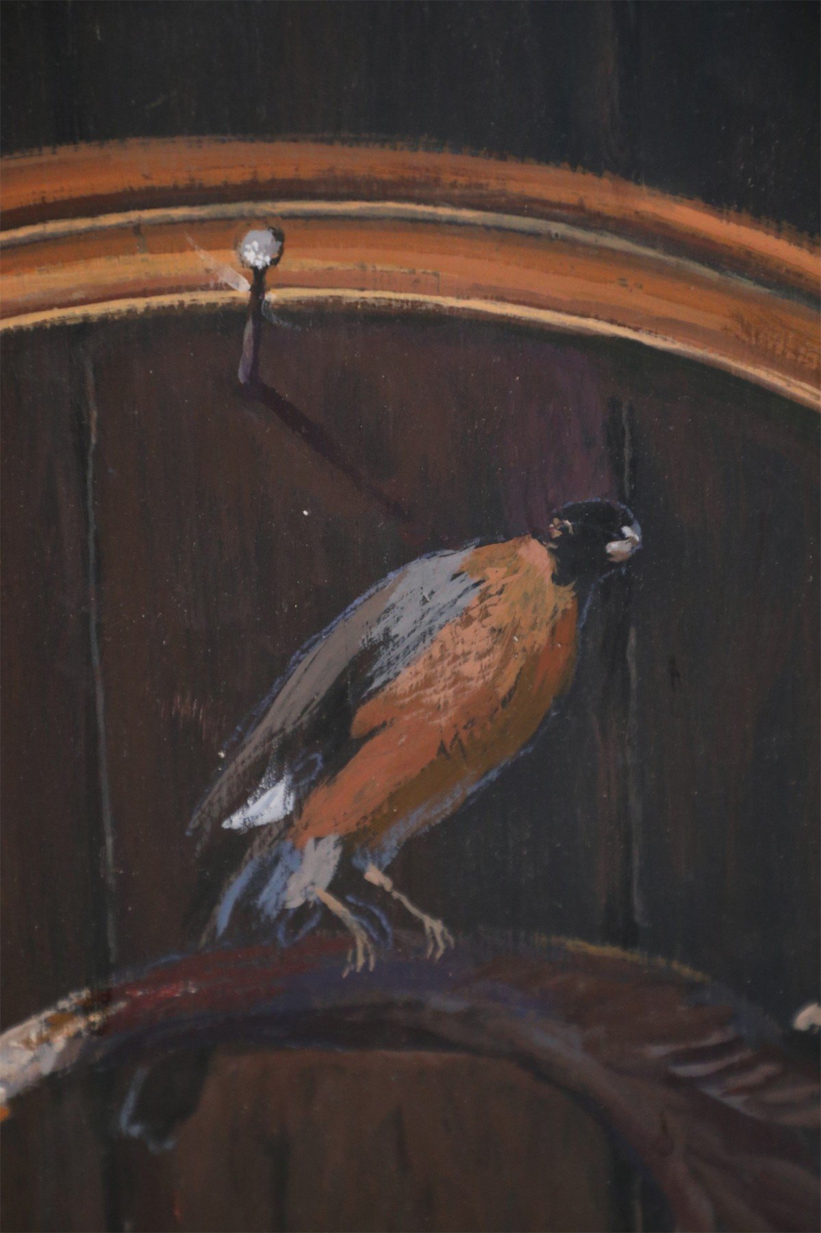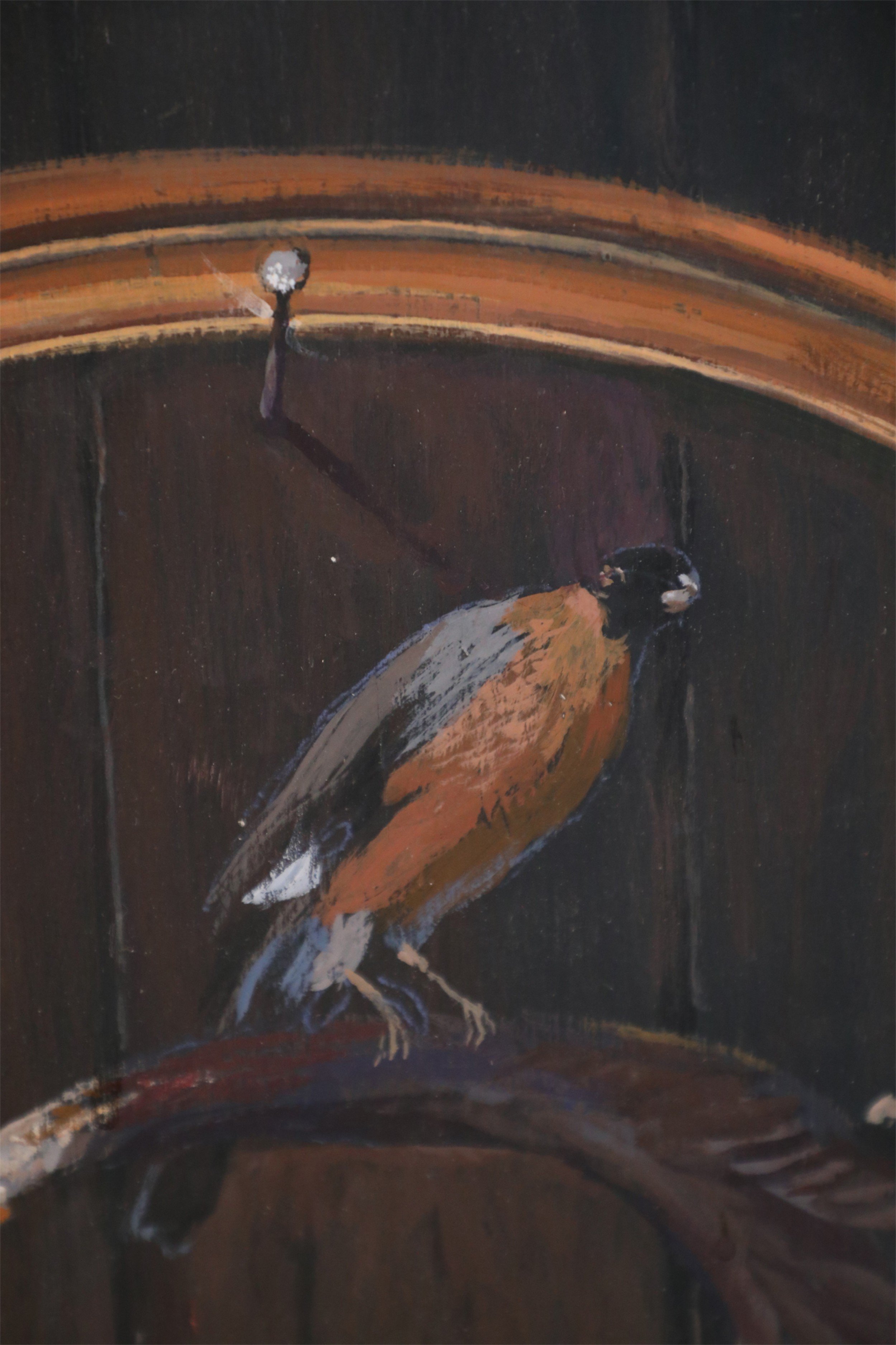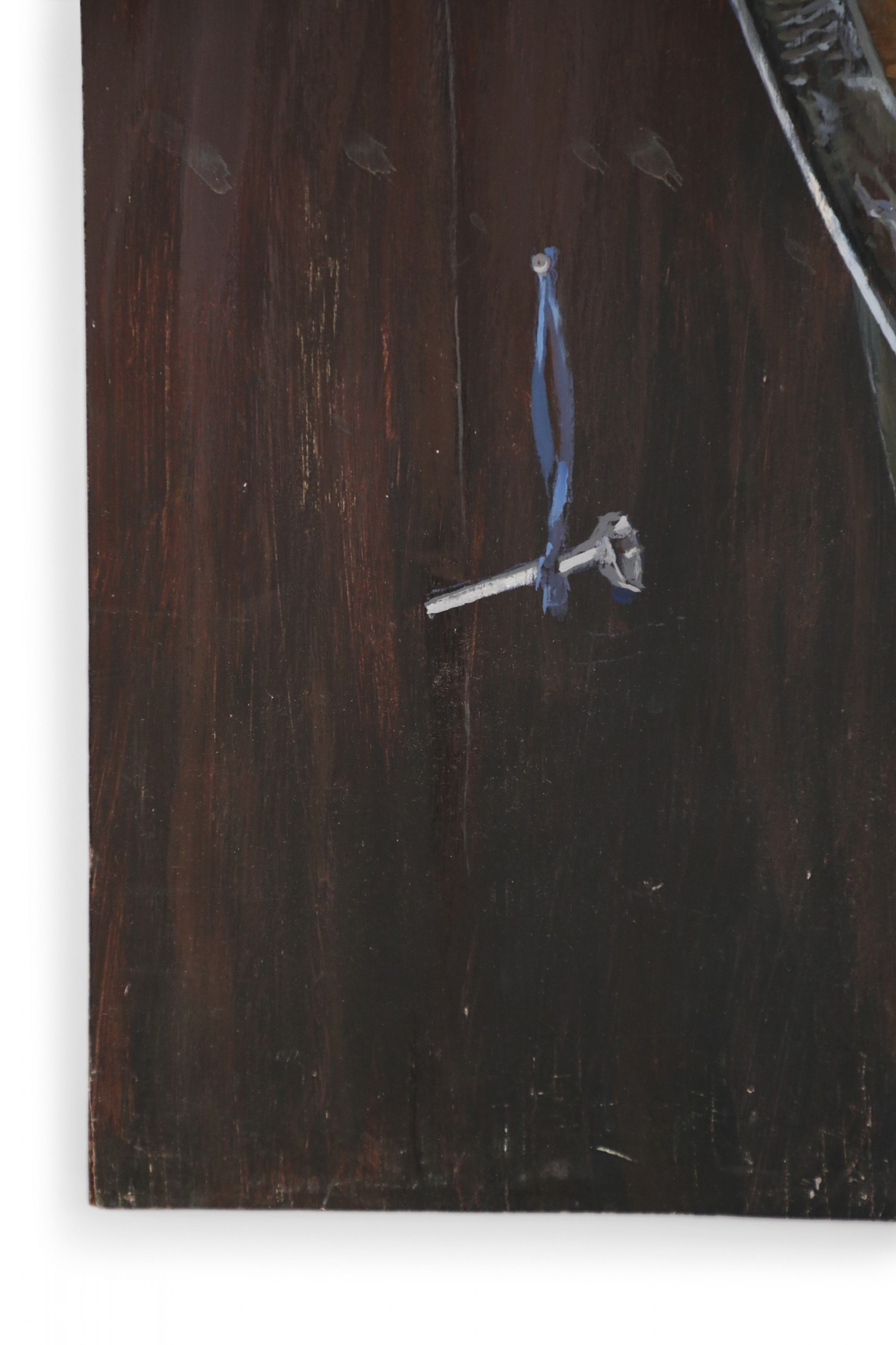 Vintage (20th Century) acrylic still life of a brass horn and sword alongside a bird perched on an antler that is spearing sheet music reading, Painted on rectangular plywood. (Similar piece: NWL2240)."