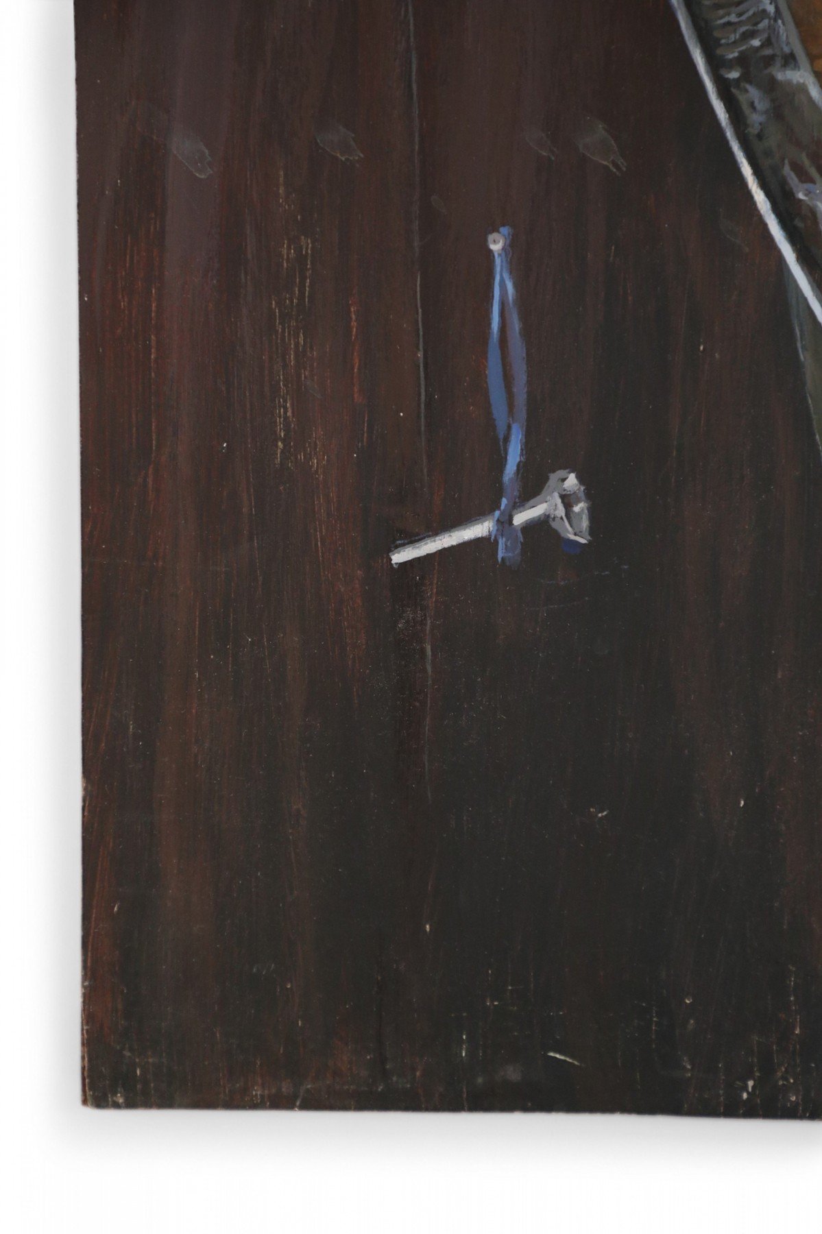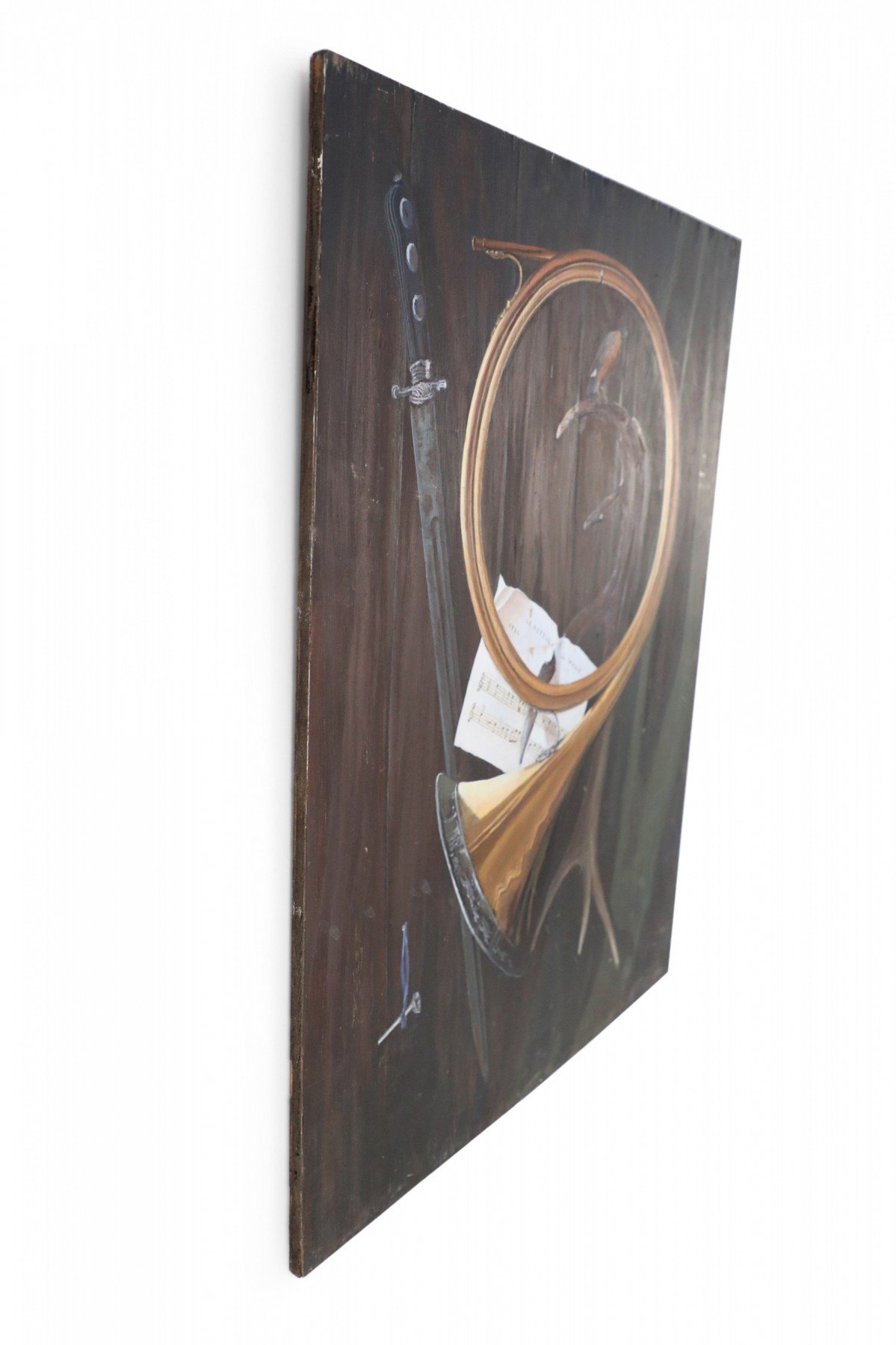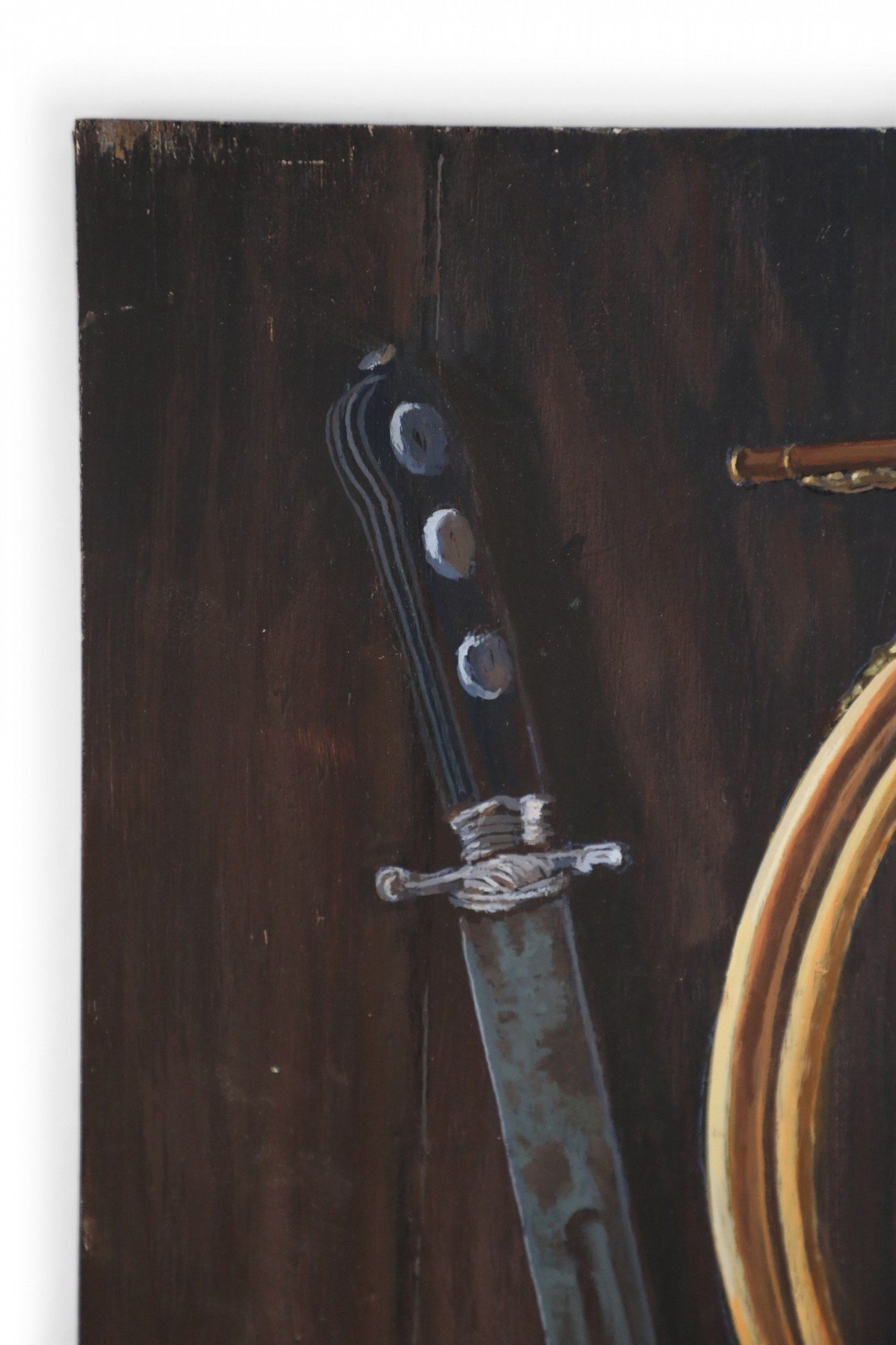 Choose one of the options below.Brass Horn, Sword, and Antler Still Life Painting on Wood
