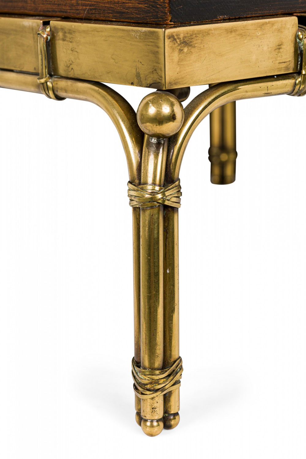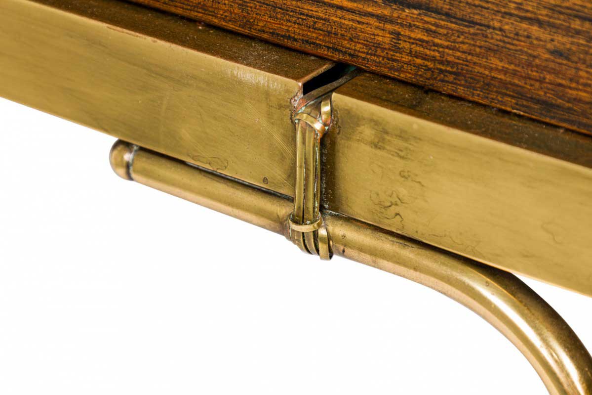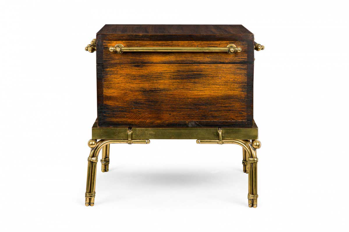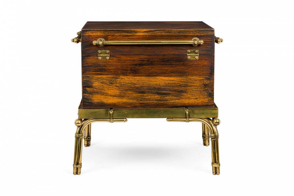 American Mid-Century strong box / chest with a painted and lacquered walnut hinge top case with wire wrapped brass handles, resting on a four-legged brass base.