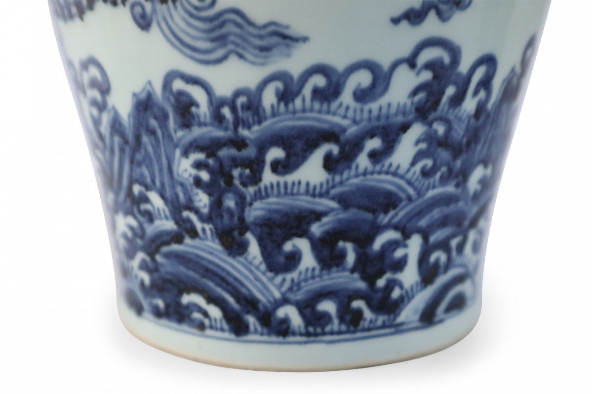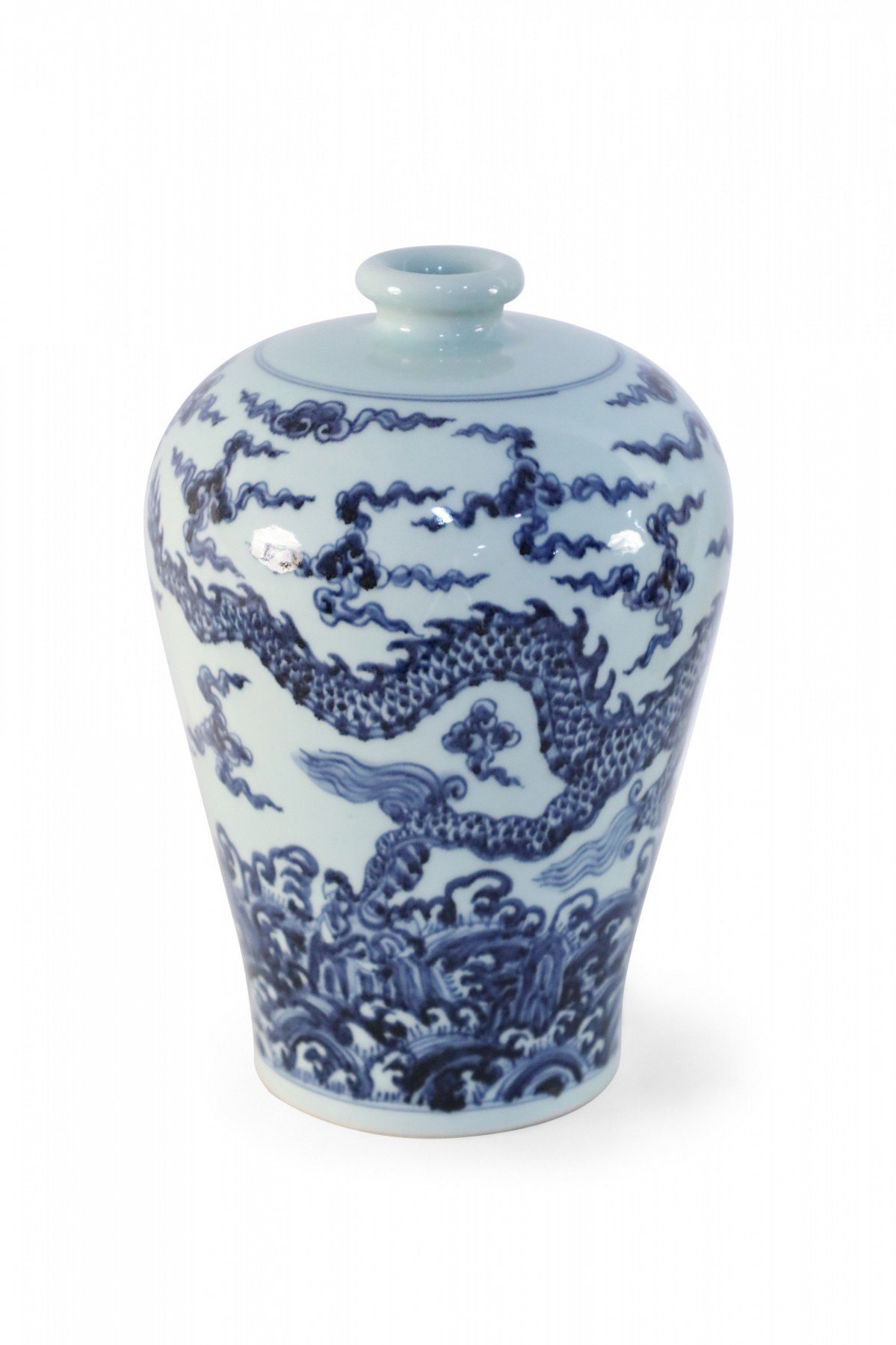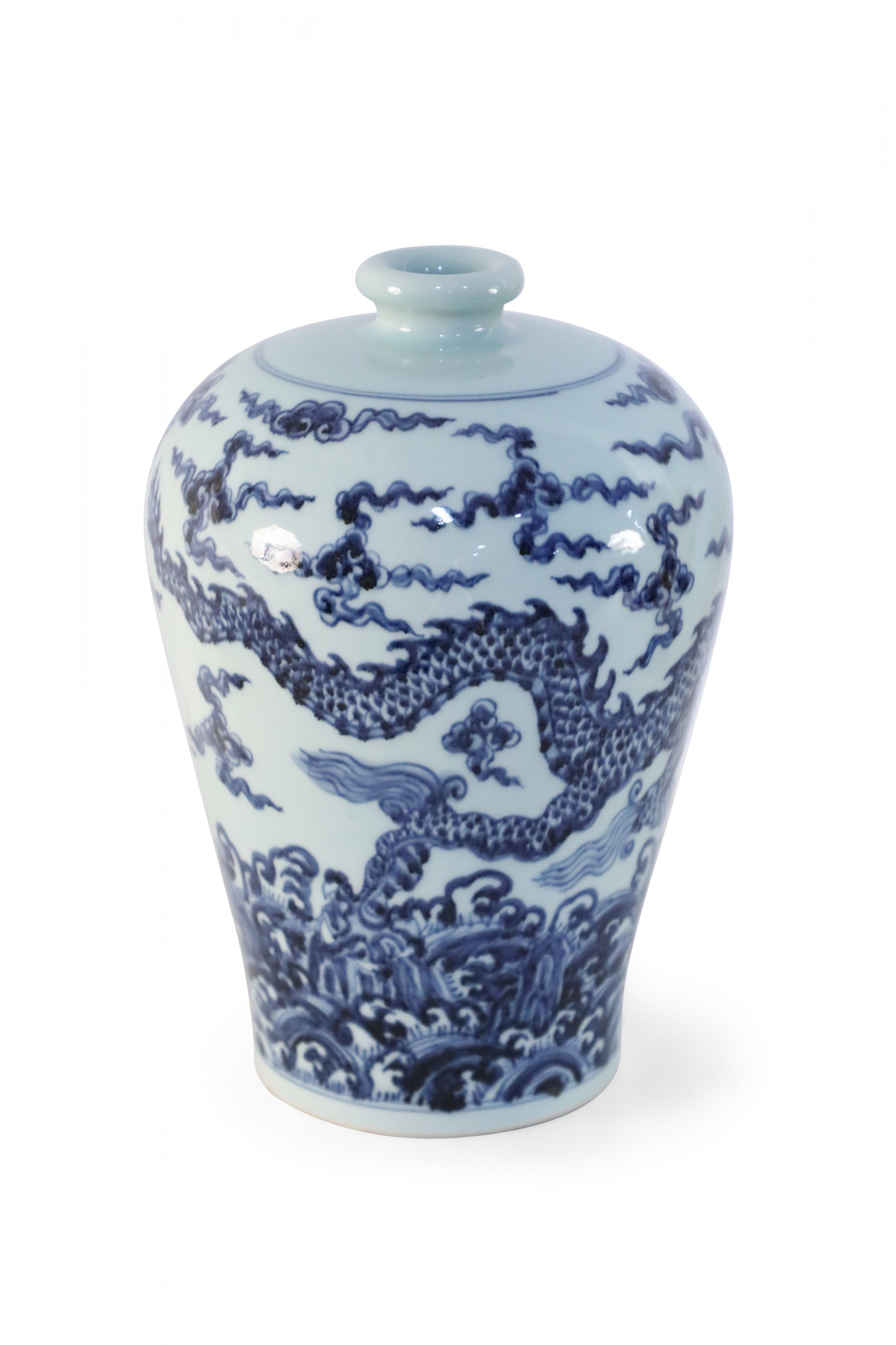 Antique Chinese white porcelain Meiping vase decorated in a swirling blue dragon motif.