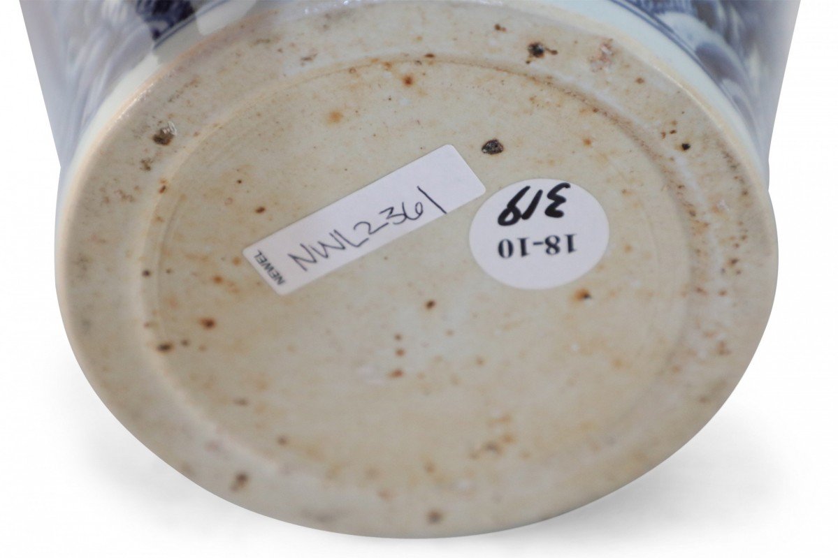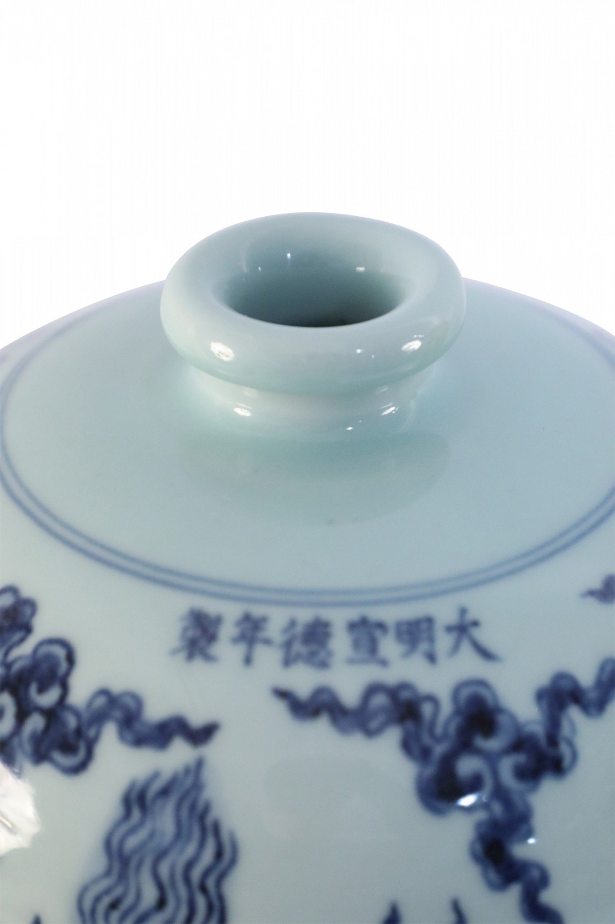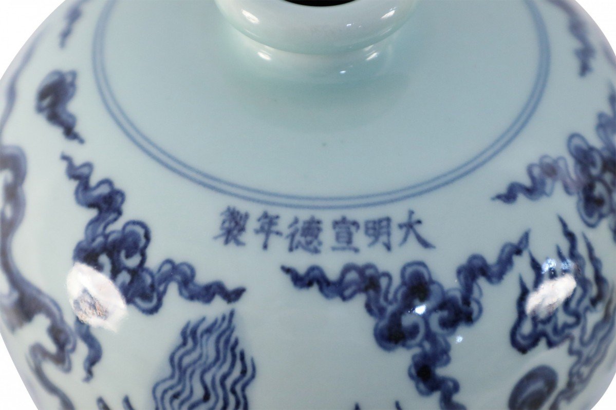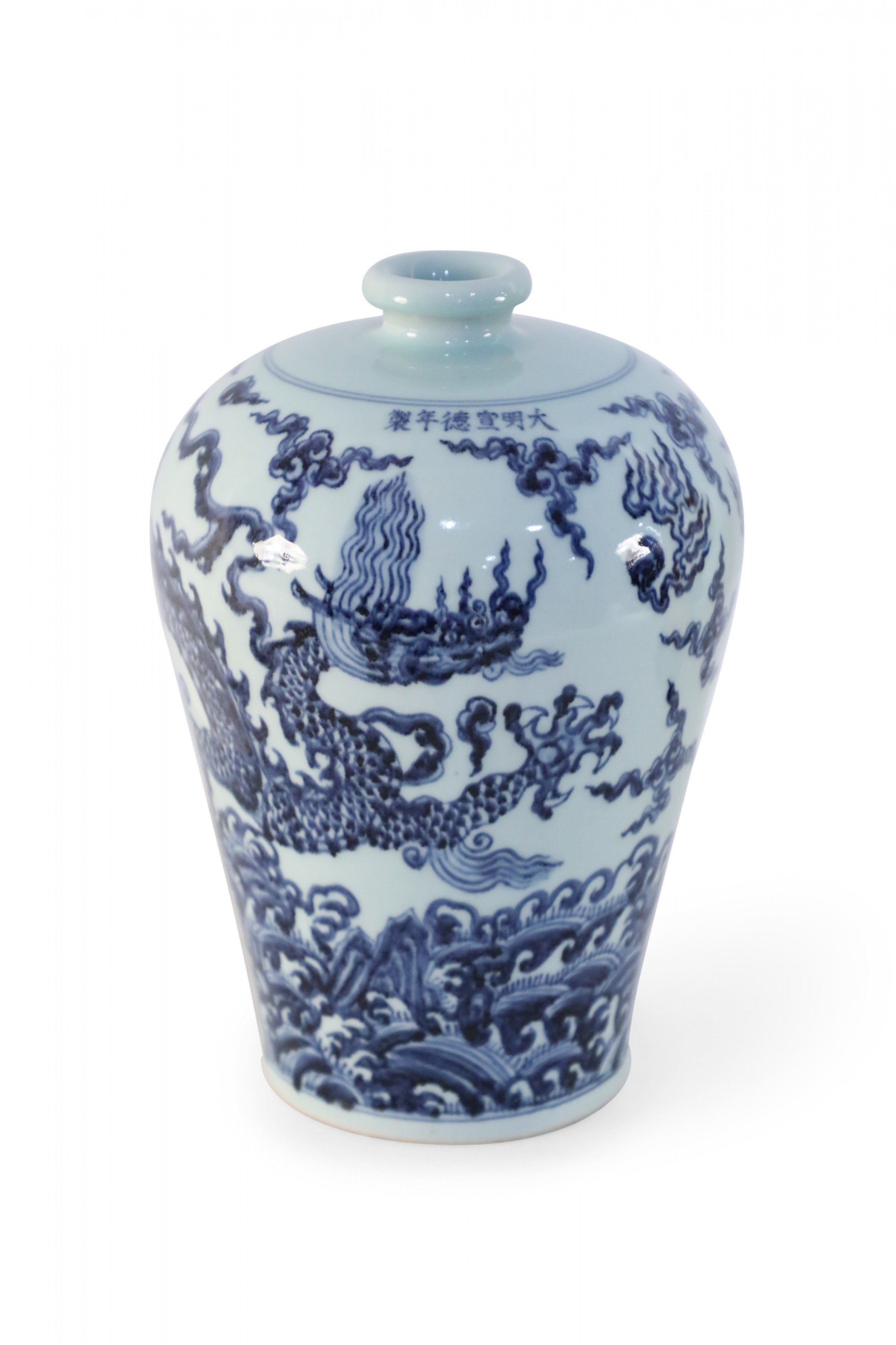 Antique Chinese white porcelain Meiping vase decorated in a swirling blue dragon motif.