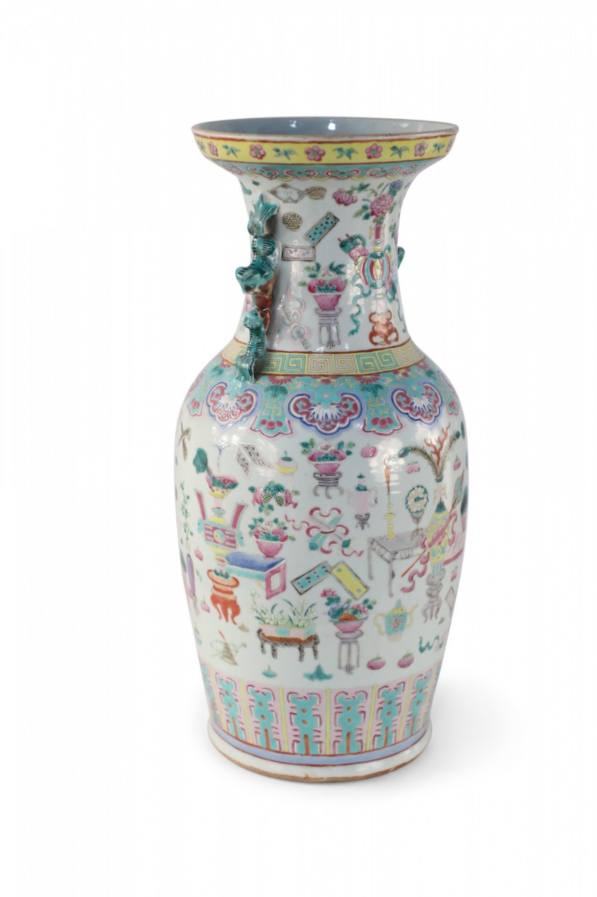 Antique Chinese (Late 19th Century) white porcelain vase painted with a pink and green bogu pattern featuring bonsai, art objects, and calligraphy, green tiger ornamentation on each side of the neck and a yellow band around the vase mouth.