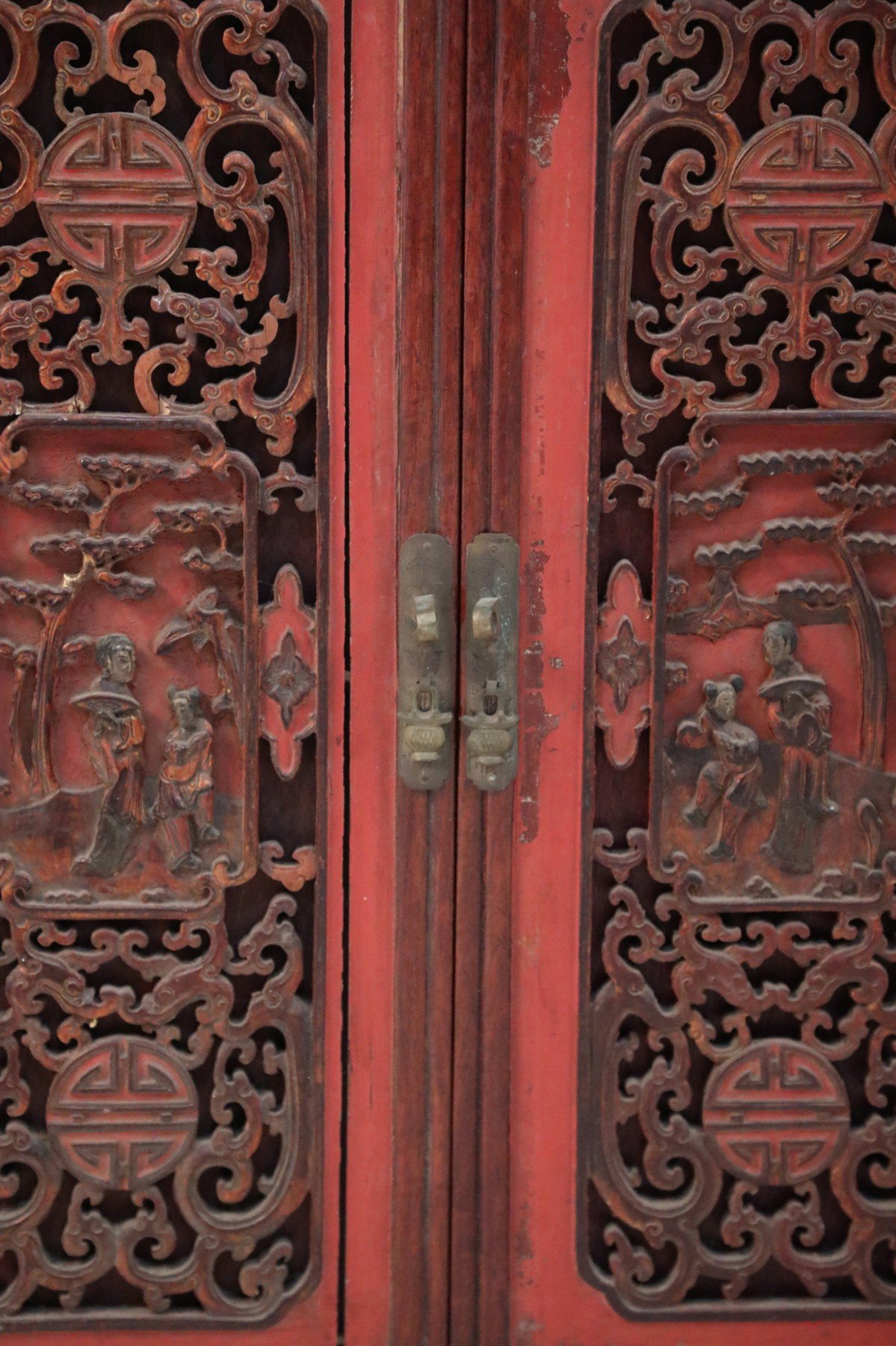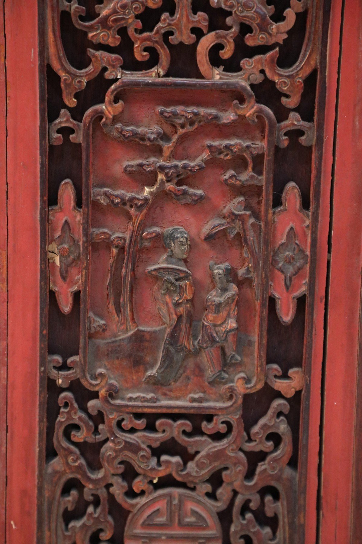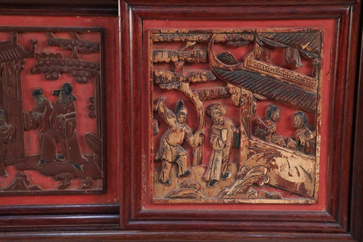 Chinese Bogu wooden etagere featuring open display shelving connecting ornately carved, red framed doors, two red drawers with golden foliage ornamentation and drawer pulls, and sliding doors, decorated in richly-depicted raised figurative scenes.