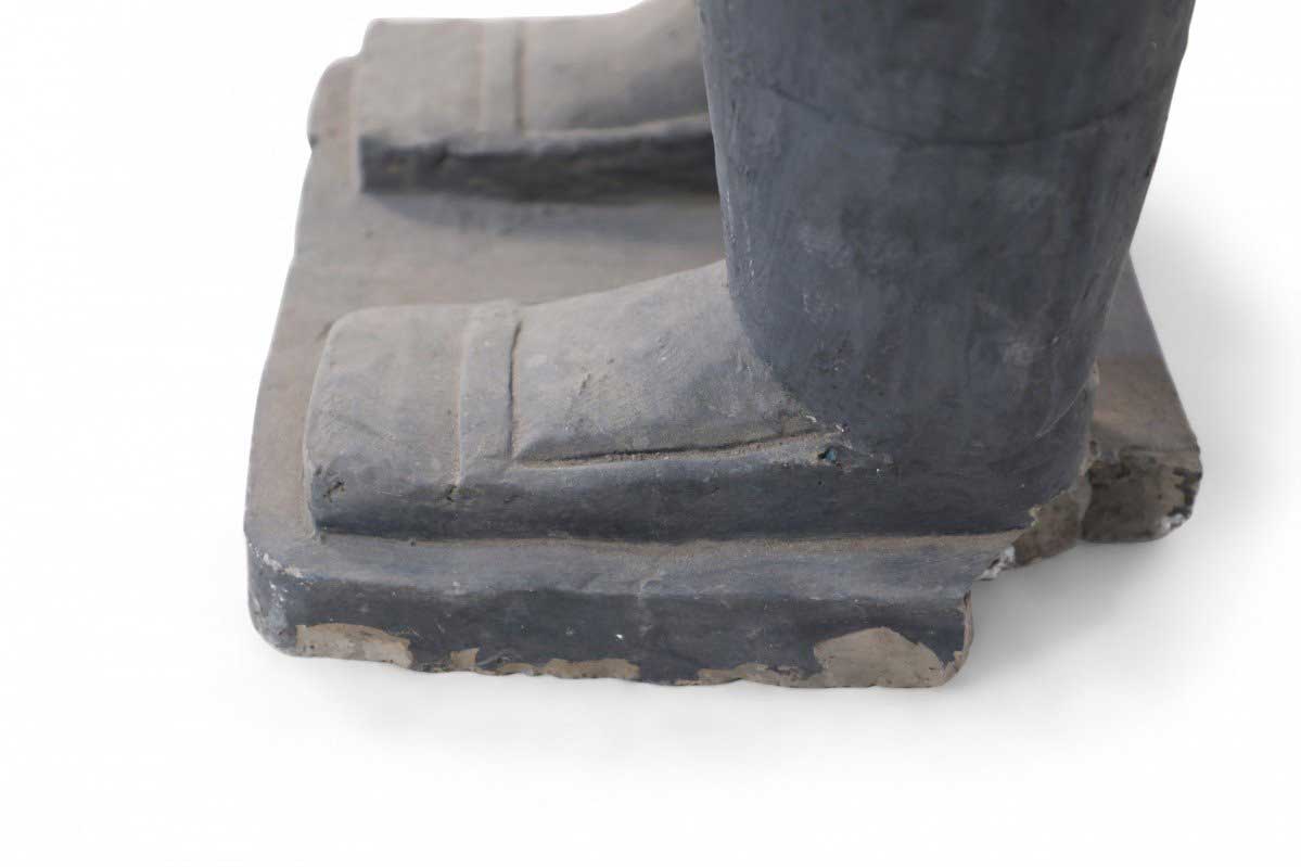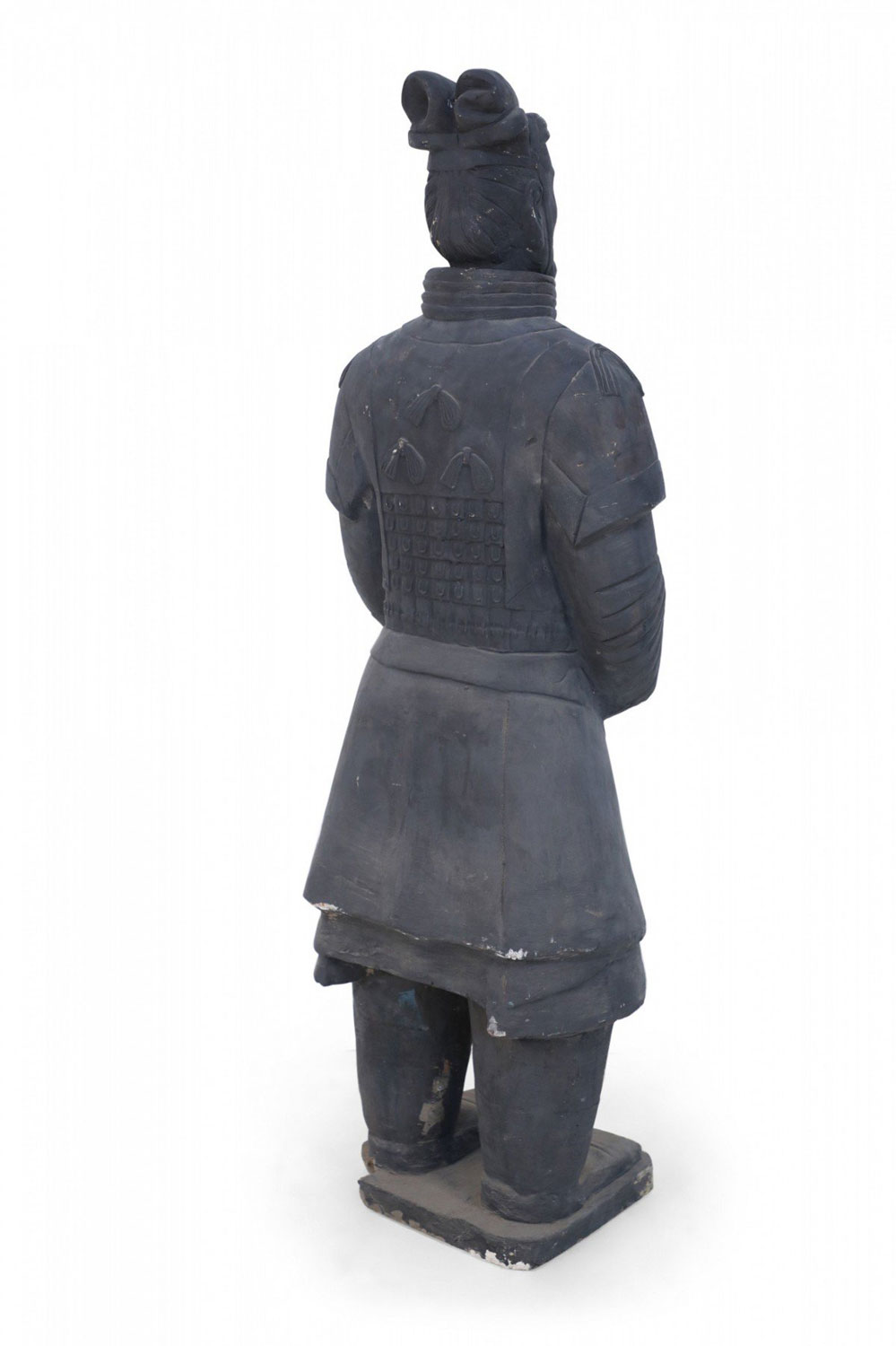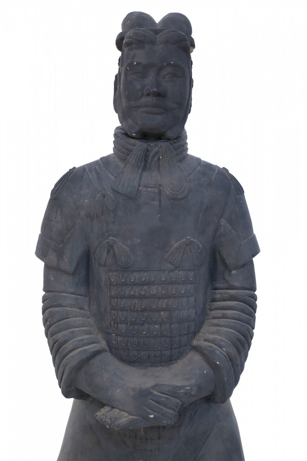 Chinese Qin Dynasty-style life-size terracotta soldier statue standing with hands clasped on a rectangular base. (Head is removable)(Companion piece: NWL2501)