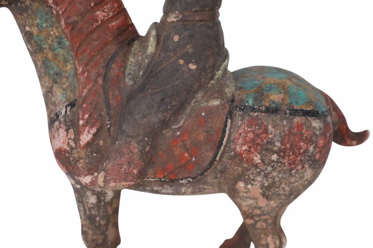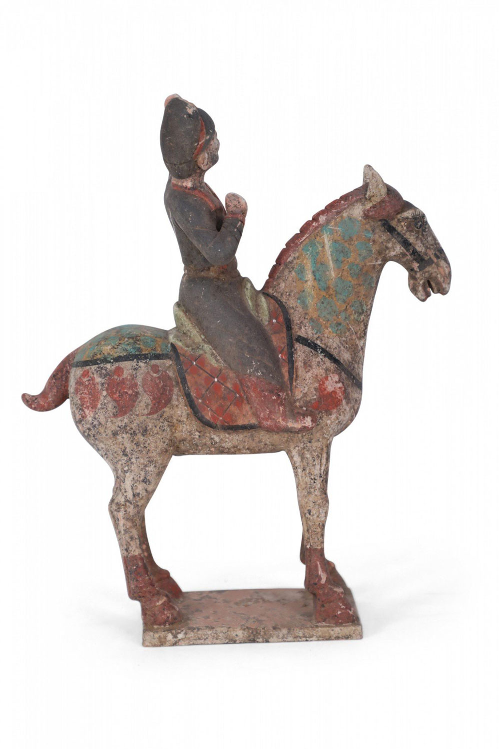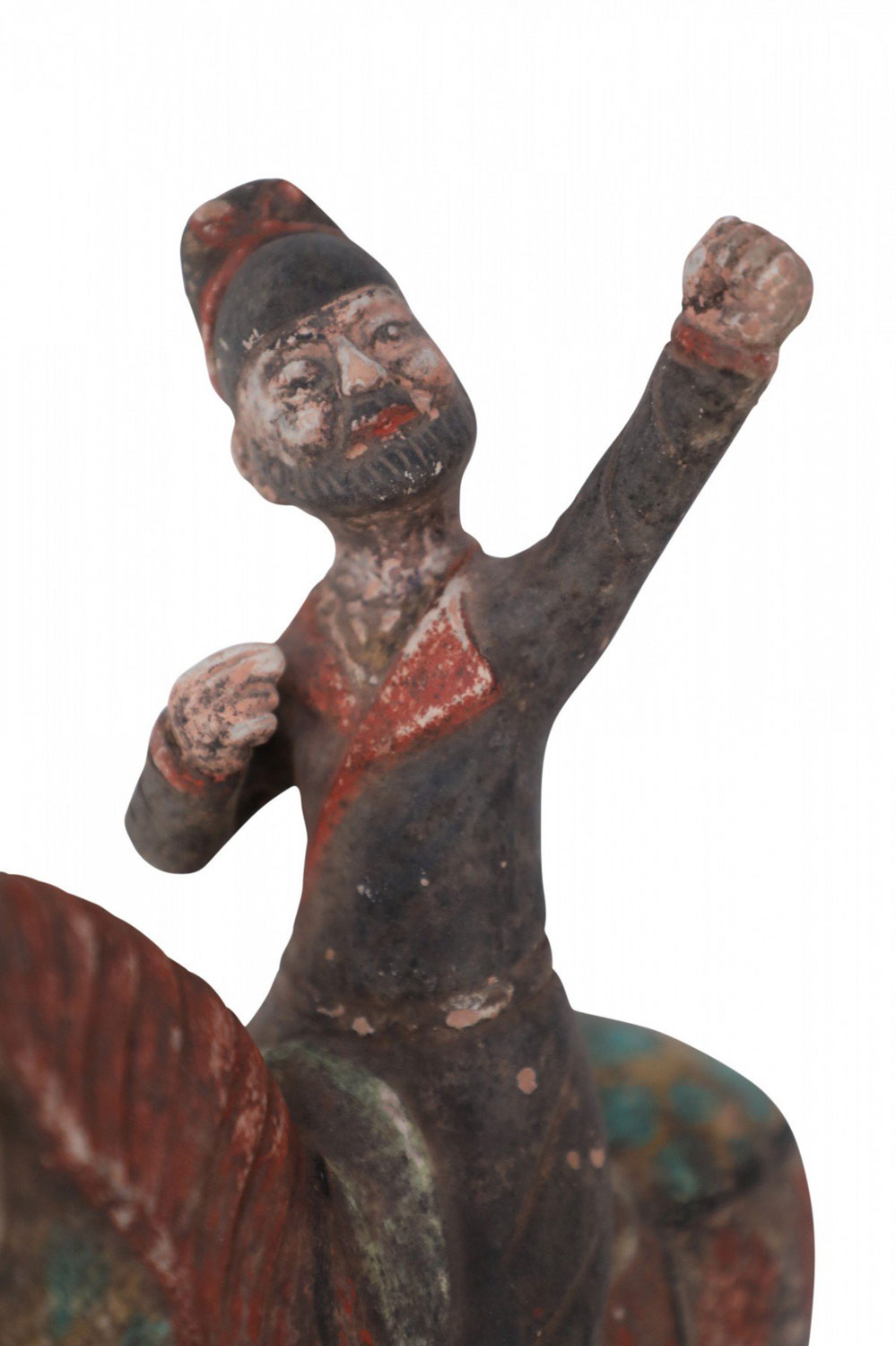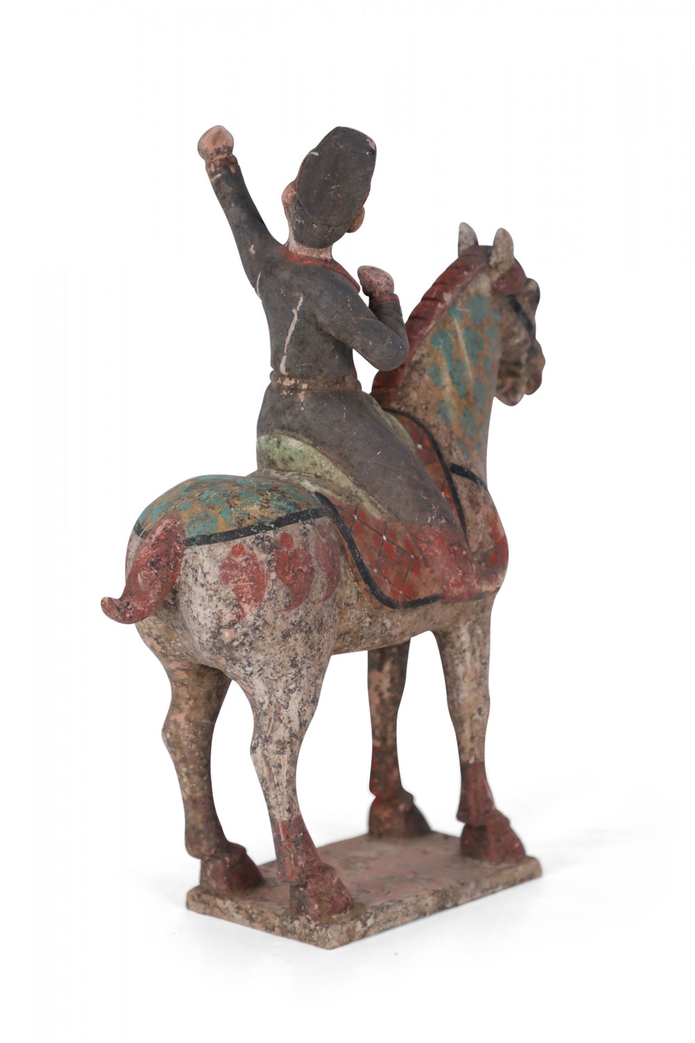 Antique Chinese Tang Dynasty-style terra cotta tomb figure of a man dressed in dark gray robes, with one fist raised in the air, sitting atop a red saddle, on a horse that is painted with blue dots, and standing on a square base (Companion Piece: NWL2556).