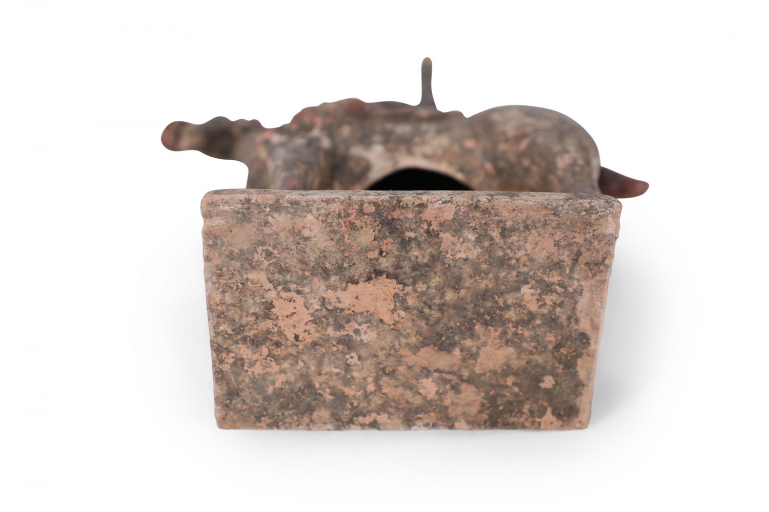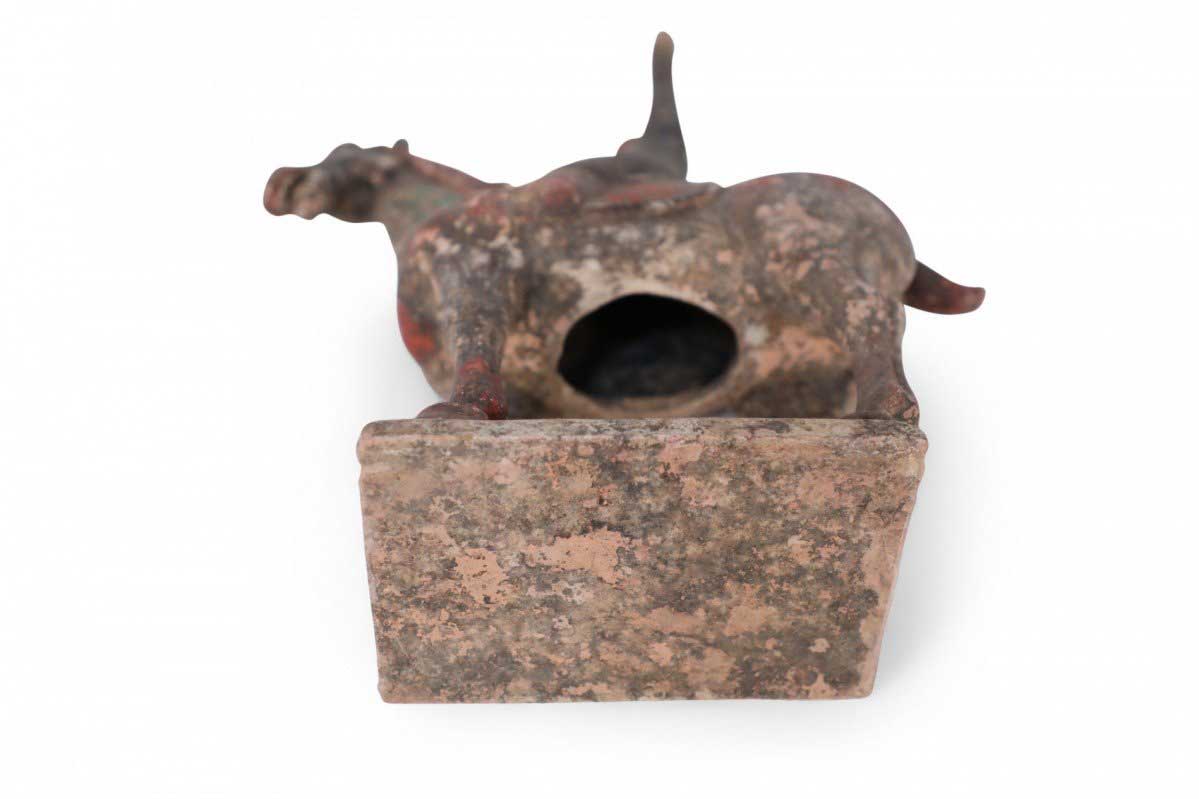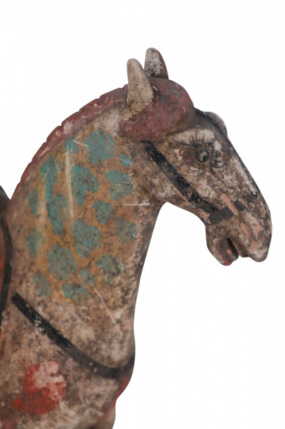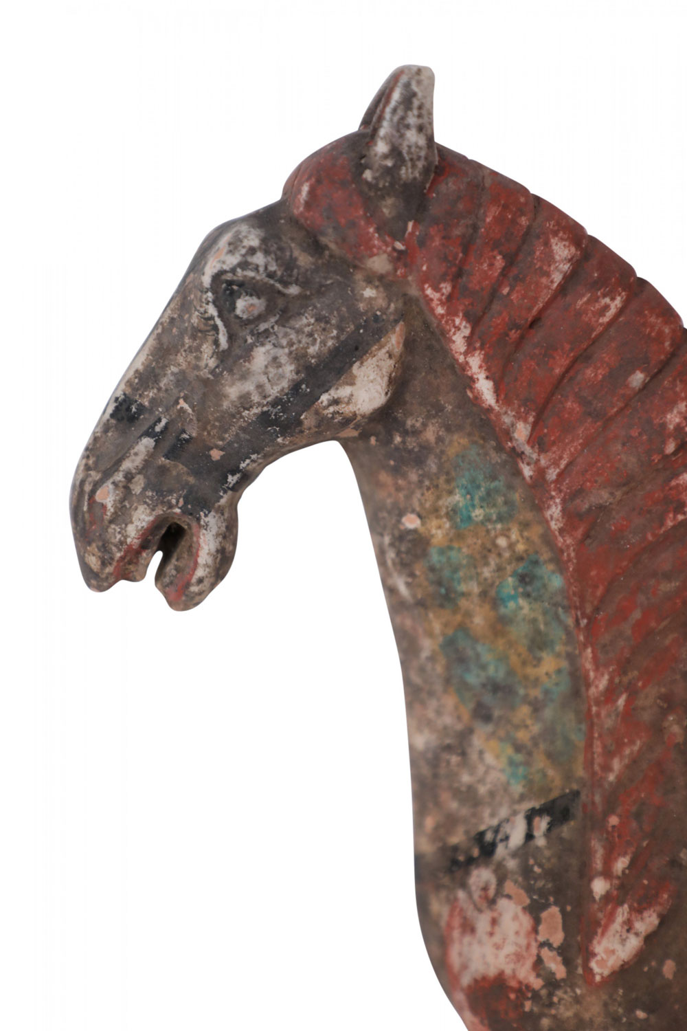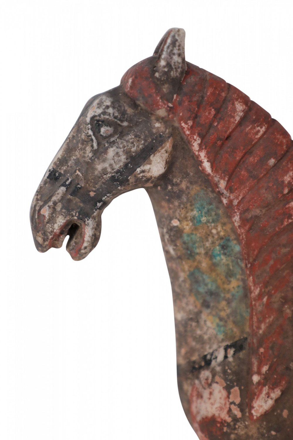 Antique Chinese Tang Dynasty-style terra cotta tomb figure of a man dressed in dark gray robes, with one fist raised in the air, sitting atop a red saddle, on a horse that is painted with blue dots, and standing on a square base (Companion Piece: NWL2556).
