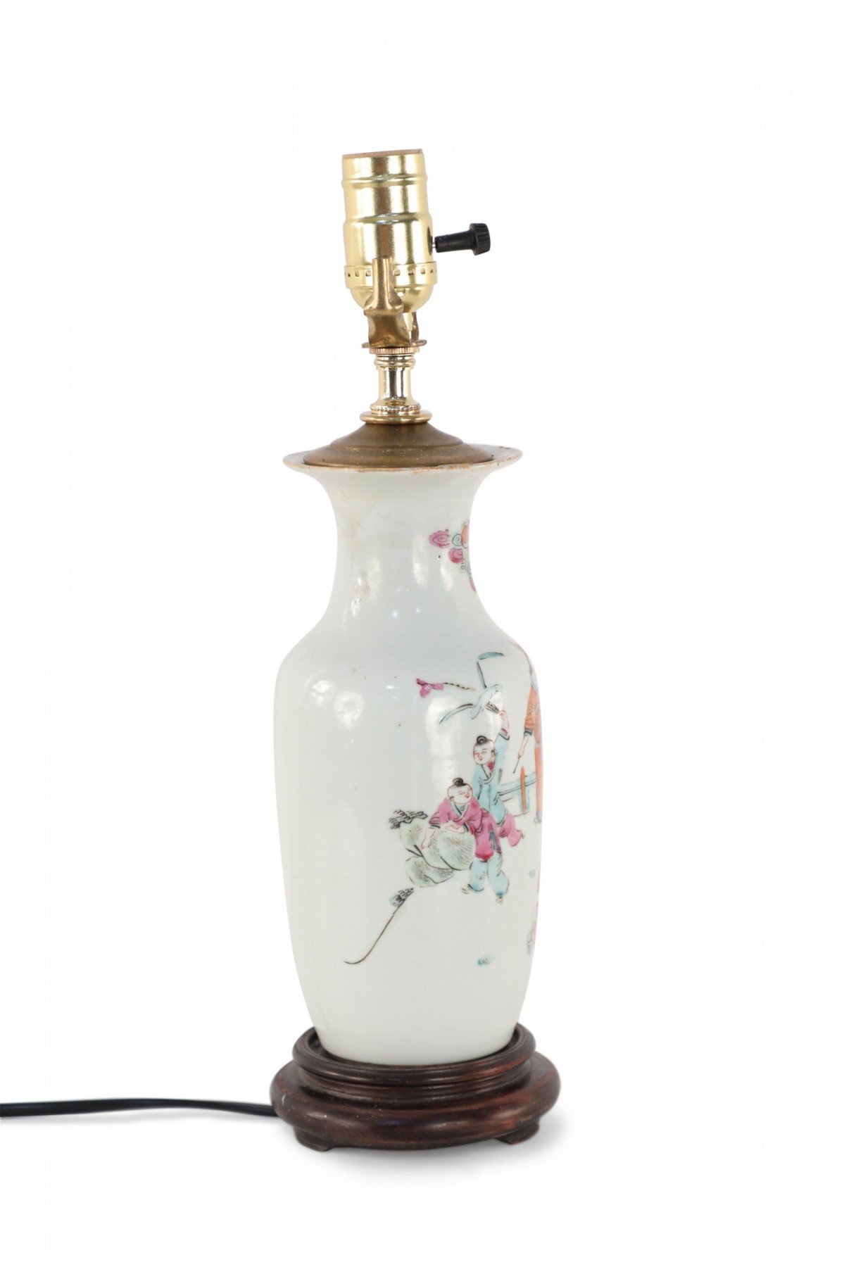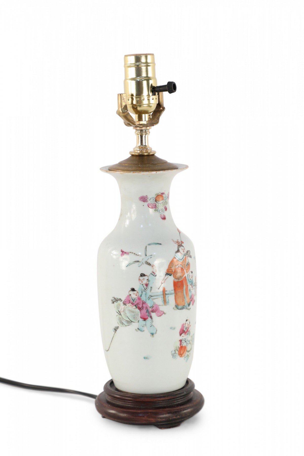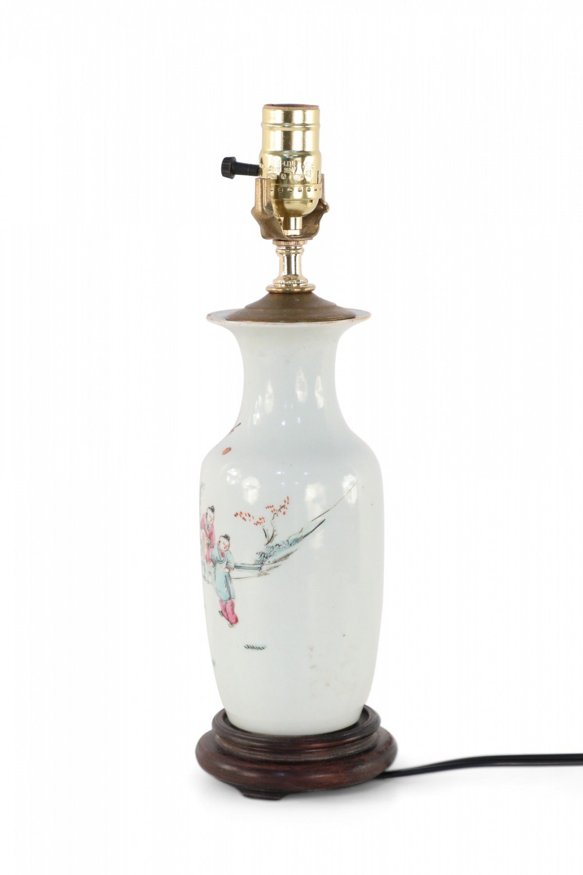 Antique Chinese (Early 20th Century) table lamp made from a white porcelain urn painted with a scene of children playing in orange, pink, and red, mounted on a brown wooden base and fitted with brass hardware.