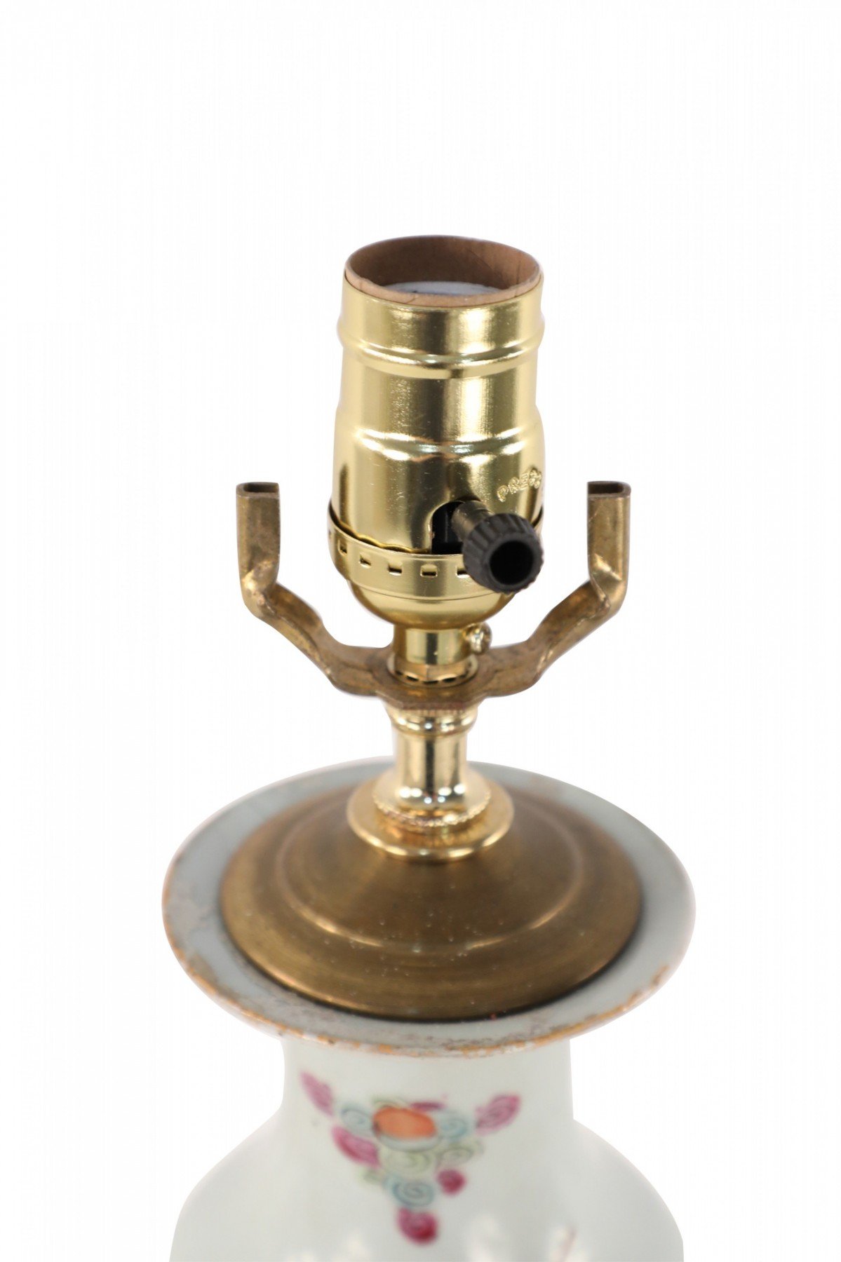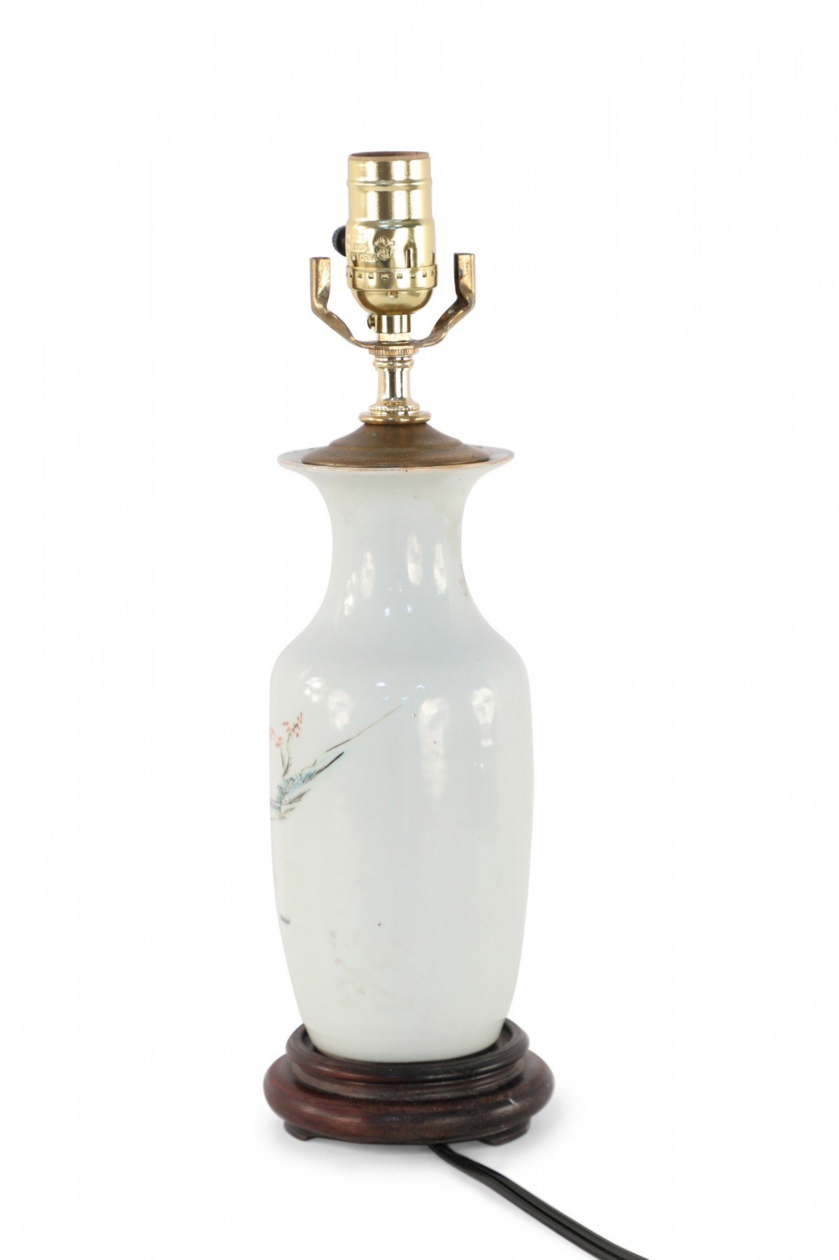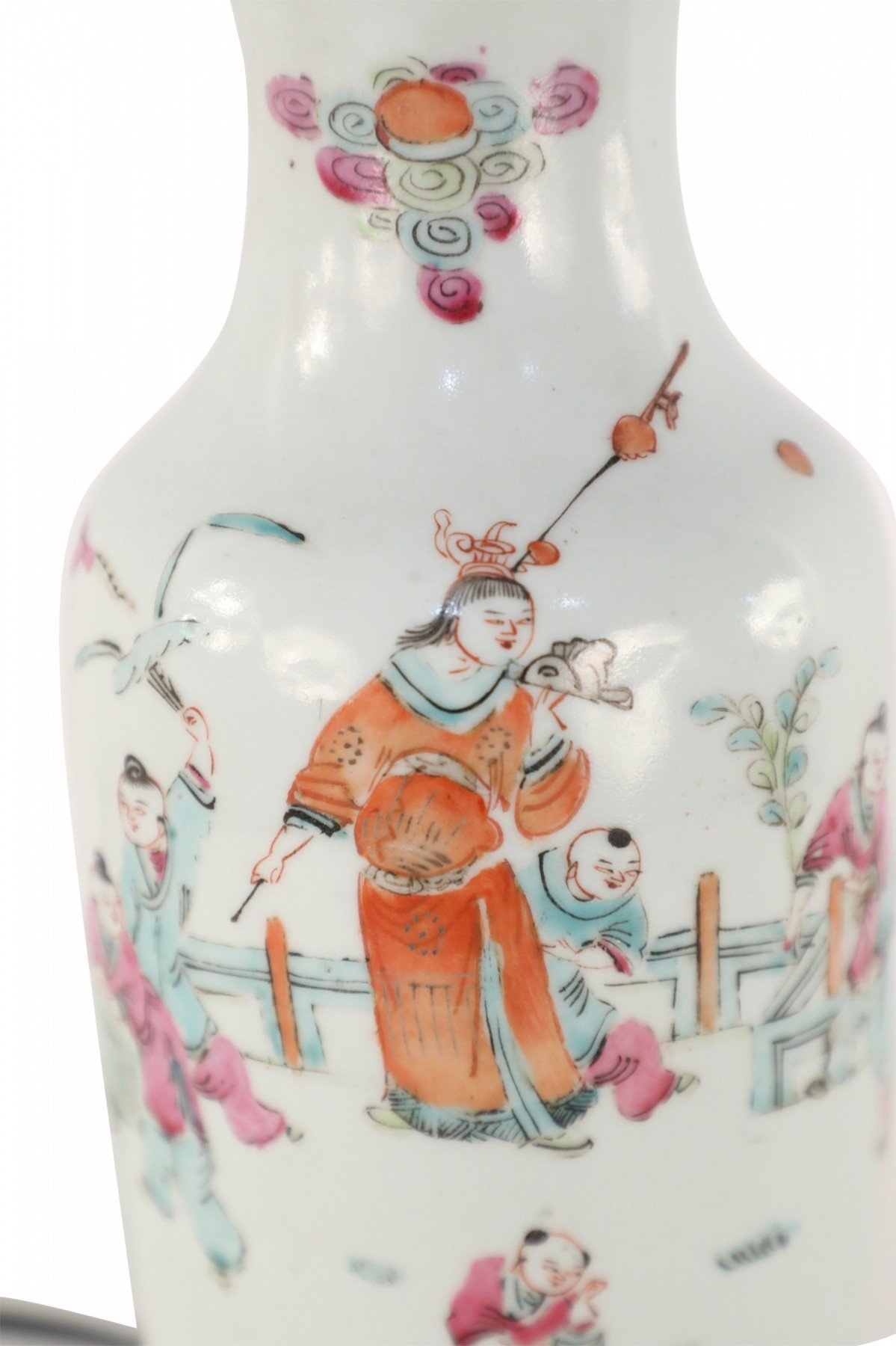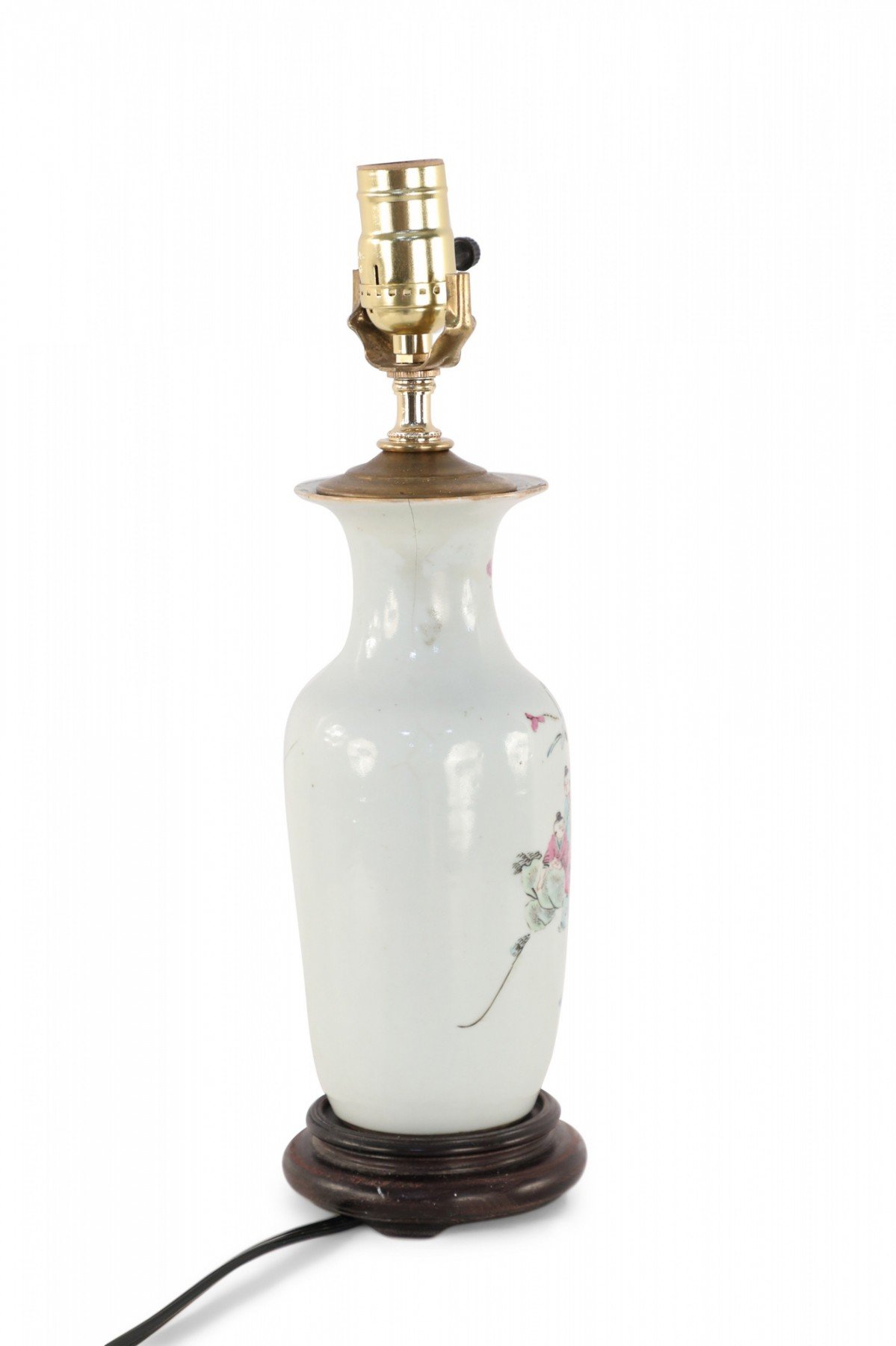 Antique Chinese (Early 20th Century) table lamp made from a white porcelain urn painted with a scene of children playing in orange, pink, and red, mounted on a brown wooden base and fitted with brass hardware.