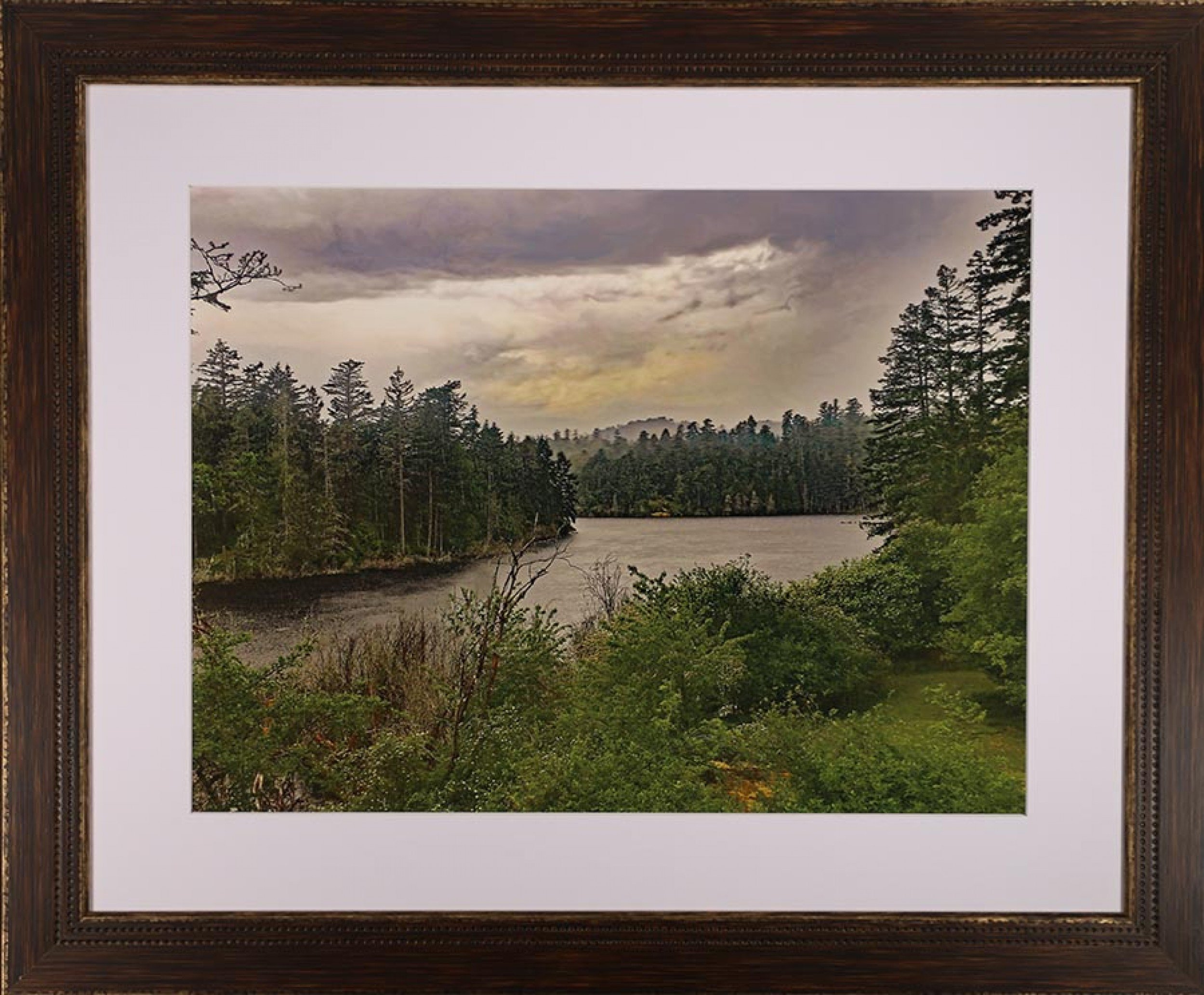 Contemporary color photograph of Pike Lake with surrounding forest trees and a rainy sky in a white mat and a distressed brown rectangular wooden frame.