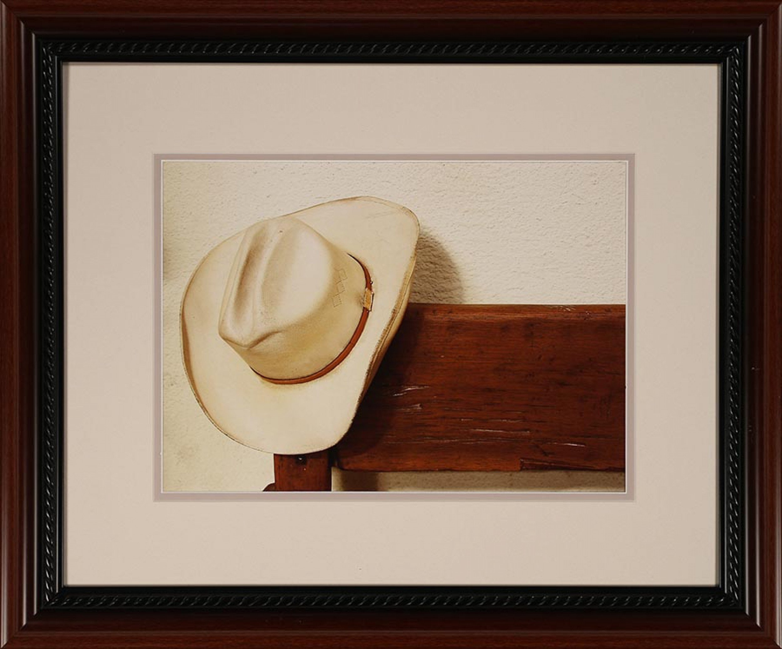 Contemporary color photograph of a white cowboy hat on a chair in a white double mat and rectangular cherry wood frame.