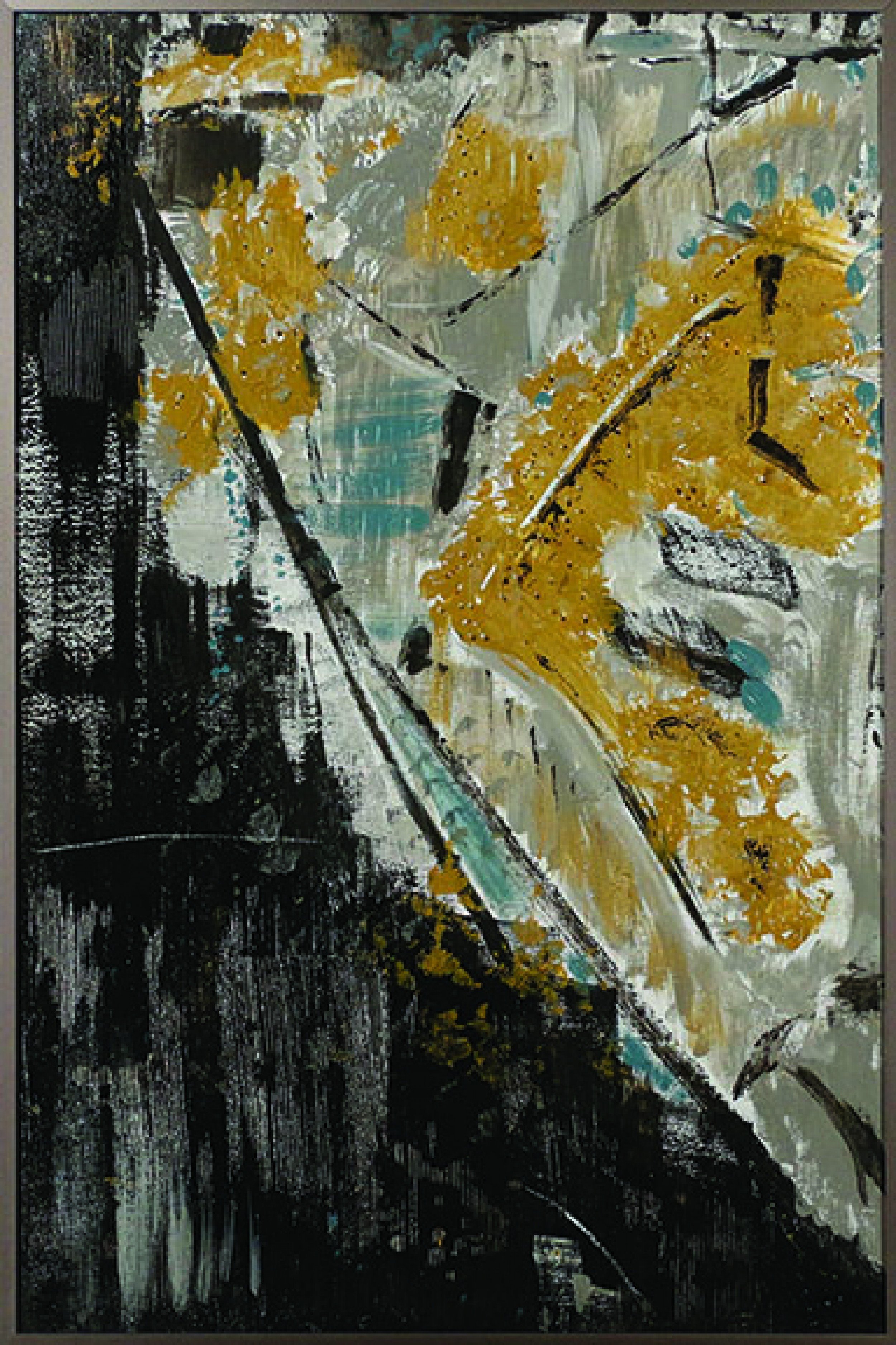 Contemporary print of an abstract acrylic painting in black and yellow on canvas in a rectangular thin gray metal frame.
