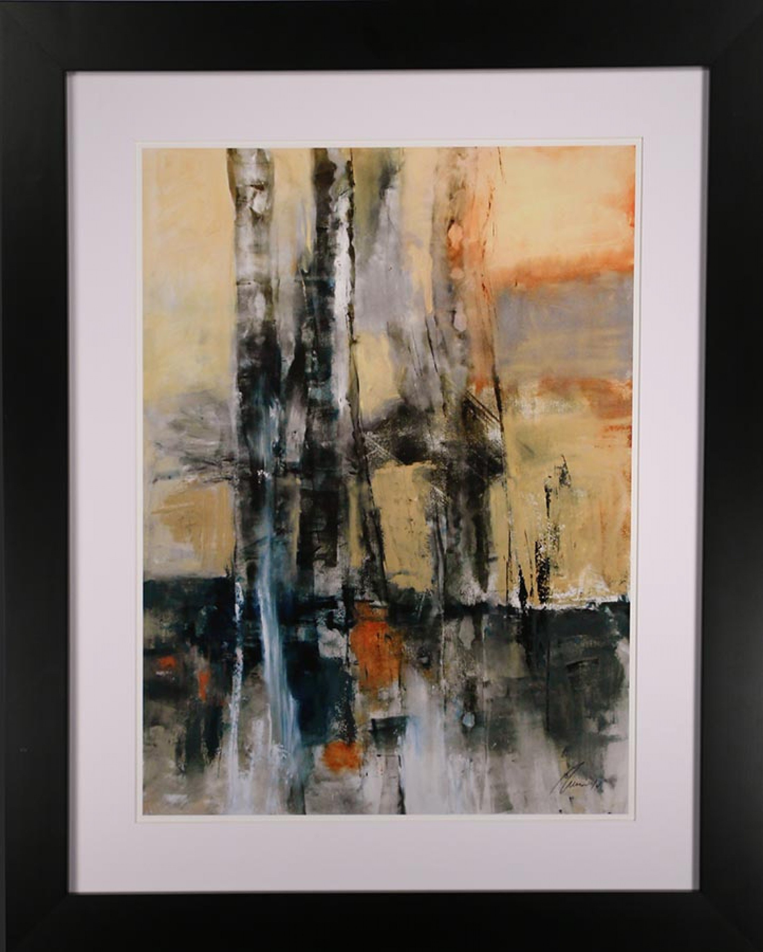 Contemporary print of an abstract acrylic painting in black and yellow in a rectangular cherry wooden frame and white double mat.