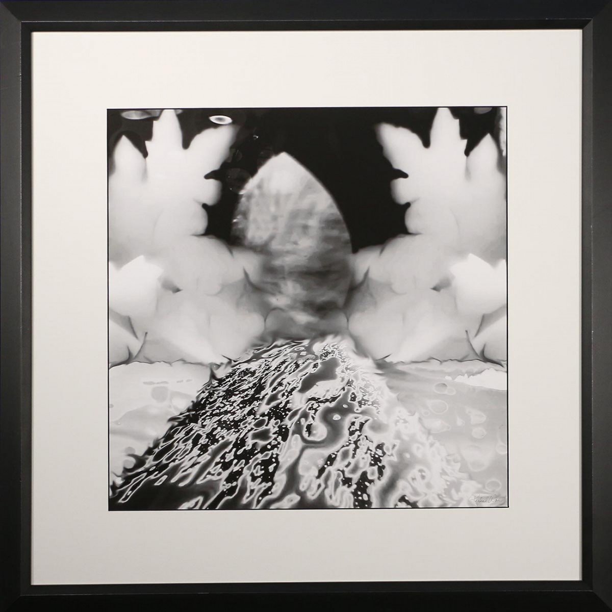 Contemporary print of an abstract black and white photograph of watery shapes in a square black wooden frame and white double mat. (Companion piece: NWL500)