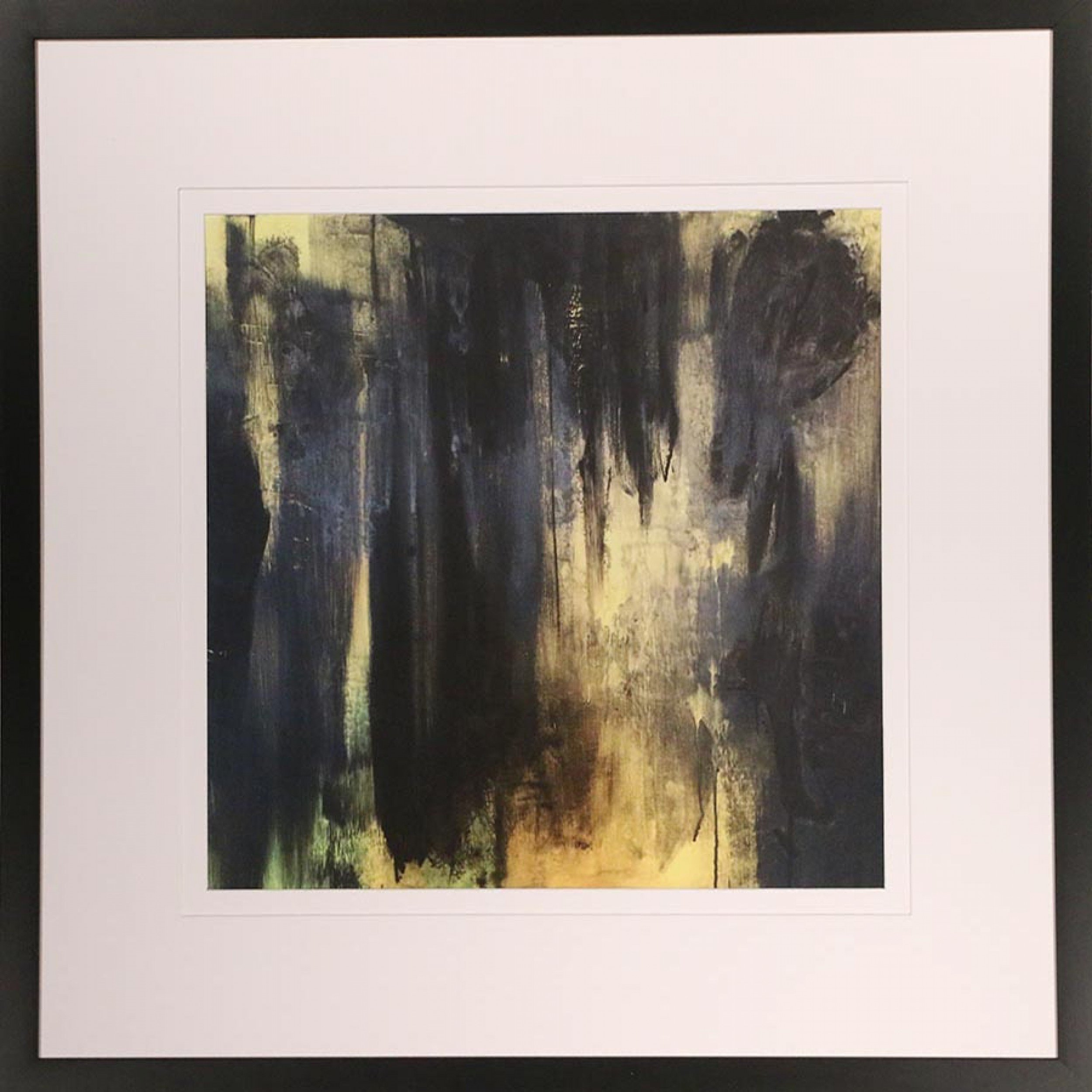 Contemporary print of an abstract painting in black and gold on paper in a white double mat and a square, black wooden frame.