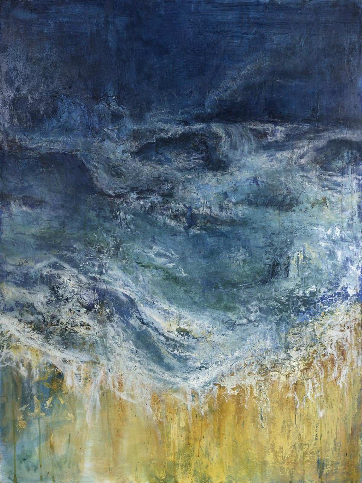 Contemporary canvas print of an abstract painting featuring ocean waves by a beach in a gold wooden frame. (Frameless version available: NWL127)