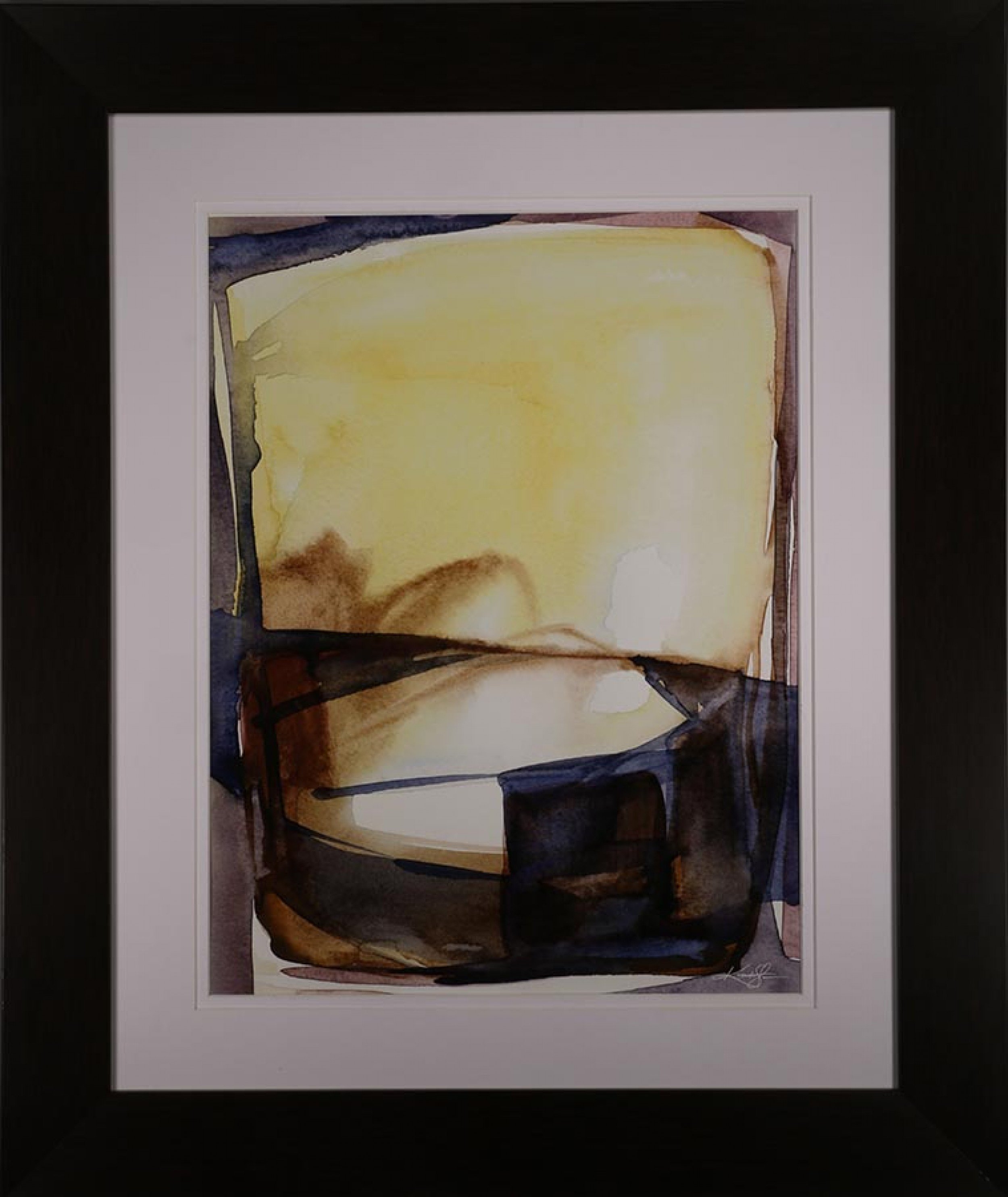 Contemporary print of an abstract watercolor painting in brown and gold in a rectangular dark brown wooden frame and white double mat.