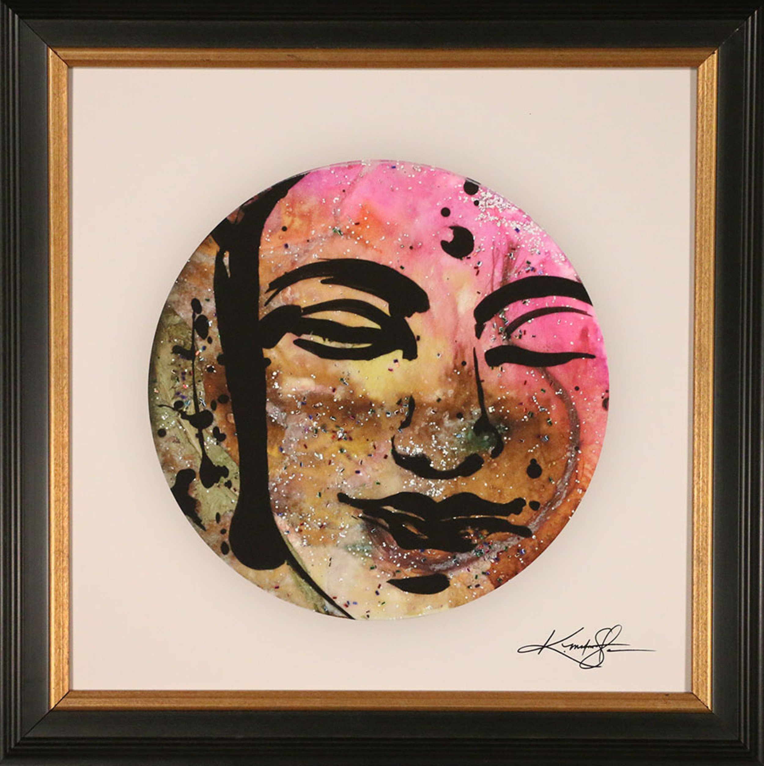 Contemporary print of an abstract watercolor painting featuring Buddha in a pink and yellow circle in a square black and gold wooden frame.
