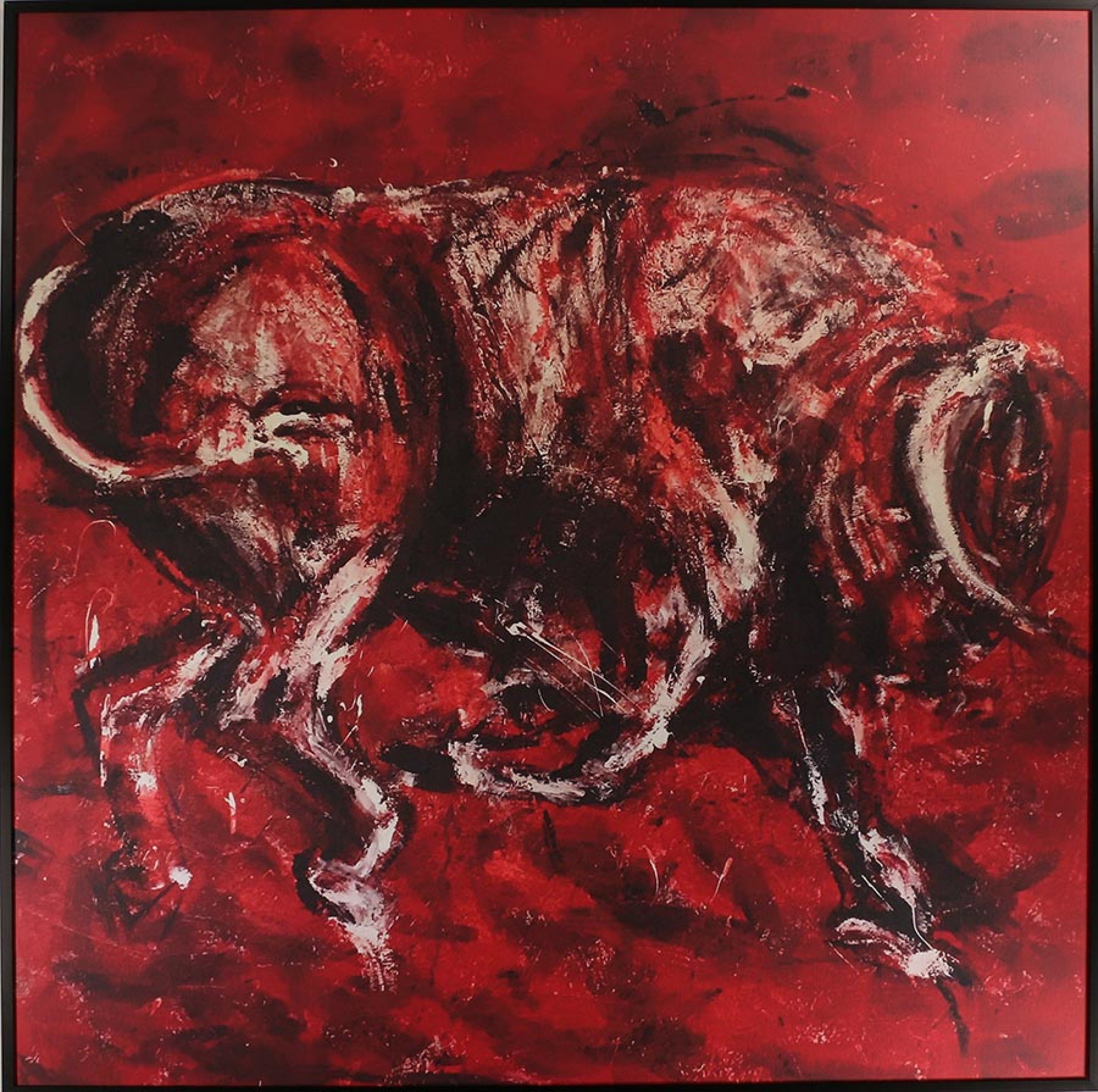 Contemporary canvas print of an acrylic painting featuring a bull rendered in red and black tones in a square thin black metal frame.