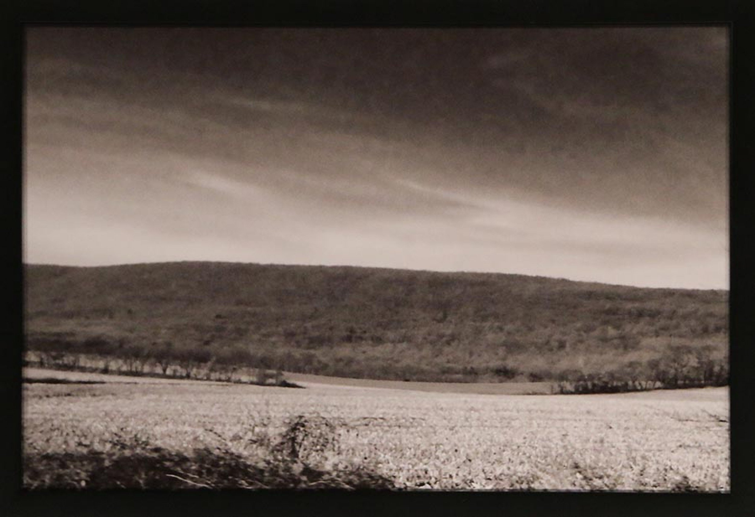 Contemporary print of a black and white photograph of a stormy field in a rectangular black wooden frame.