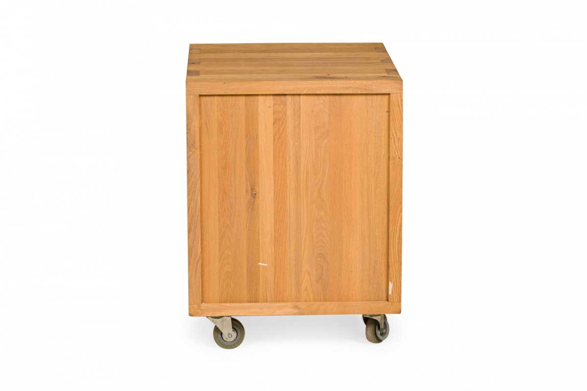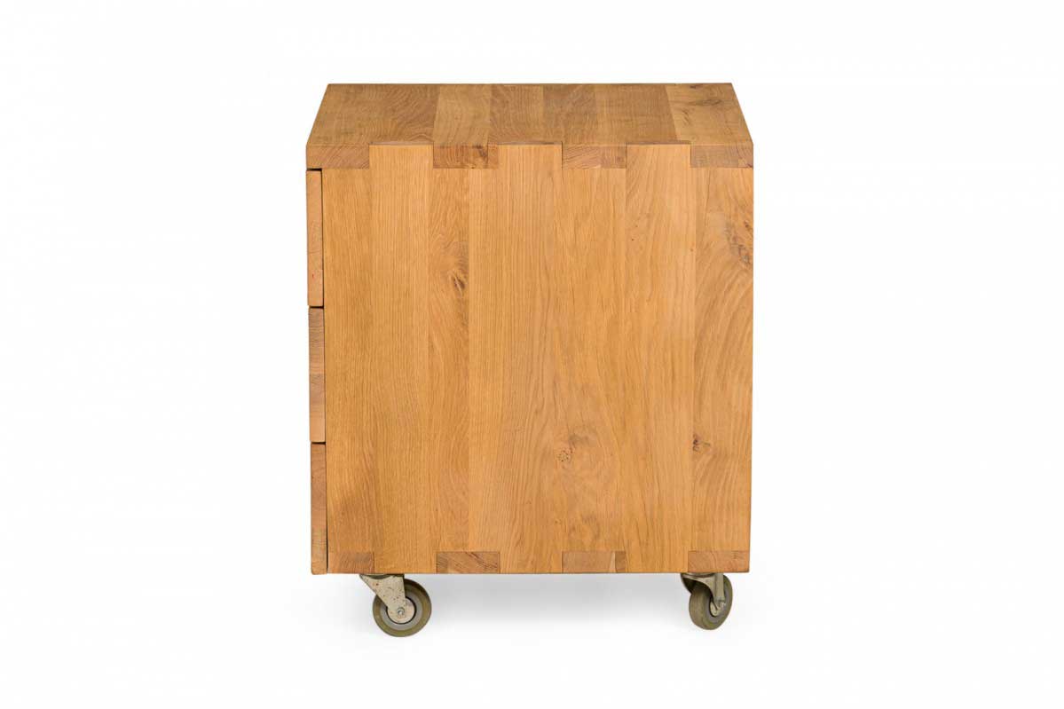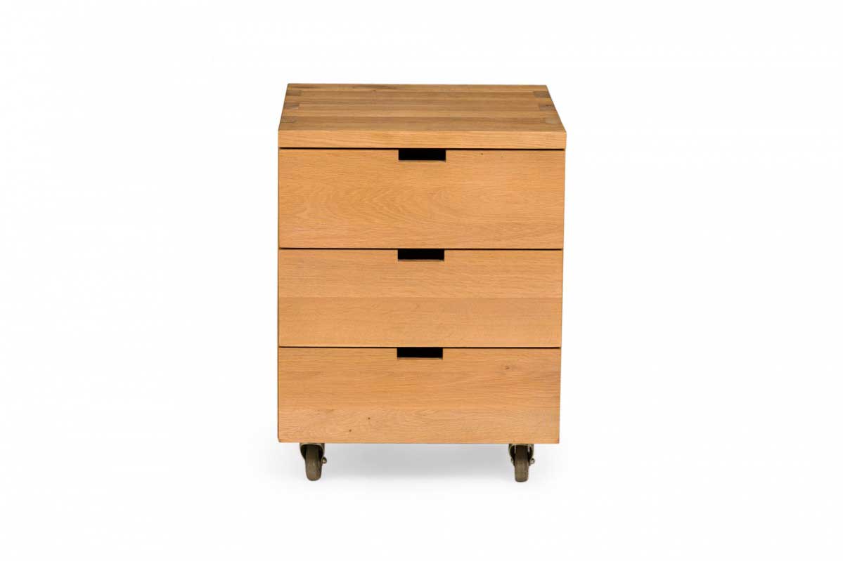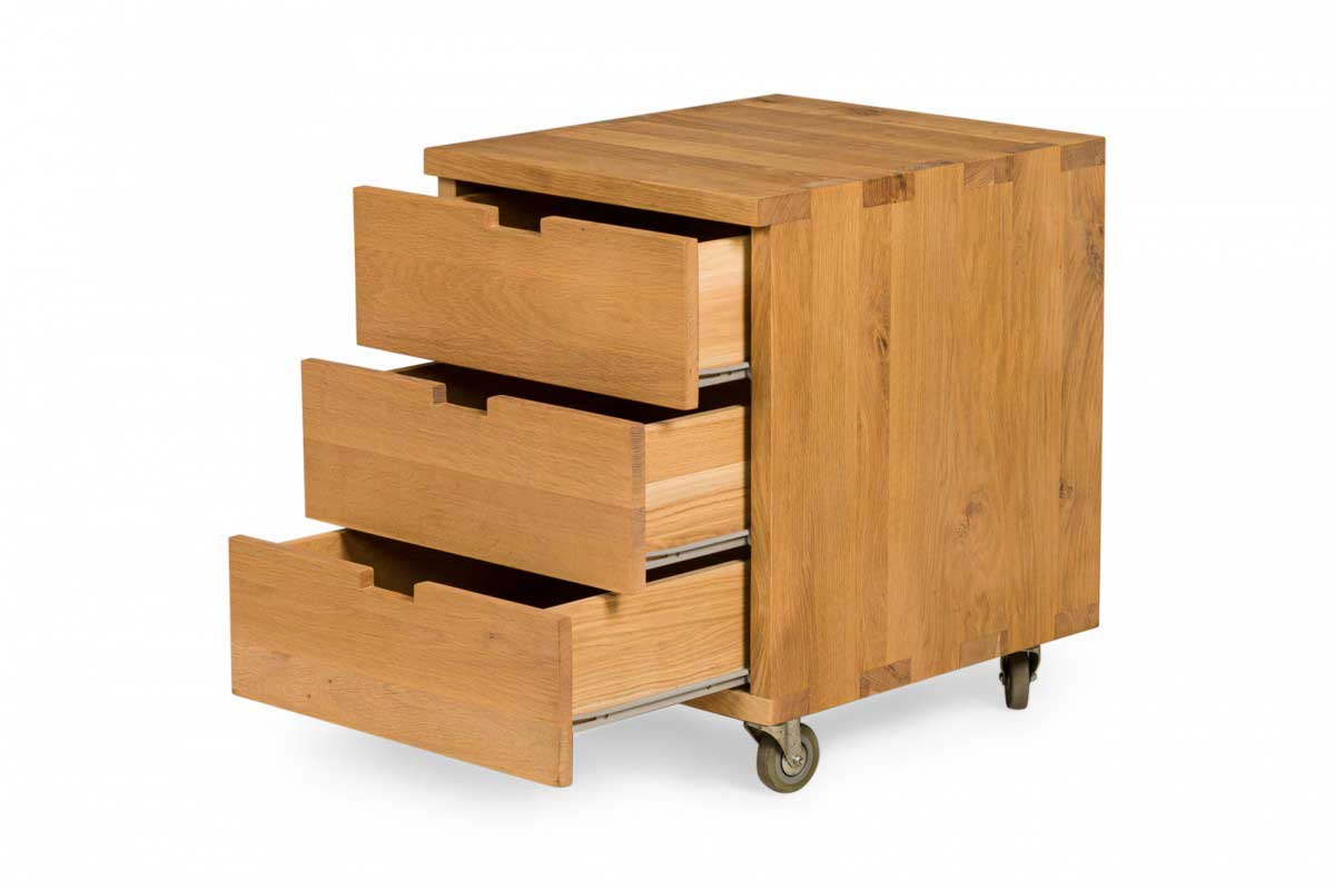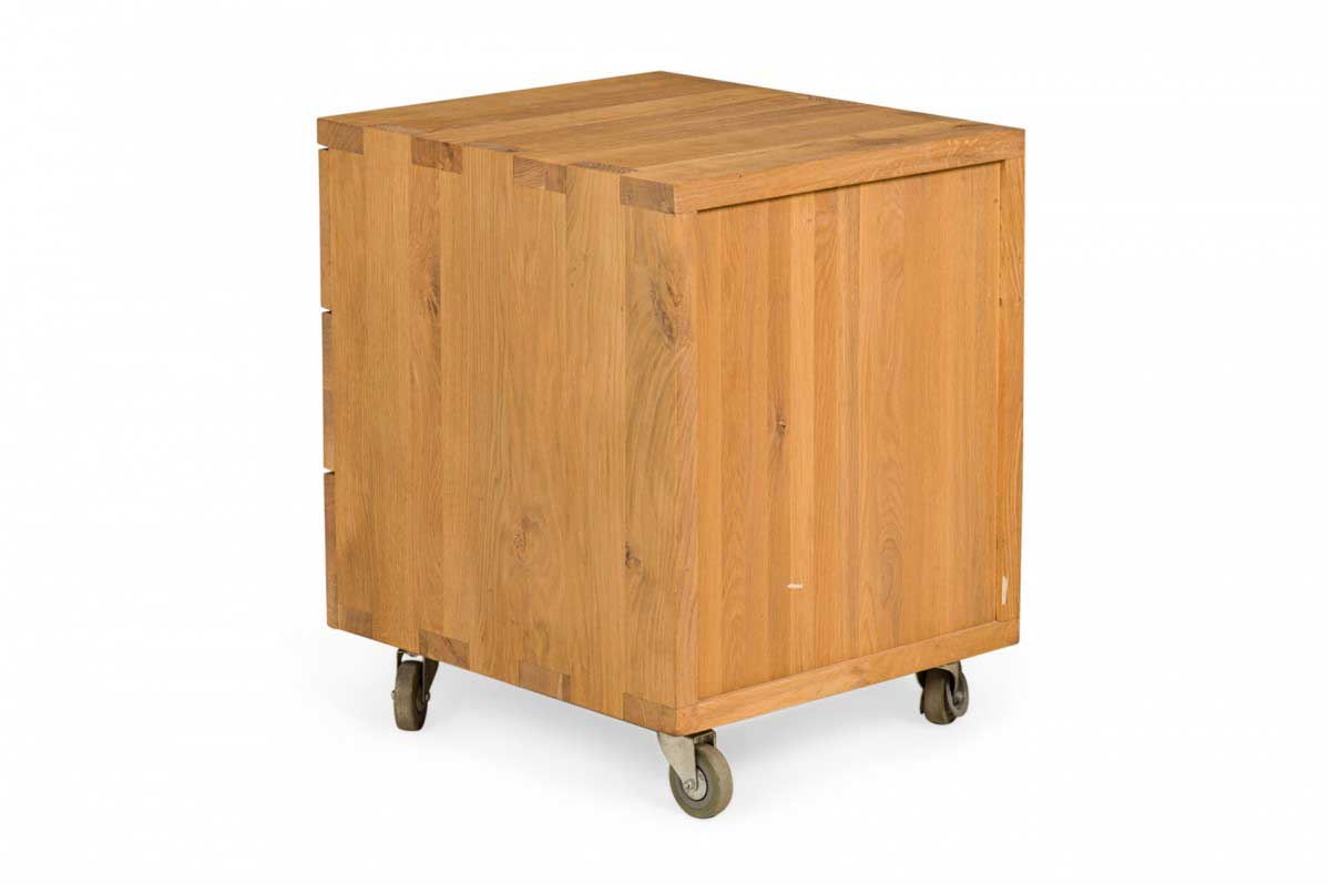 Contemporary desk and tabouret set comprised of a bracket-form raw oak desk with dovetailed joints and a matching three drawer raw oak tabouret, resting on four casters. (PRICED AS SET)