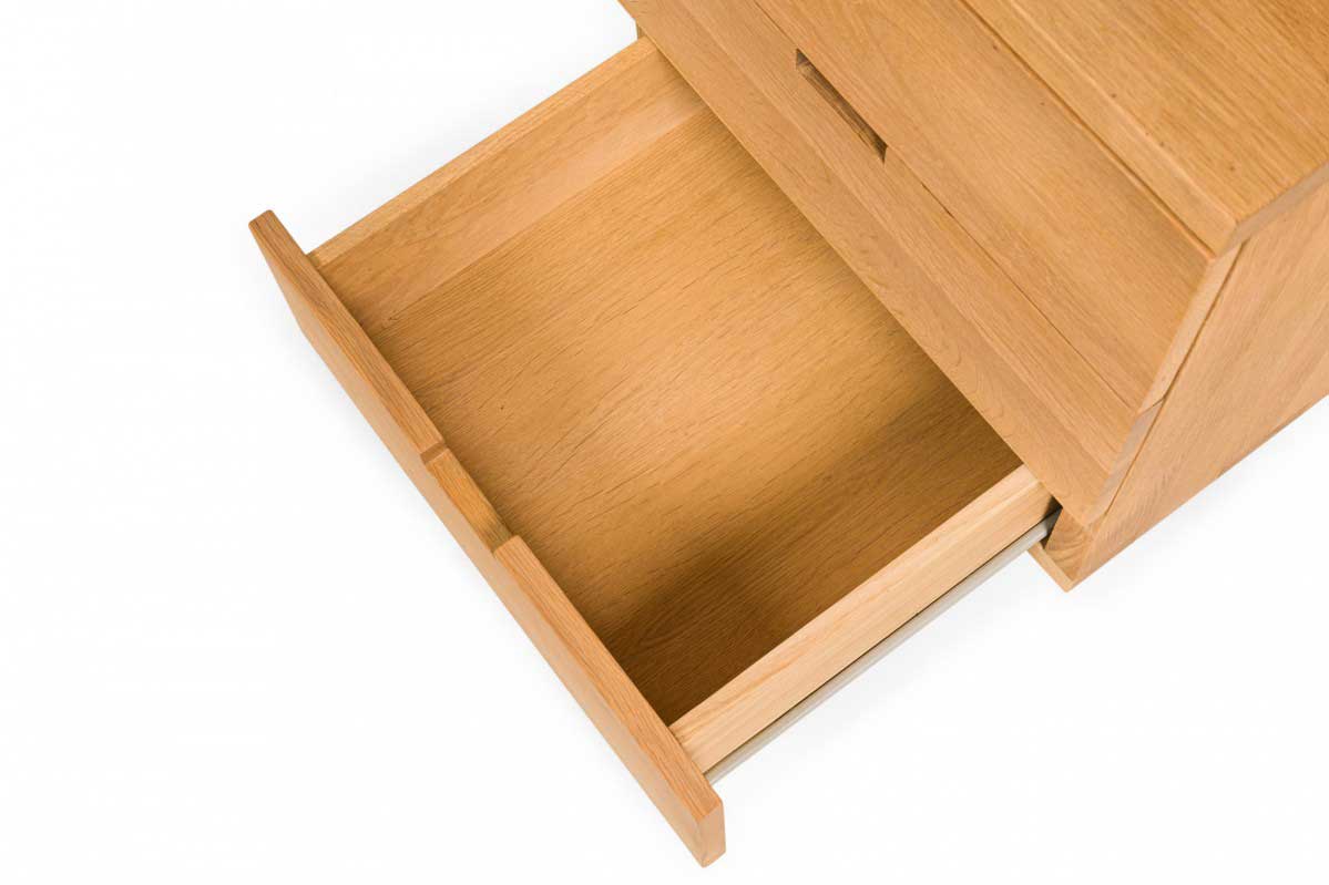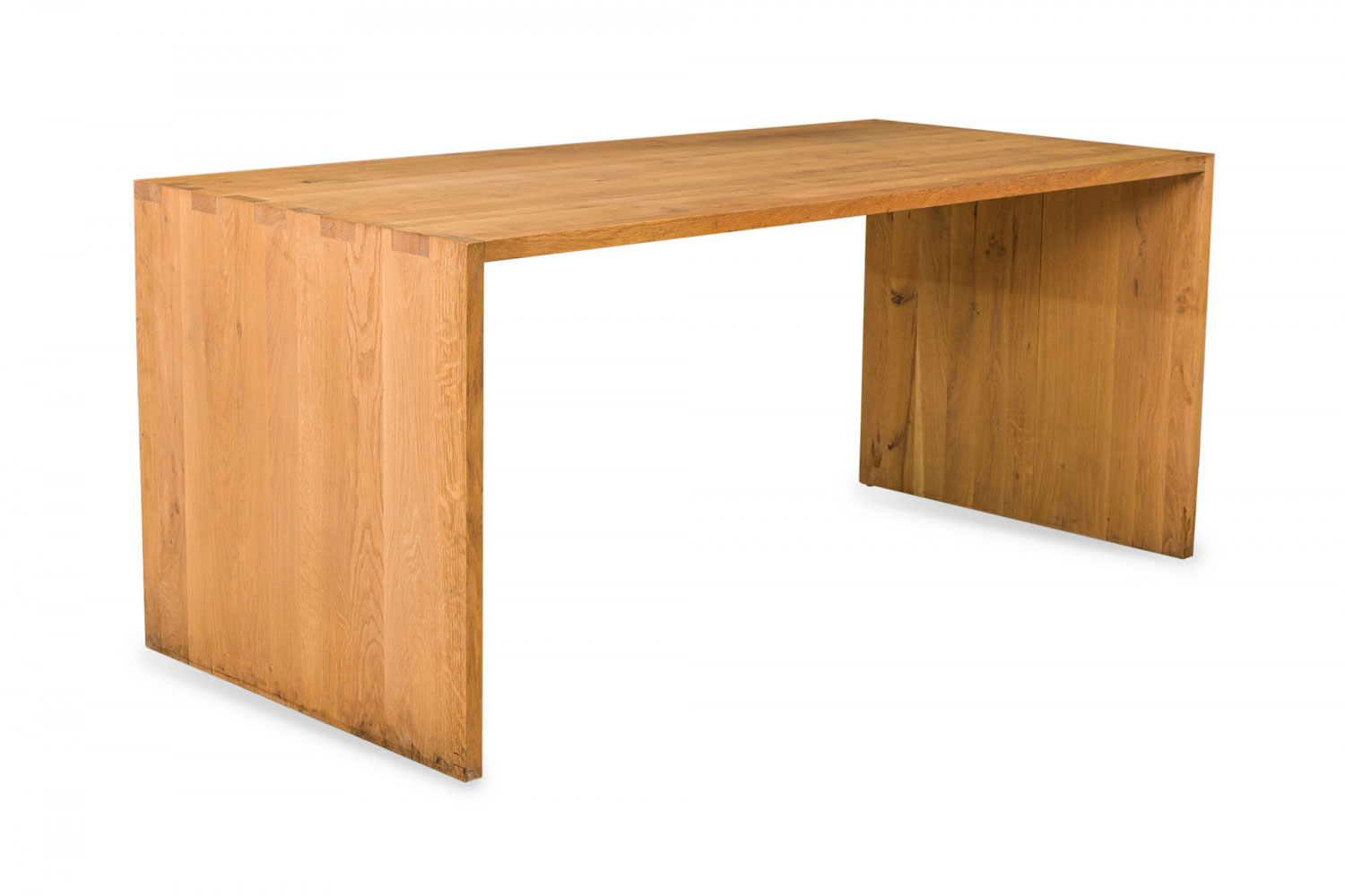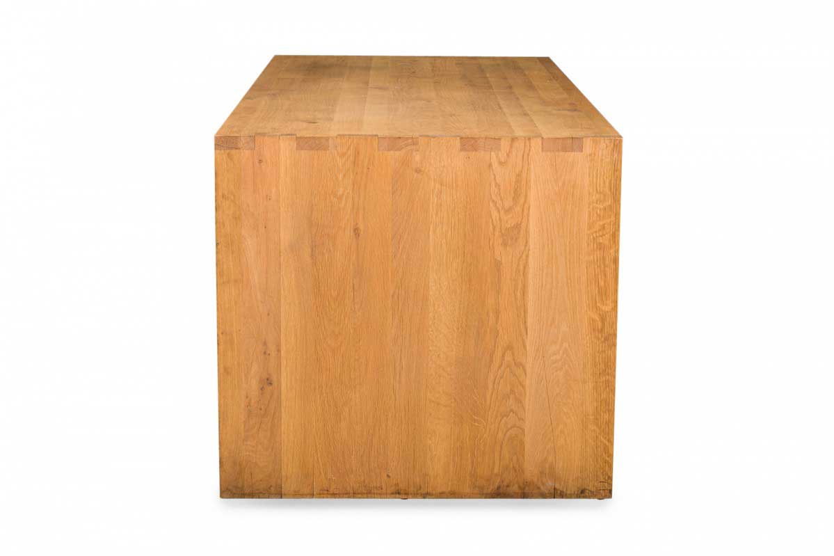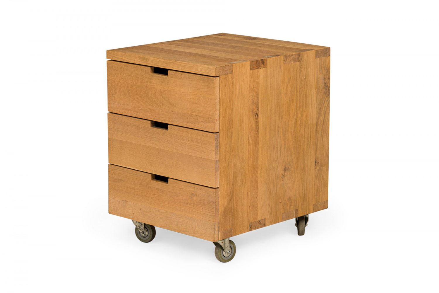 Contemporary desk and tabouret set comprised of a bracket-form raw oak desk with dovetailed joints and a matching three drawer raw oak tabouret, resting on four casters. (PRICED AS SET)