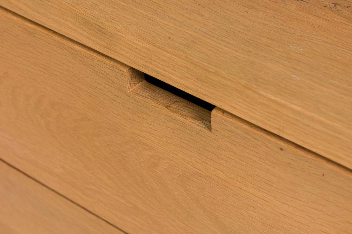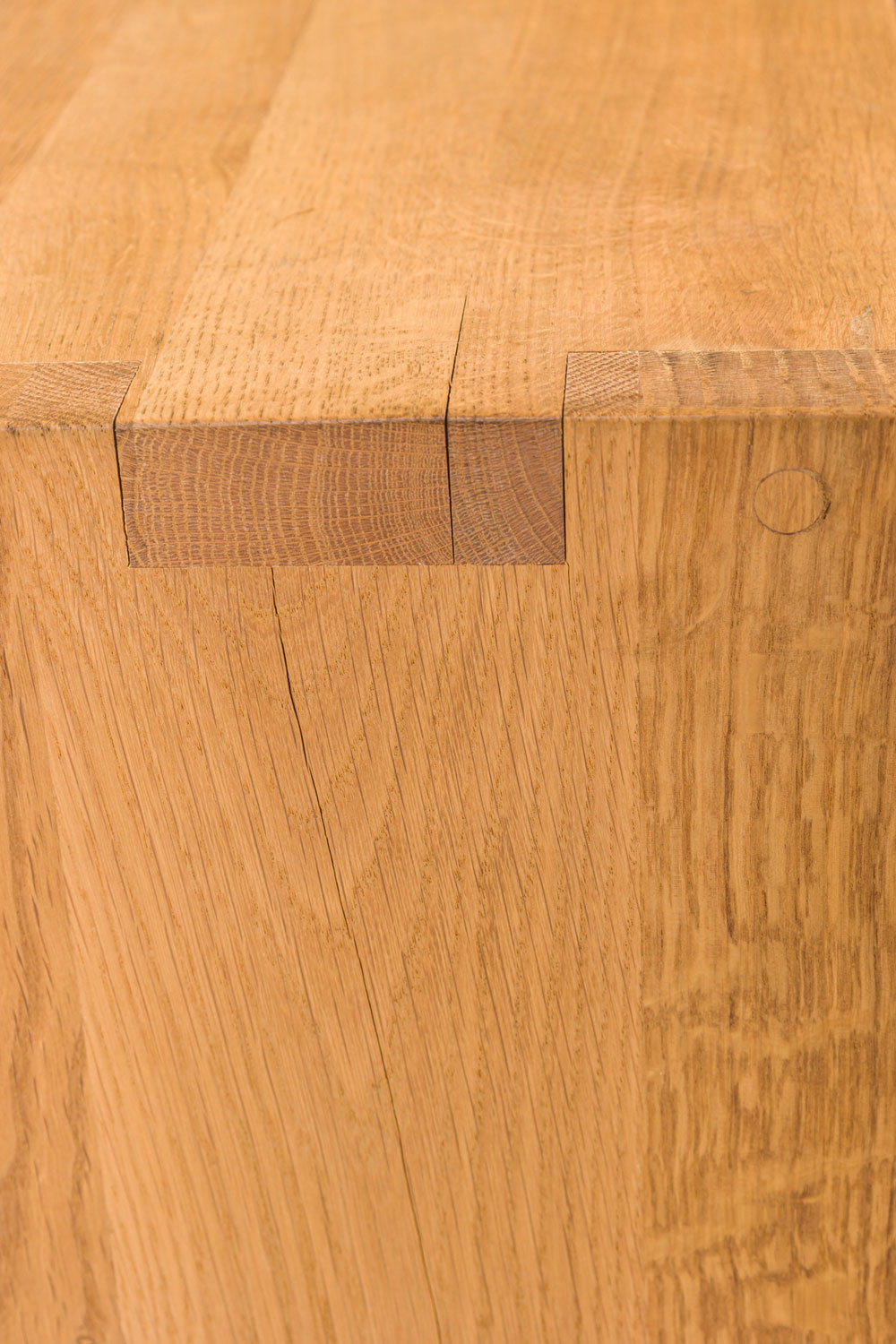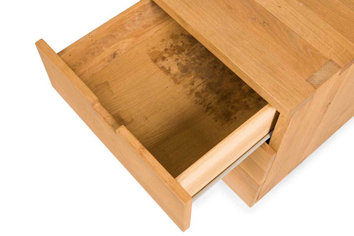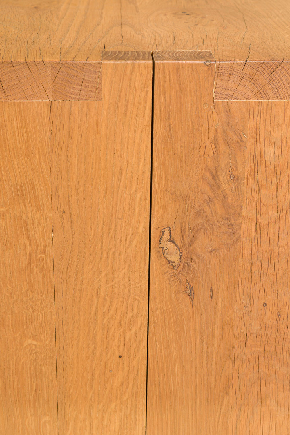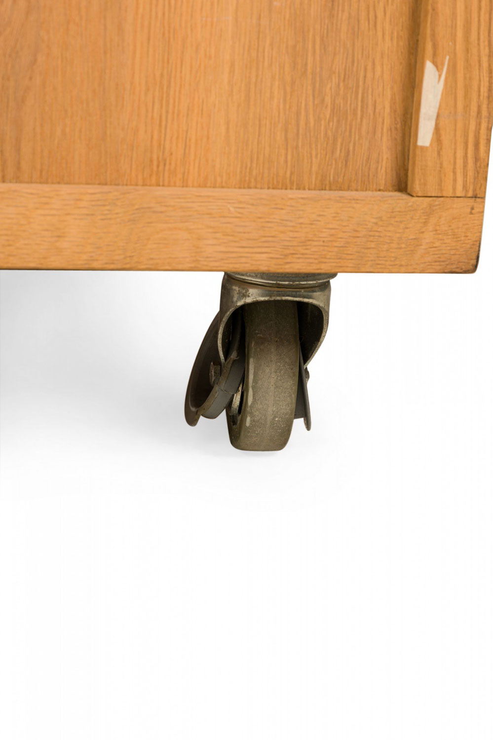 Contemporary desk and tabouret set comprised of a bracket-form raw oak desk with dovetailed joints and a matching three drawer raw oak tabouret, resting on four casters. (PRICED AS SET)