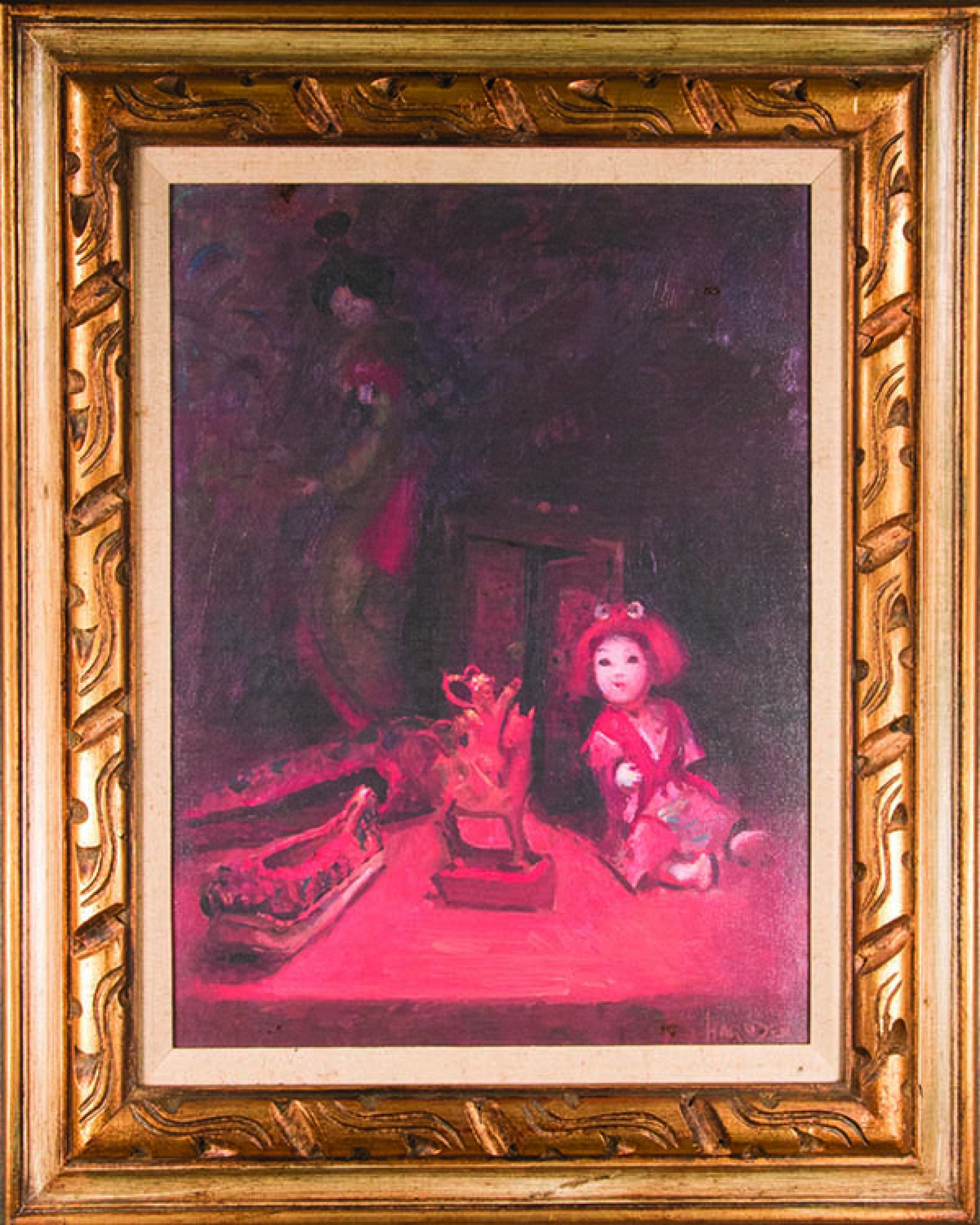 Contemporary canvas print of a still life painting in red tones of dolls and Chinoiserie objects in a carved antique gold rectangular wood frame with linen liner.