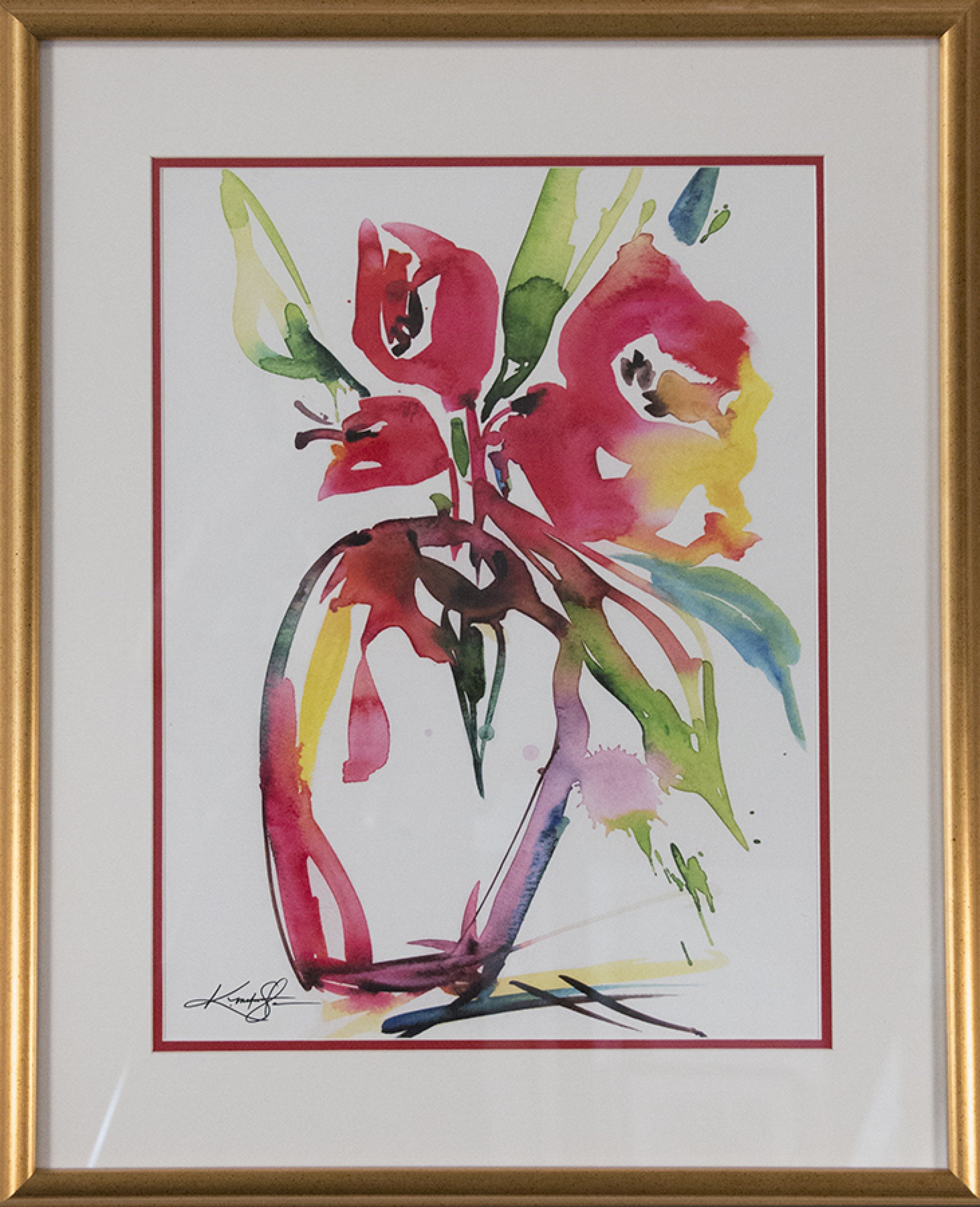 Contemporary print of a still life watercolor painting of a vase of multicolored flowers in a rectangular golden frame with a beige double mat.