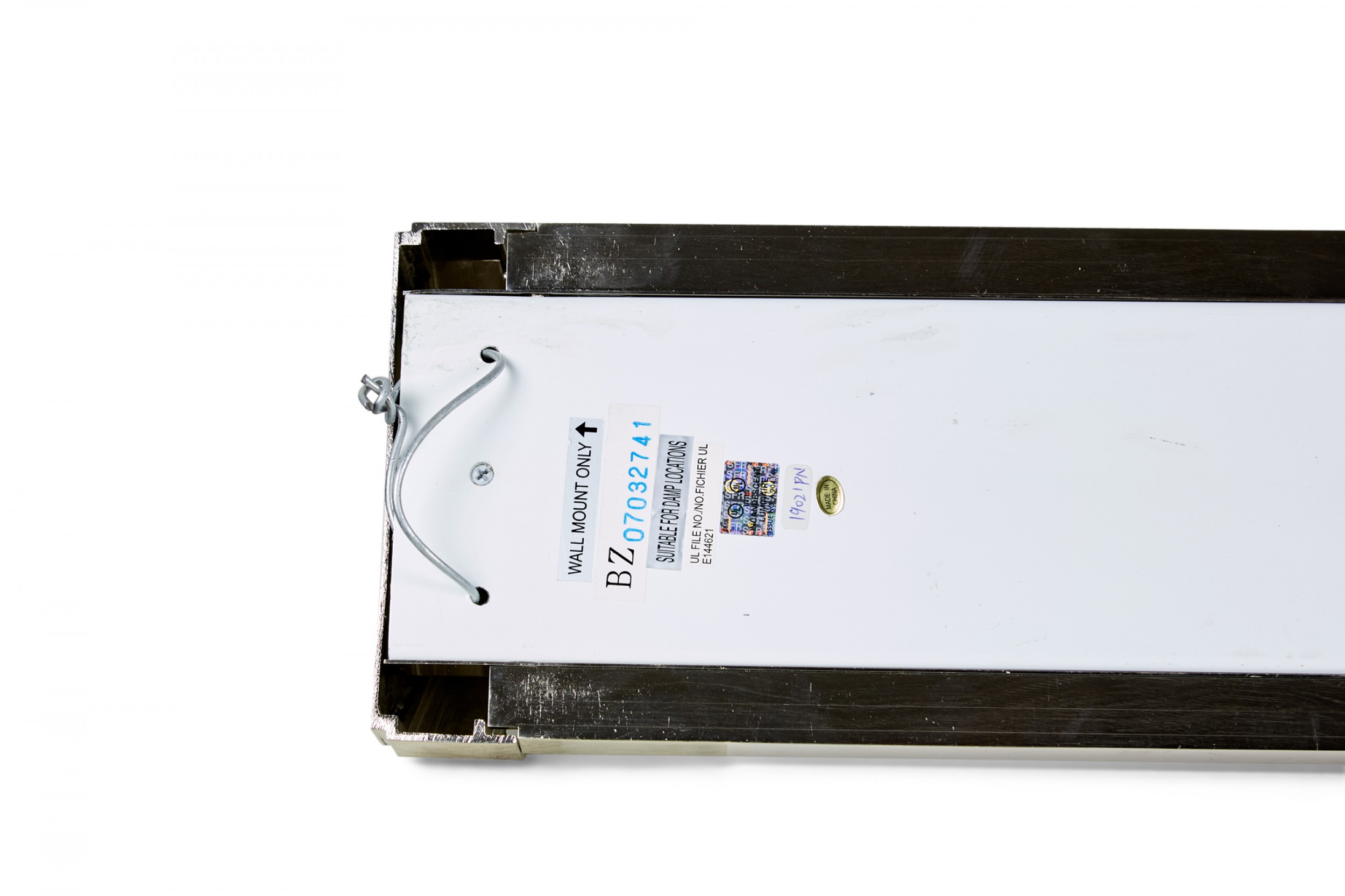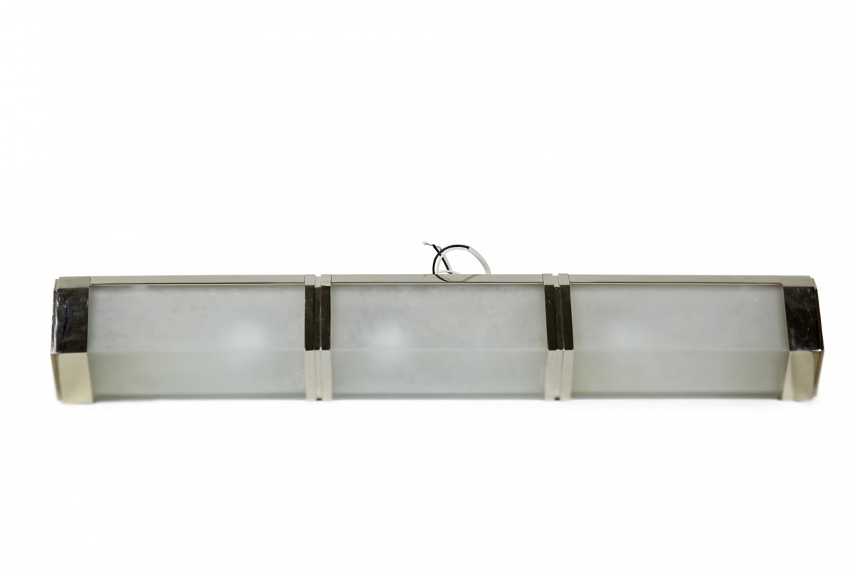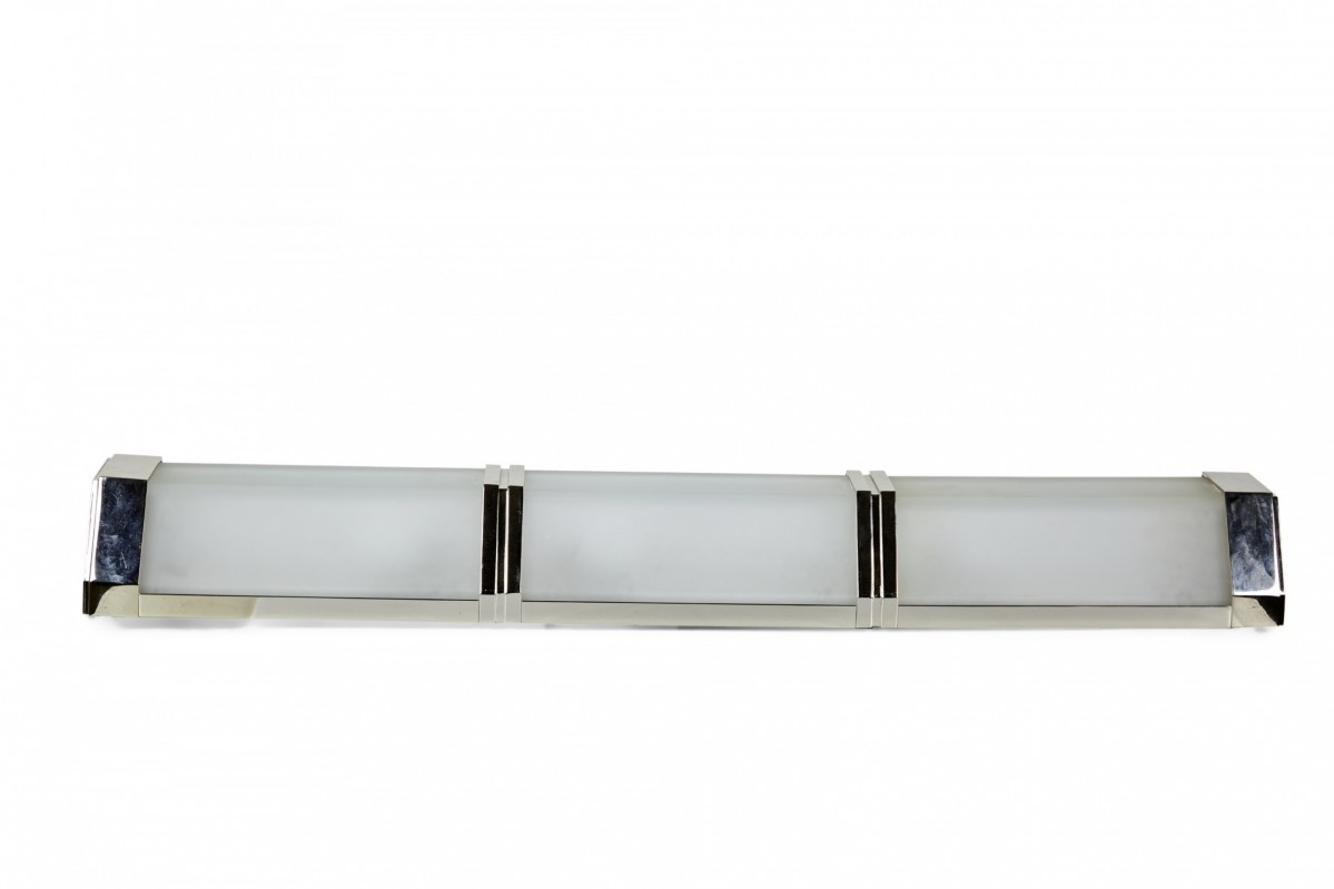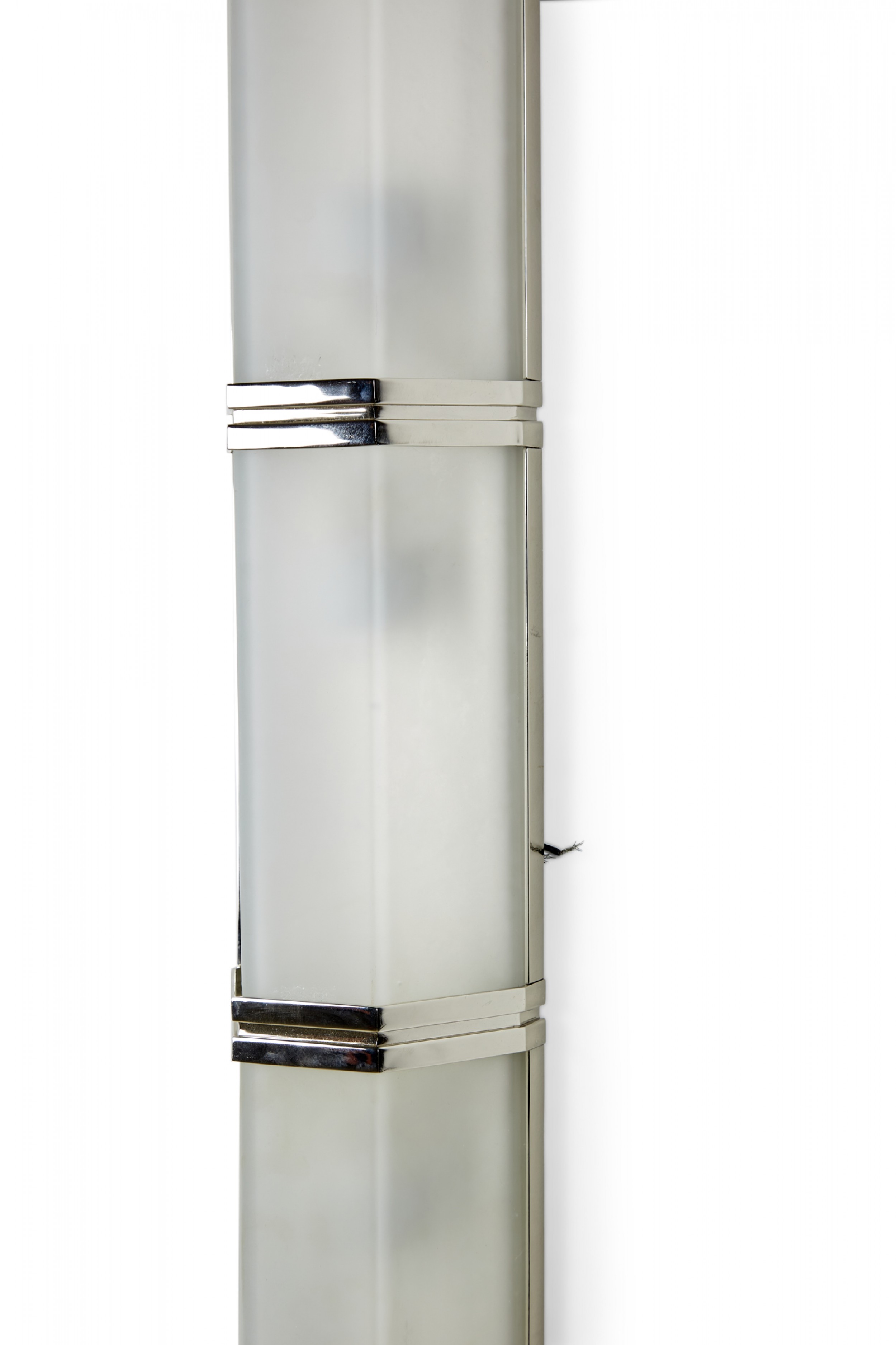 Contemporary trapezoidal wall sconce with three sections made of frosted glass separated by silver metal bands.