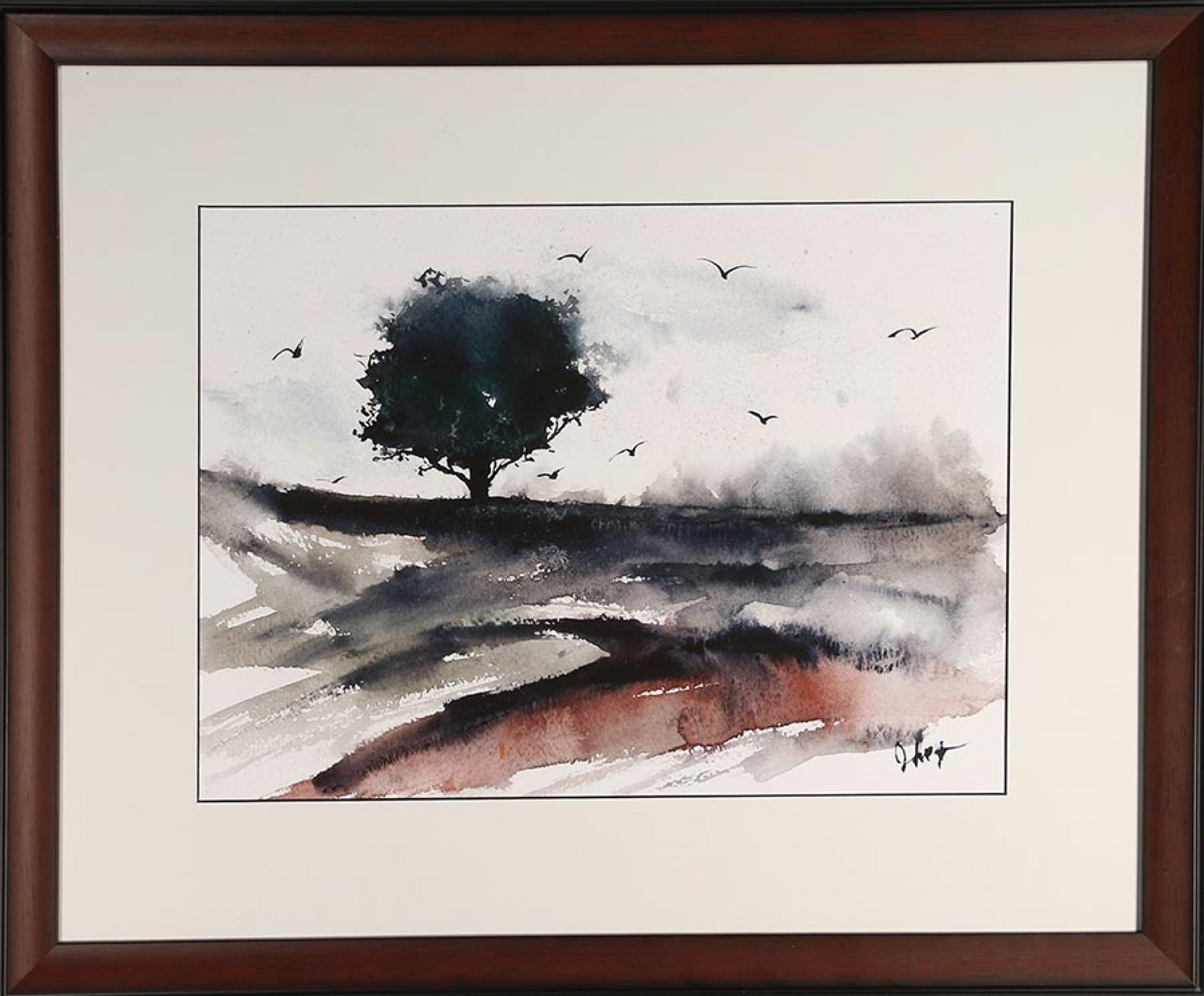 Framed Print of a Watercolor of a Gloomy Tree on a Hillside