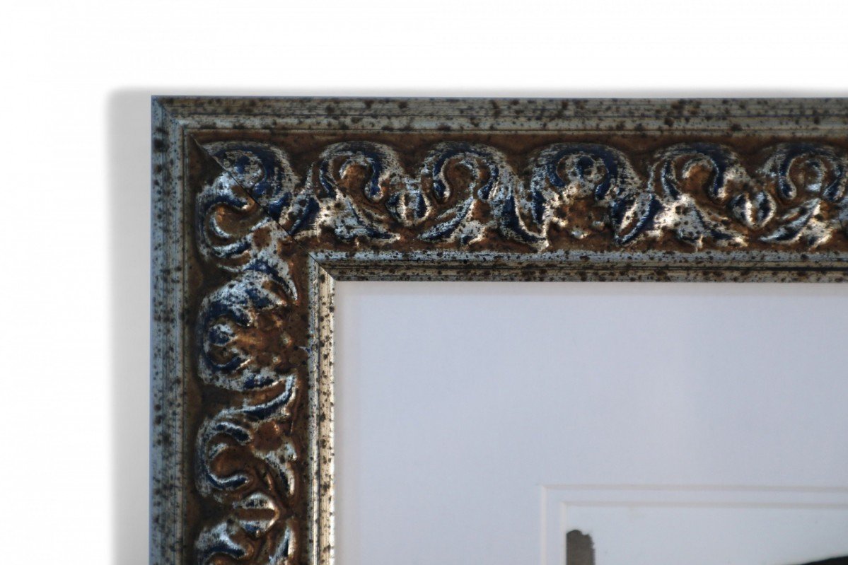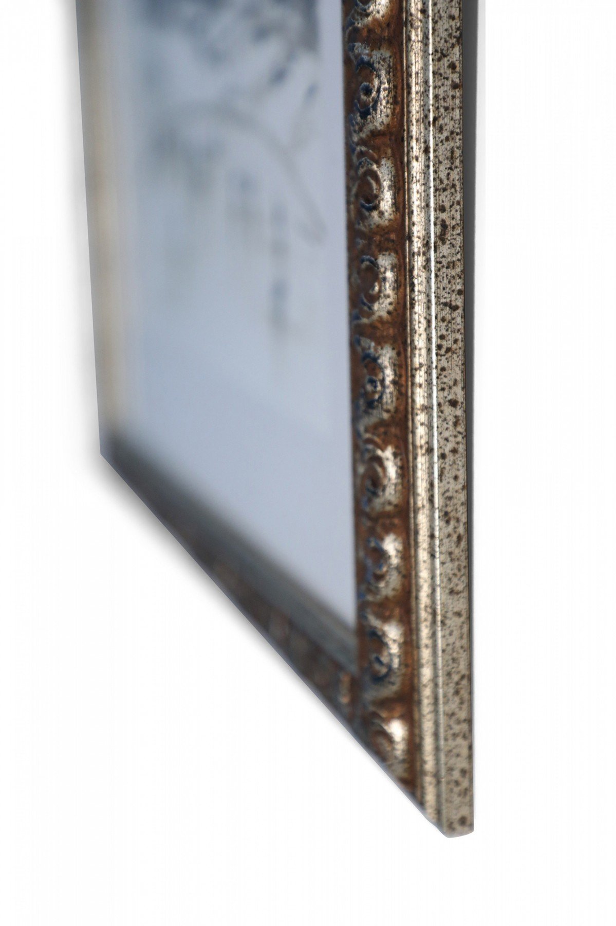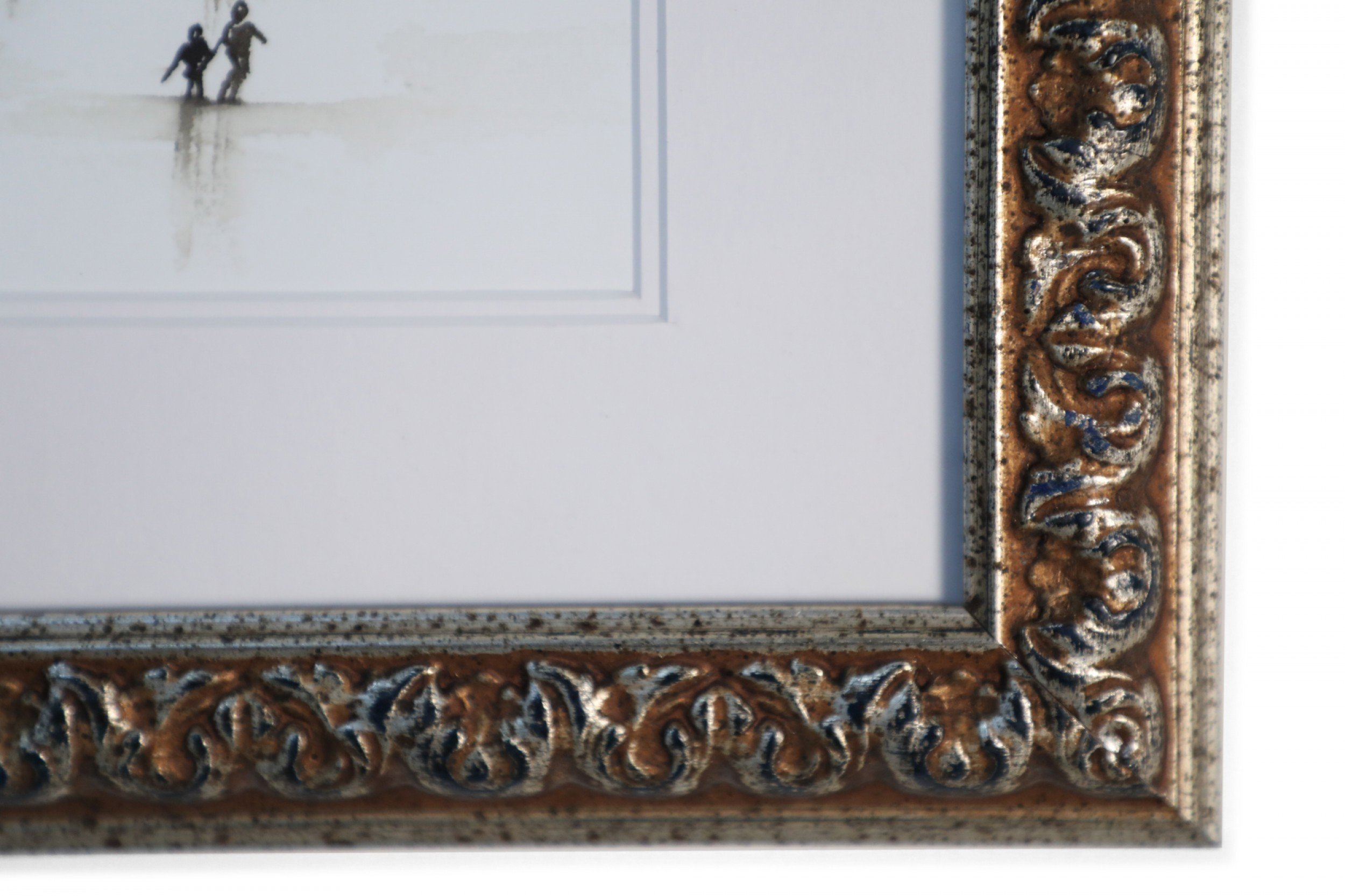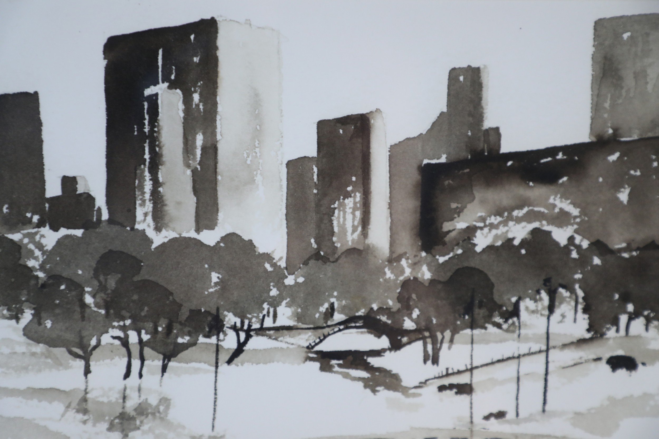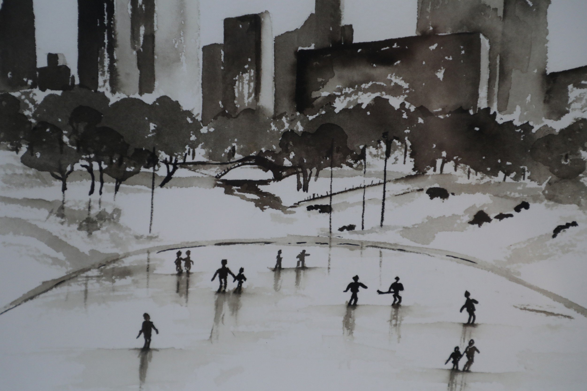 Contemporary print of a black and white watercolor painting depicting people skating on the ice in Central Park with tall buildings surrounding the ring in a rectangular antique silver wood frame with a beige double mat.(Available in larger size: NWL337)