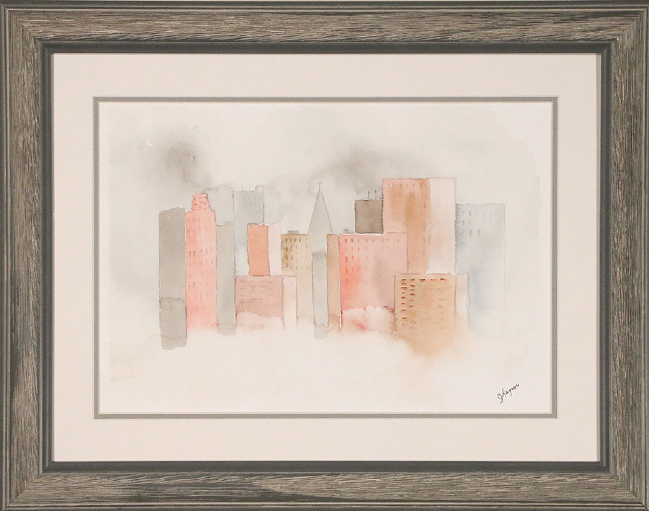 Contemporary print of a watercolor painting of the New York City skyline in a rectangular rough-hewn grey wood frame and beige double mat.