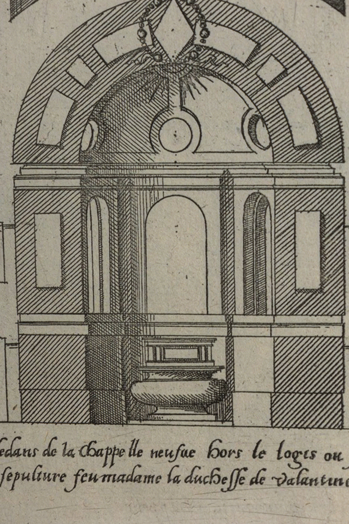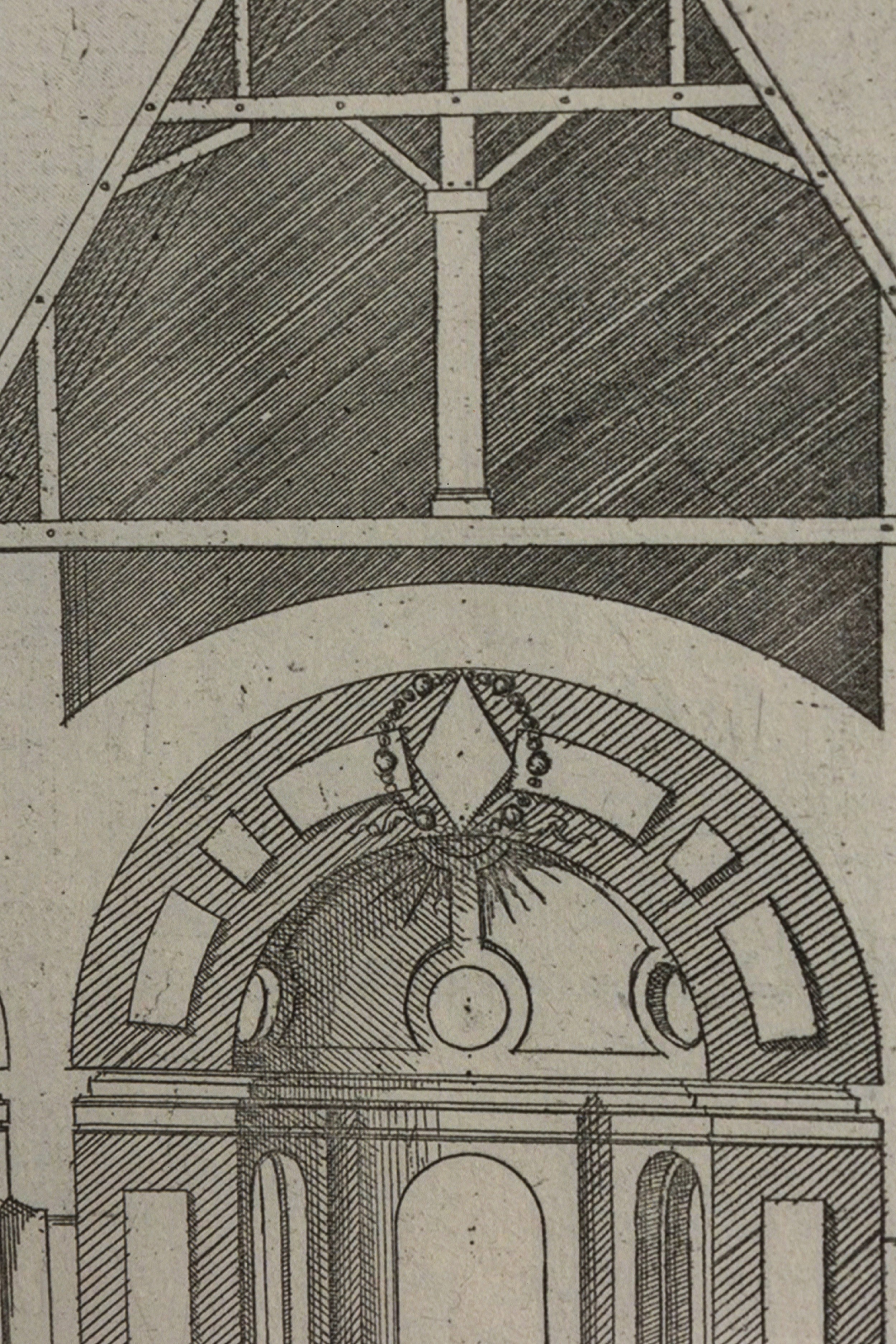 Reproduction of an early 1600s architectural drawing of a building on aged paper, framed in a simple bronze style frame.