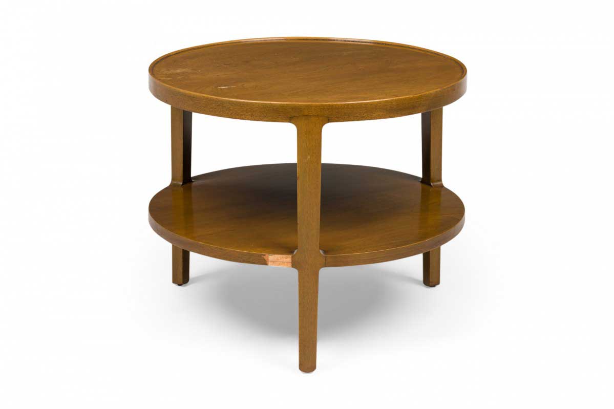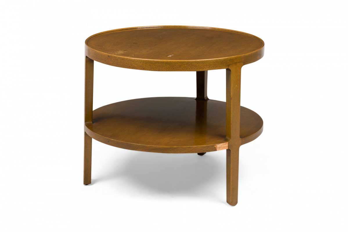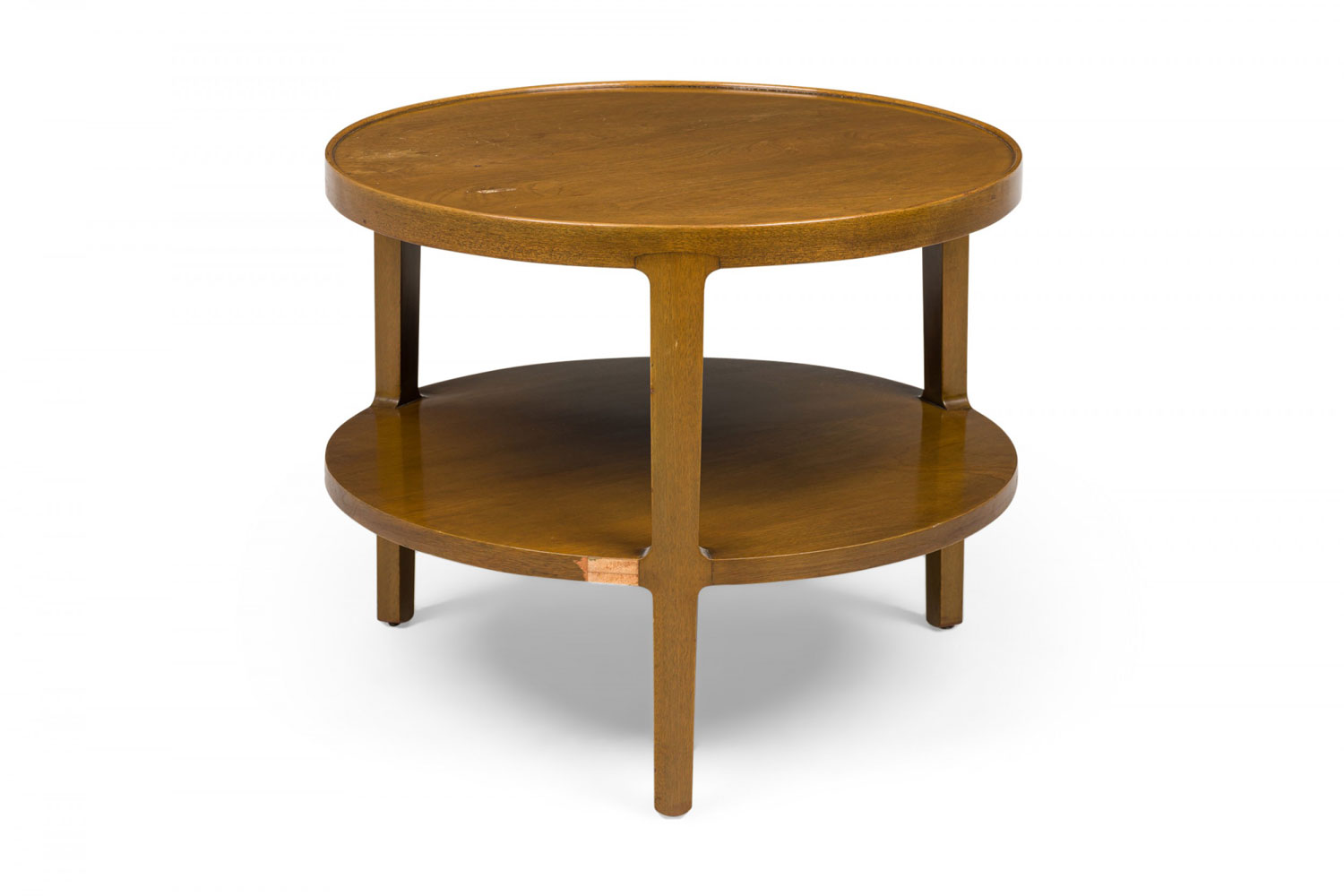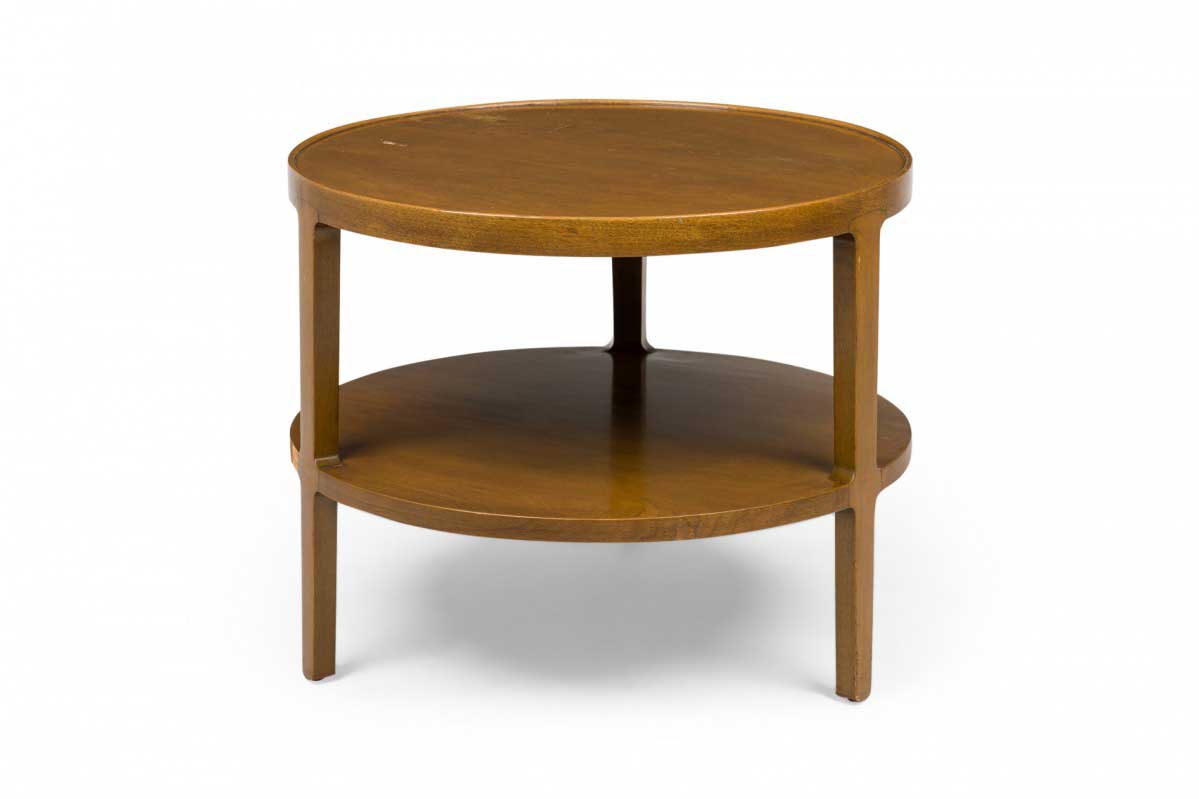 American Mid-Century blond maple two-tier end / side table with a circular top and lower stretcher shelf between three tapered square legs.