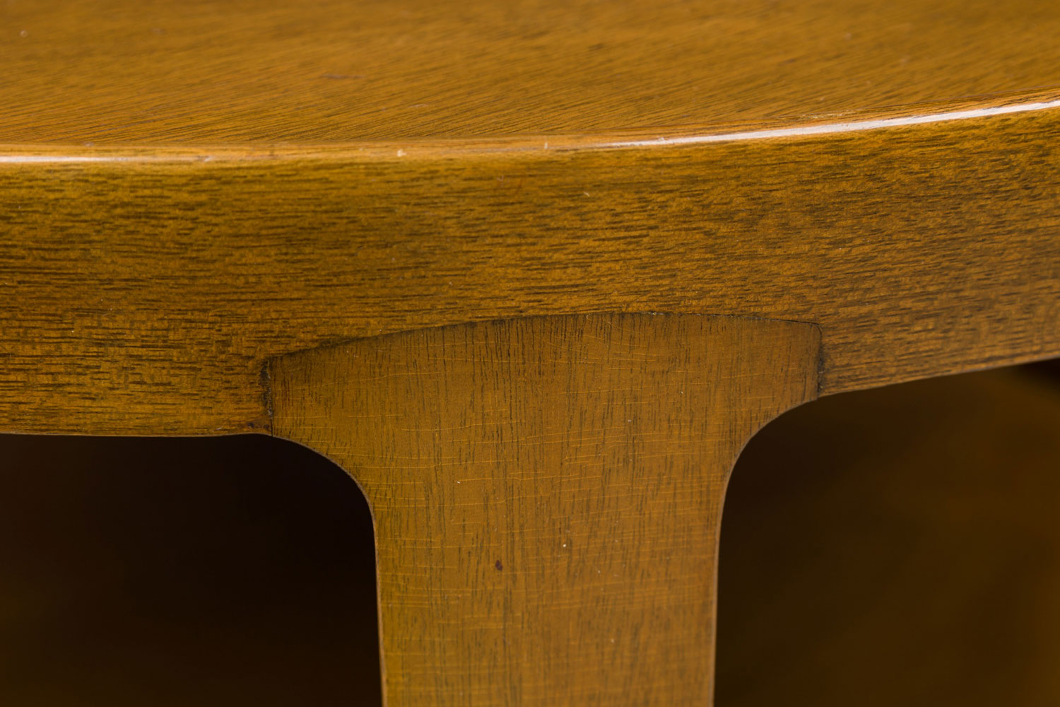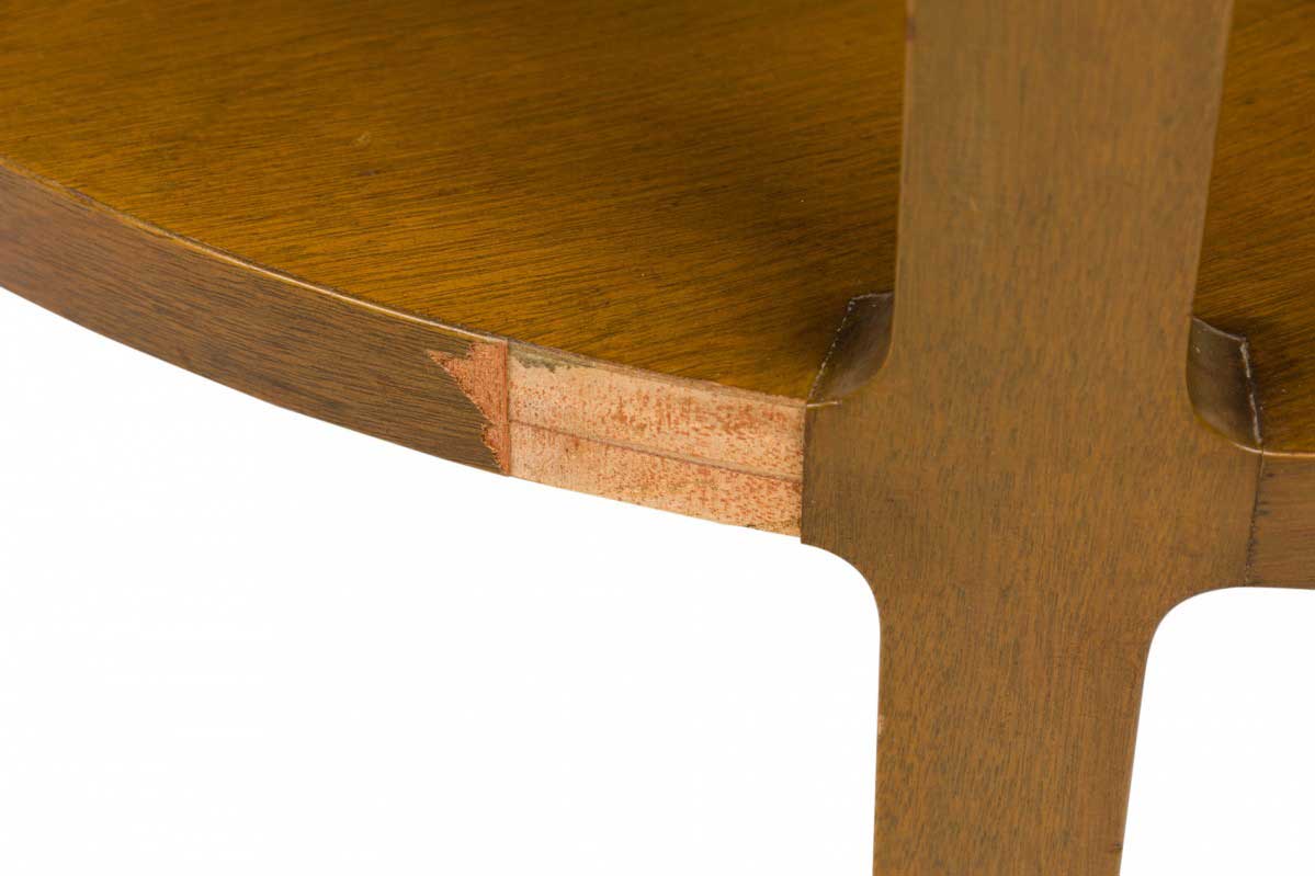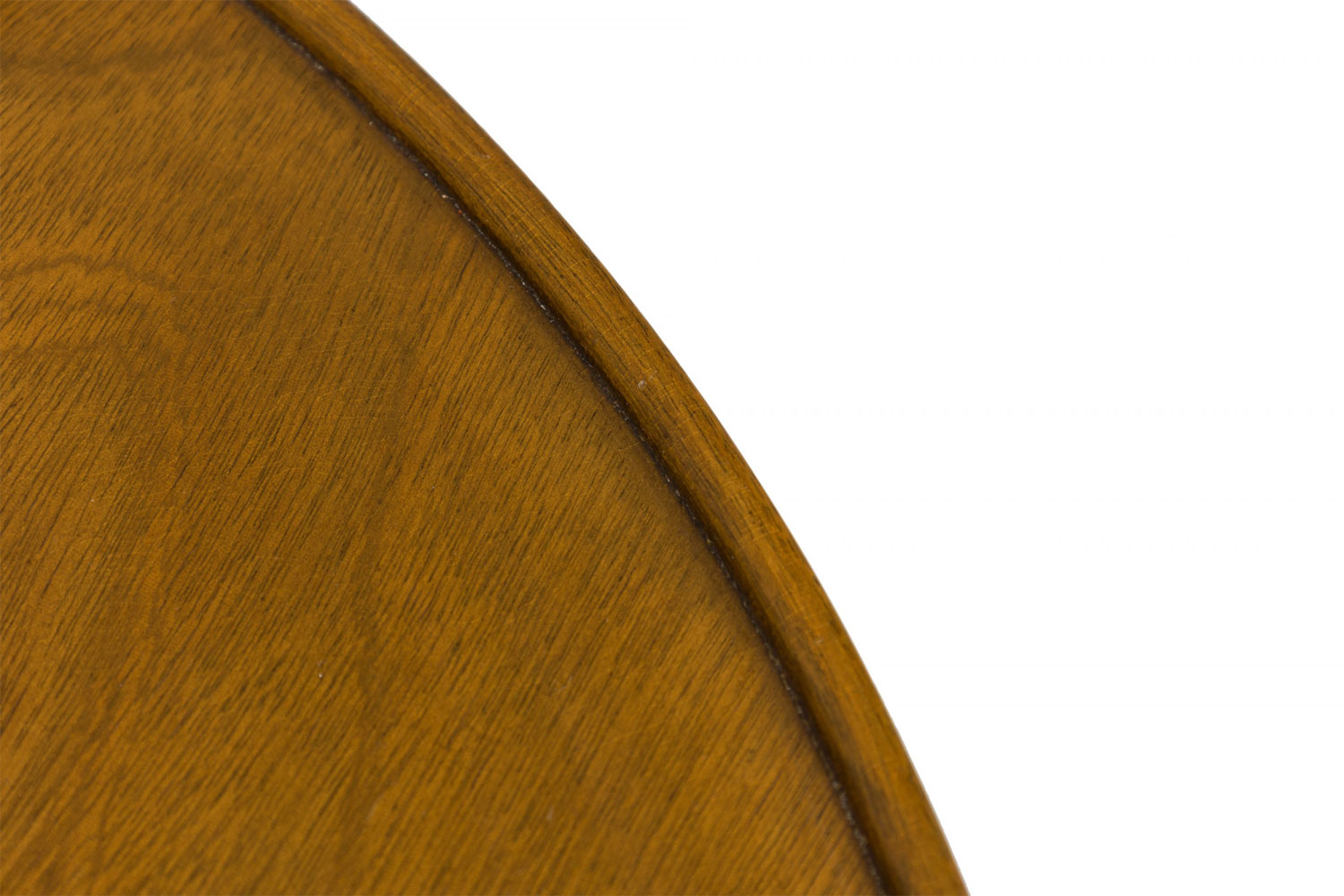 American Mid-Century blond maple two-tier end / side table with a circular top and lower stretcher shelf between three tapered square legs.