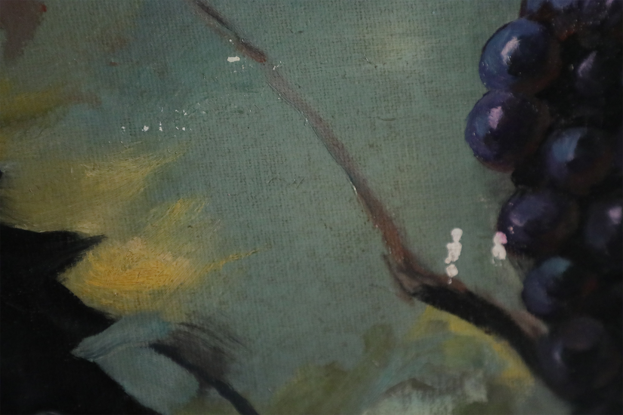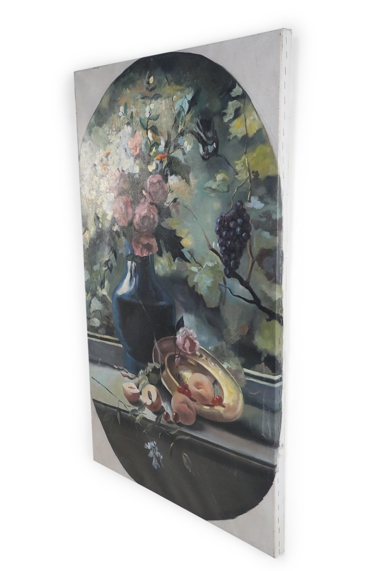 Italian Neo-classic style unframed canvas still life oil painting depicting a blue vase filled with blossoming pink, yellow and white florals behind a golden tray, spilling peaches and cherries onto the surface, and a natural setting with grape vines in the background (Similar piece: NWL2281A, slight differences in line weight and background color).