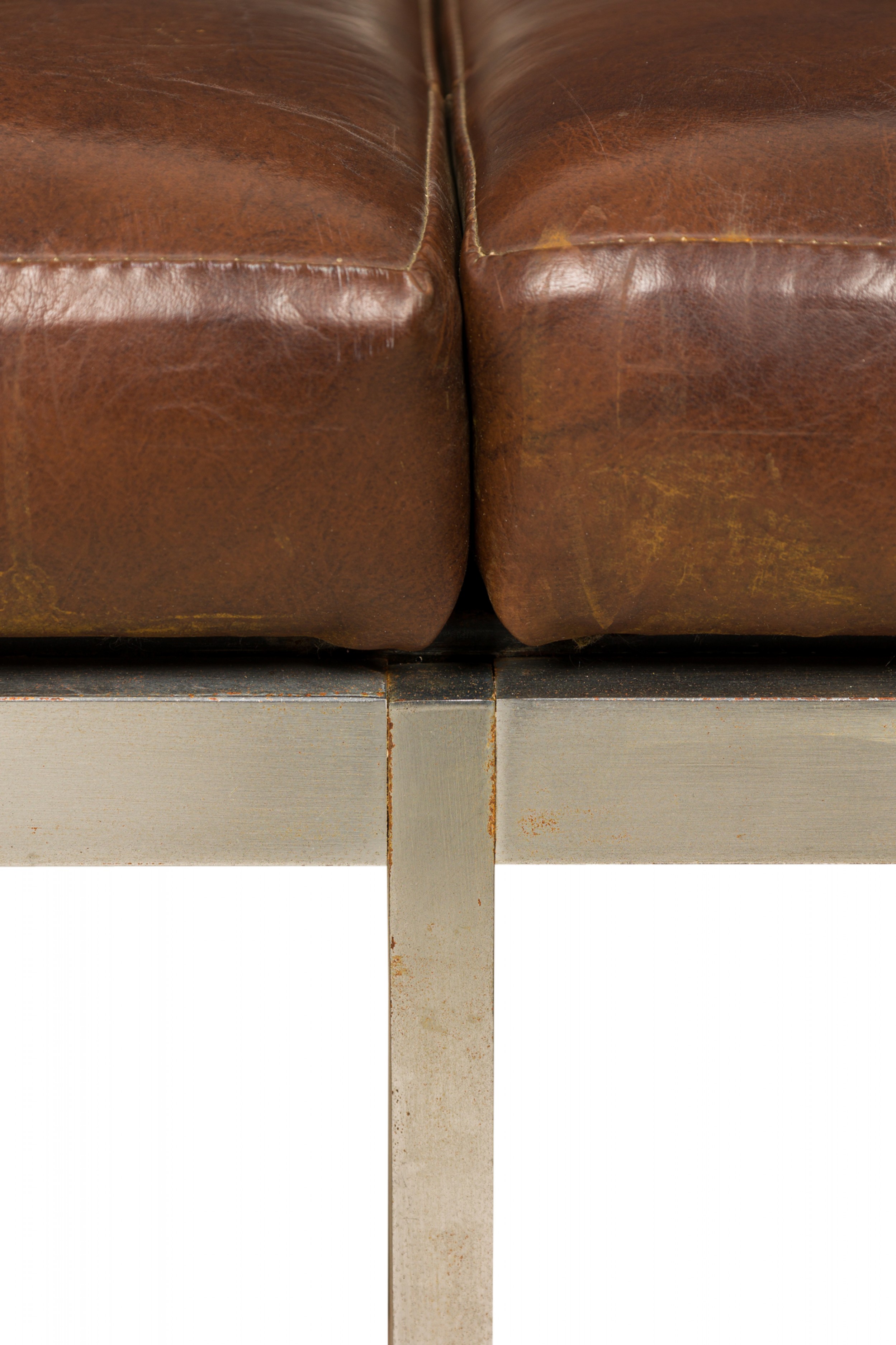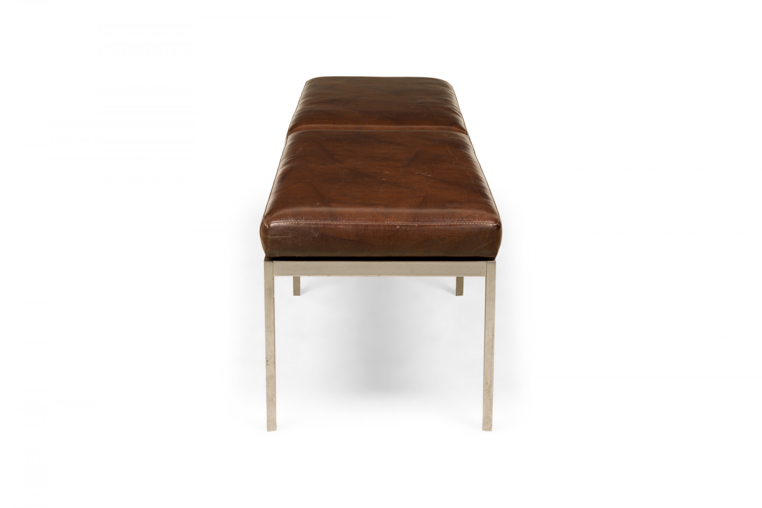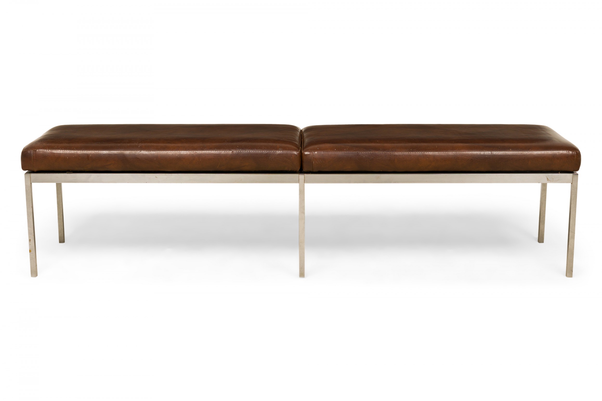 American Mid-Century rectangular bench with a two section chocolate brown leather upholstered seat resting on a square chrome tube frame.