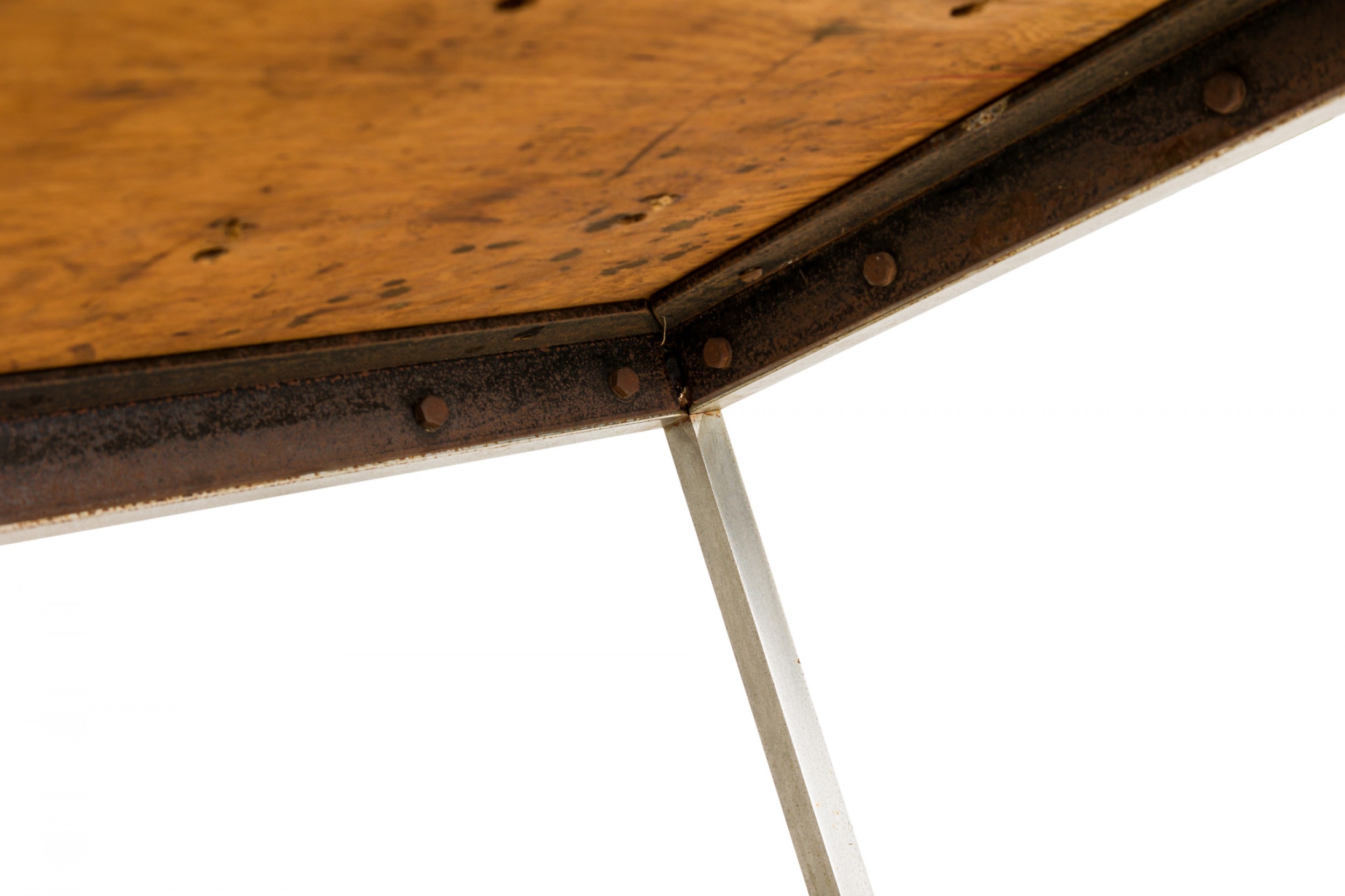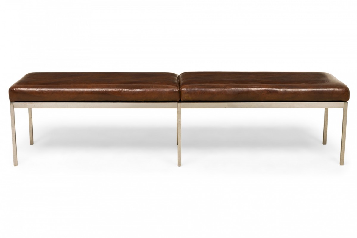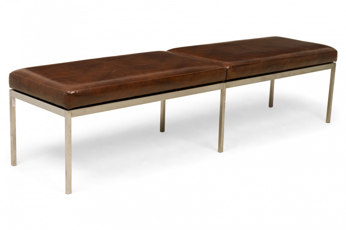 American Mid-Century rectangular bench with a two section chocolate brown leather upholstered seat resting on a square chrome tube frame.