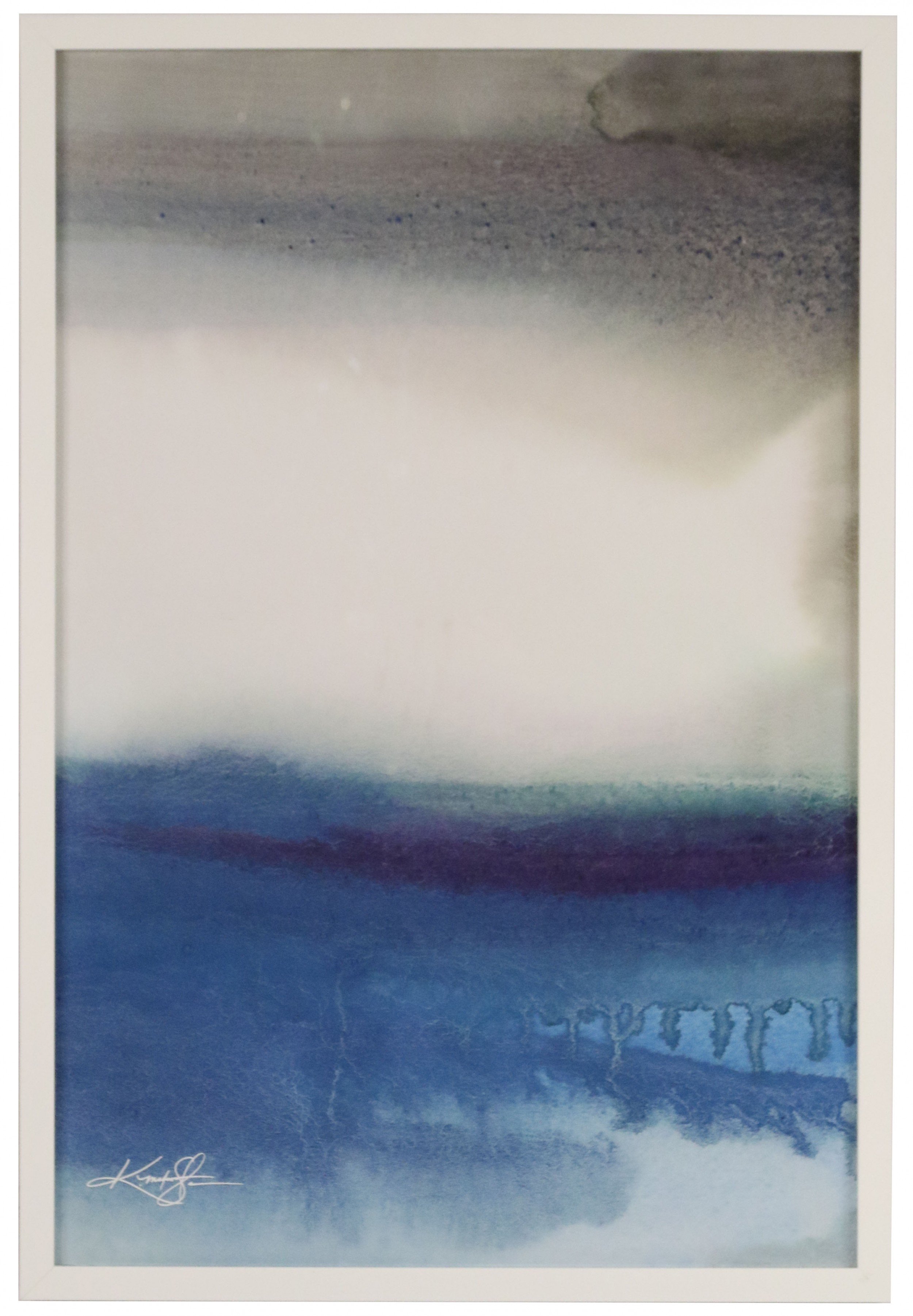 Contemporary print of an abstract painting of horizontal swaths of blue, gray, white and beige in a rectangular white frame. (Smaller version available: NWL405)