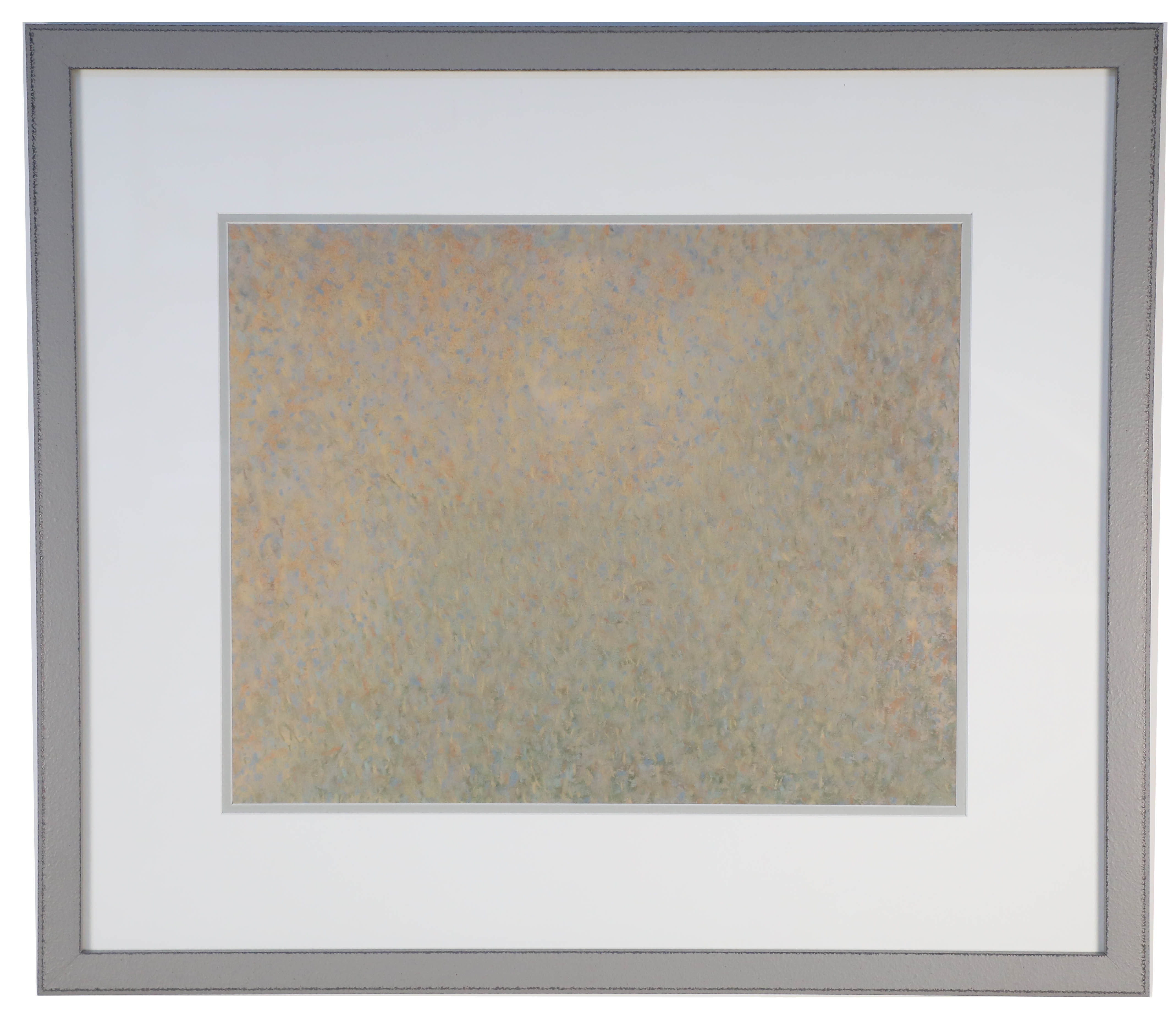 Contemporary print of an abstract painting of a swath of muted color dots on paper in a rectangular light gray wooden frame and white double mat with two wires, allowing the piece to be hung horizontally or vertically (PART OF A SERIES: NWL518, NWL519, NWL520, NWL521, NWL522, NWL524, NWL525, NWL526)