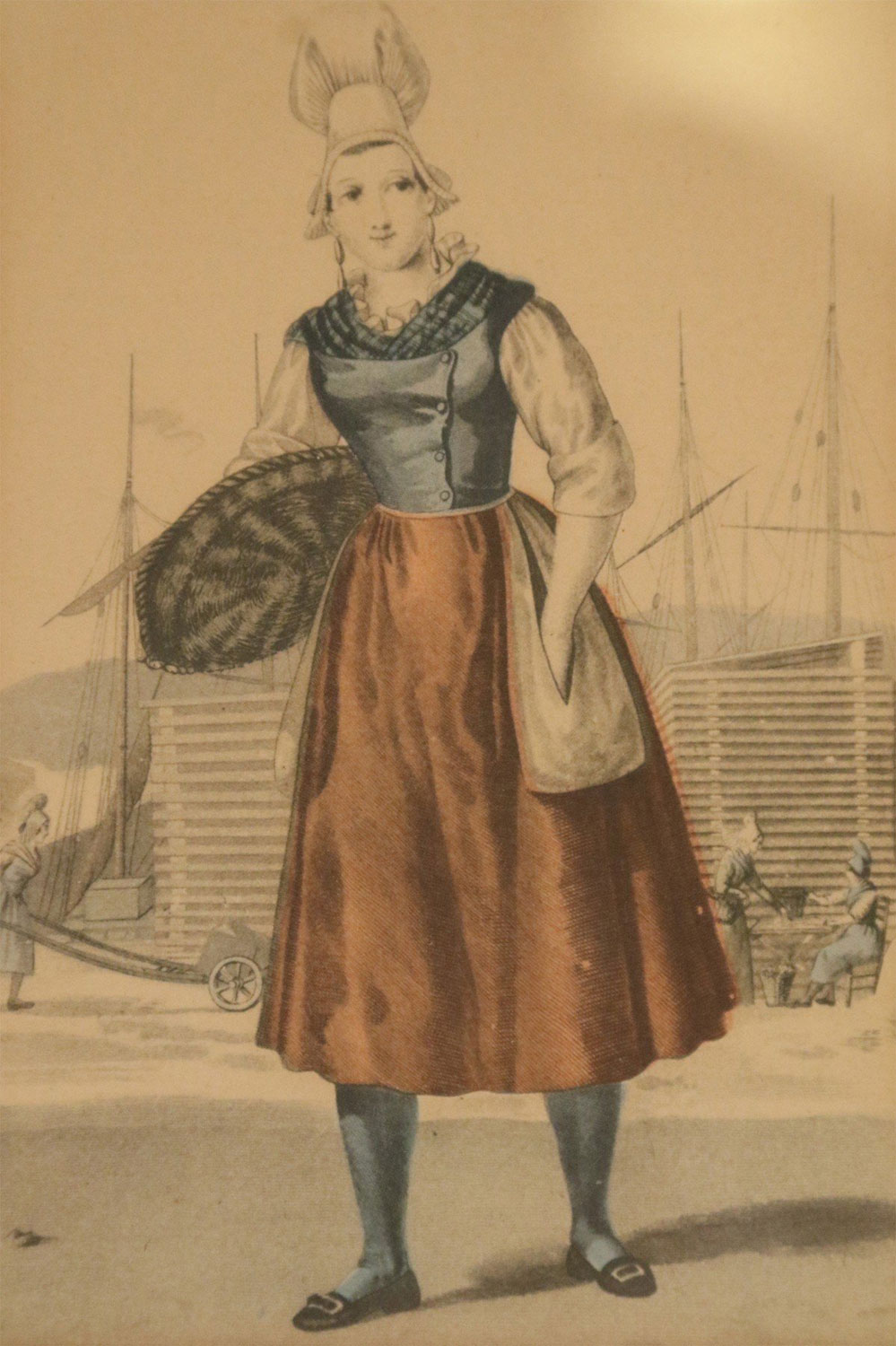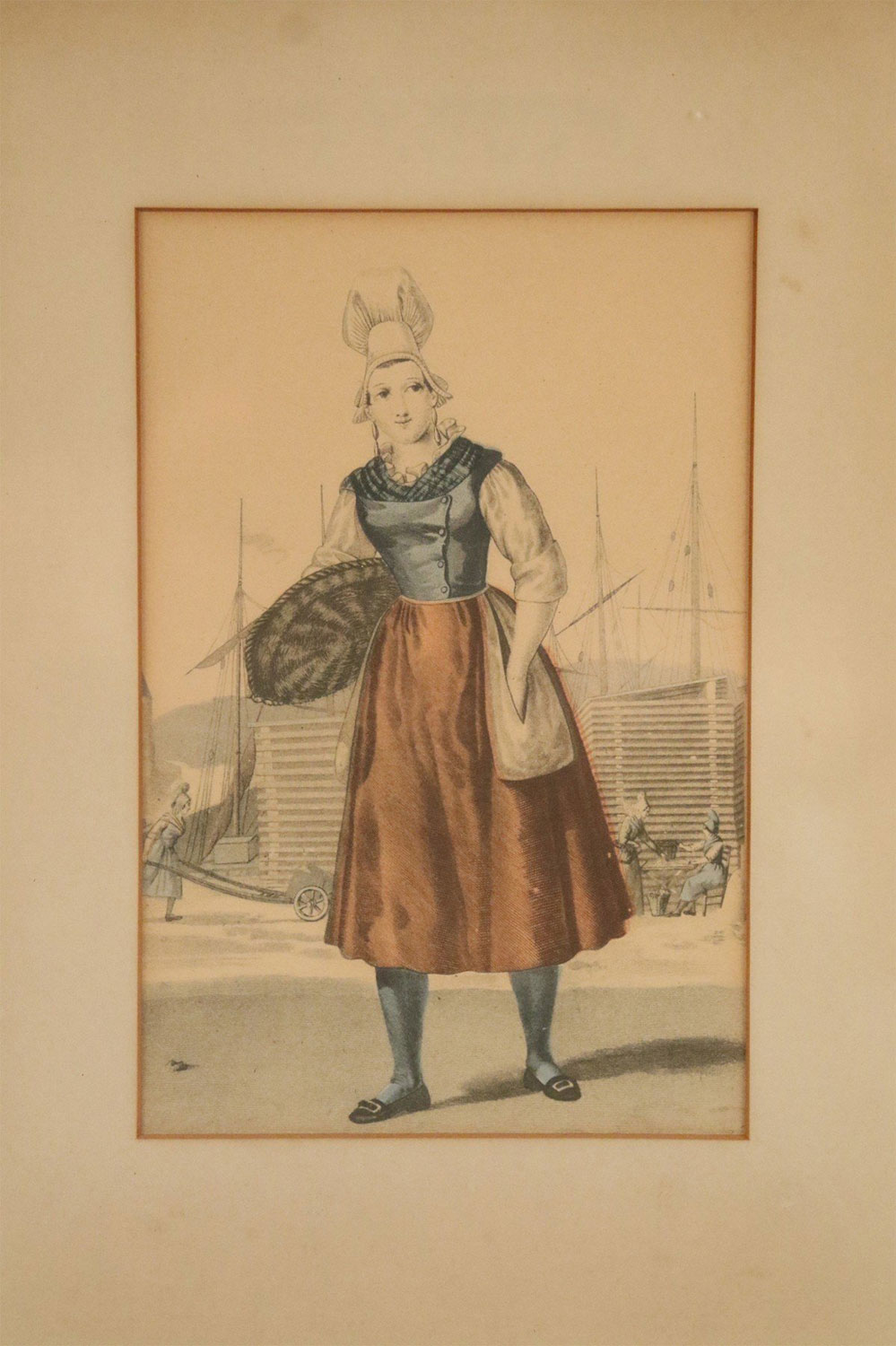 Antique Dutch engraving depicting a woman in traditional dress in a beige mat and rectangular wooden frame.