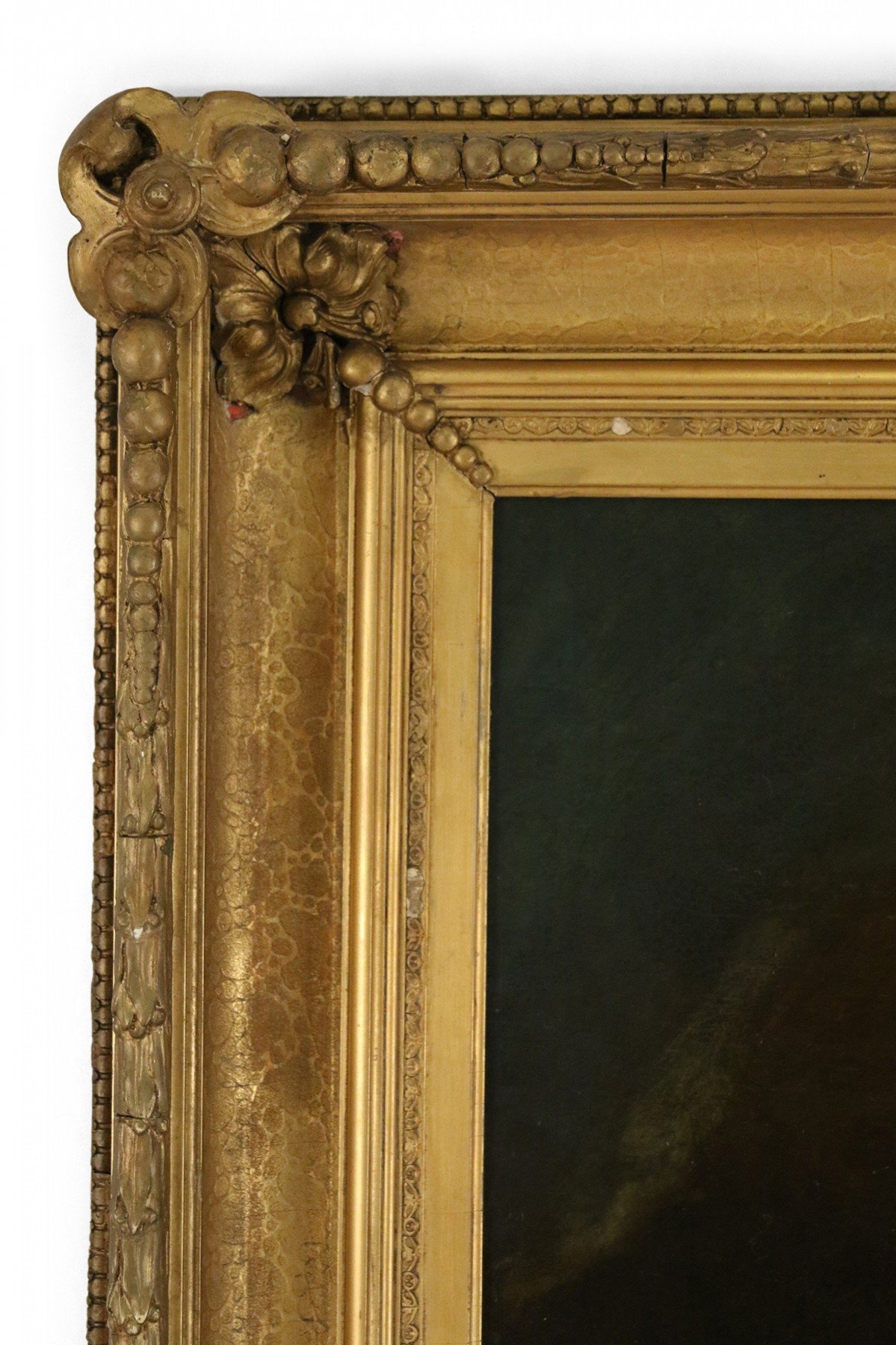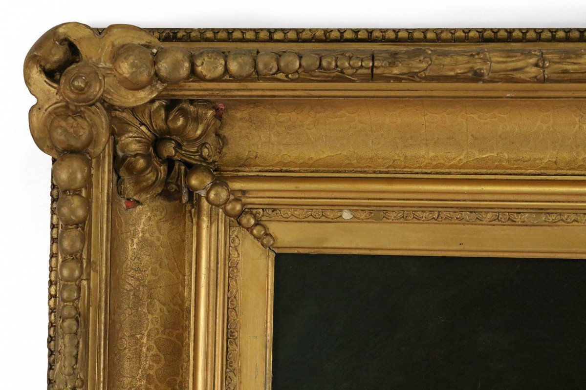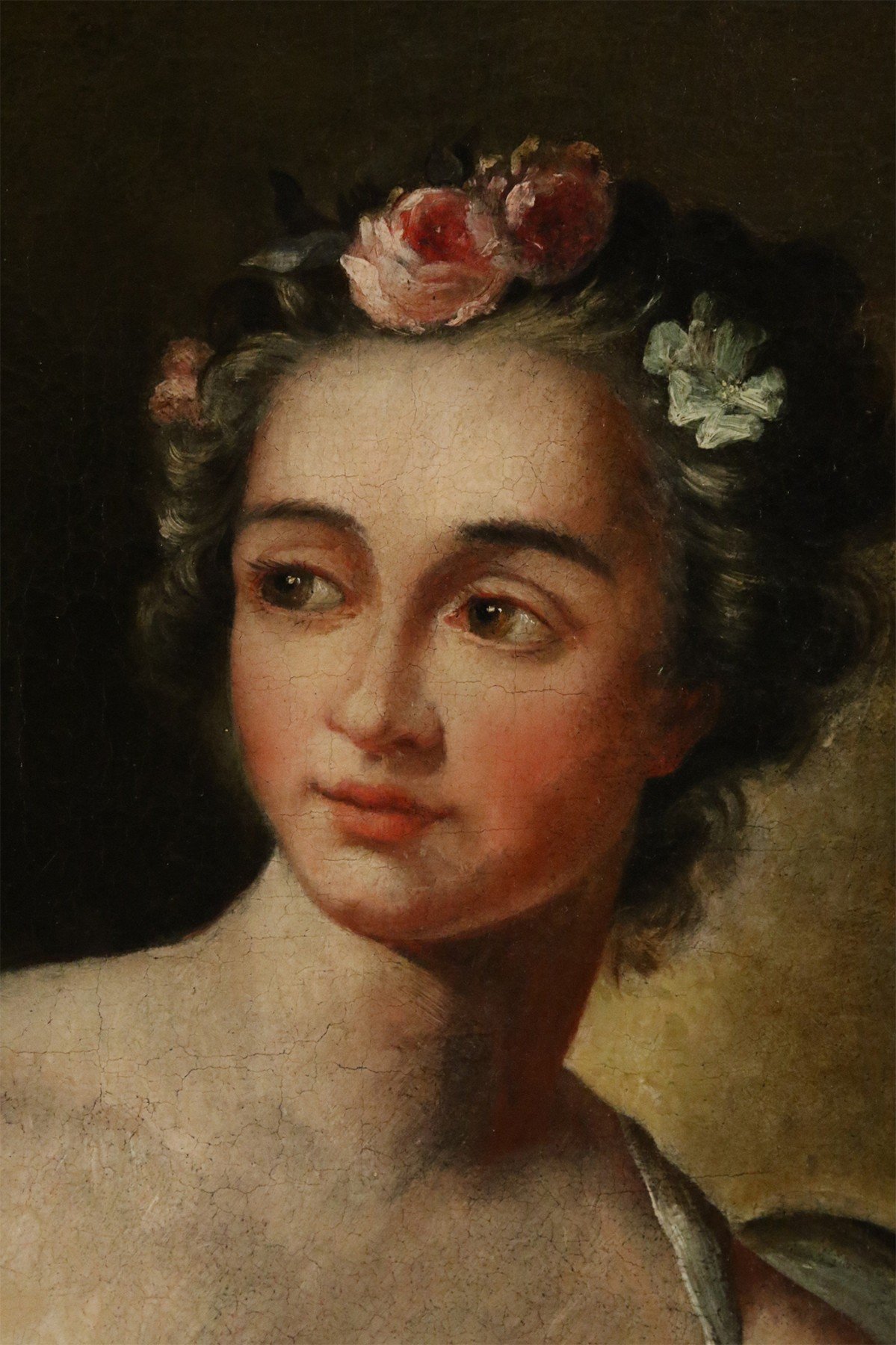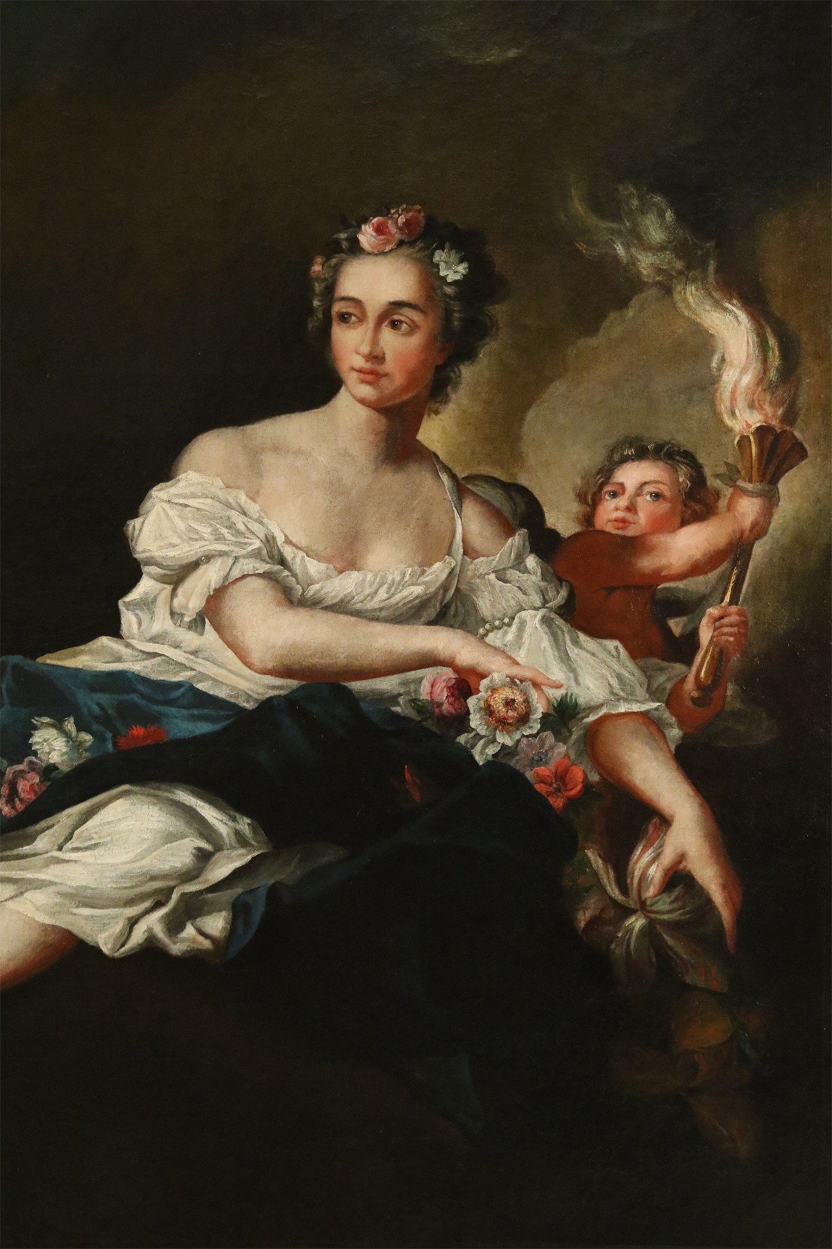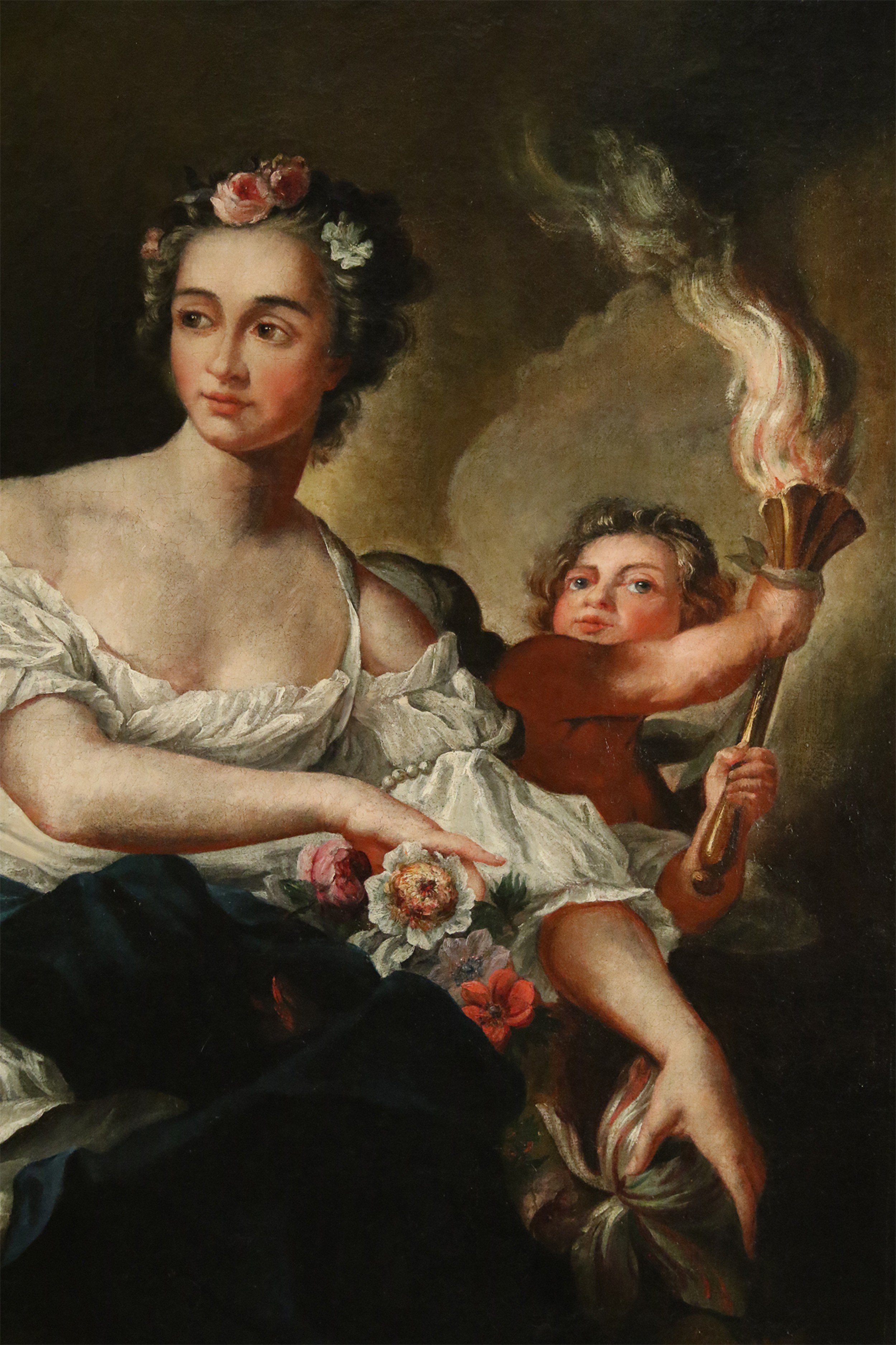 French large oil painting portrait of an 18th Century woman holding flowers and a child bearing a torch in an ornate carved rectangular giltwood frame.