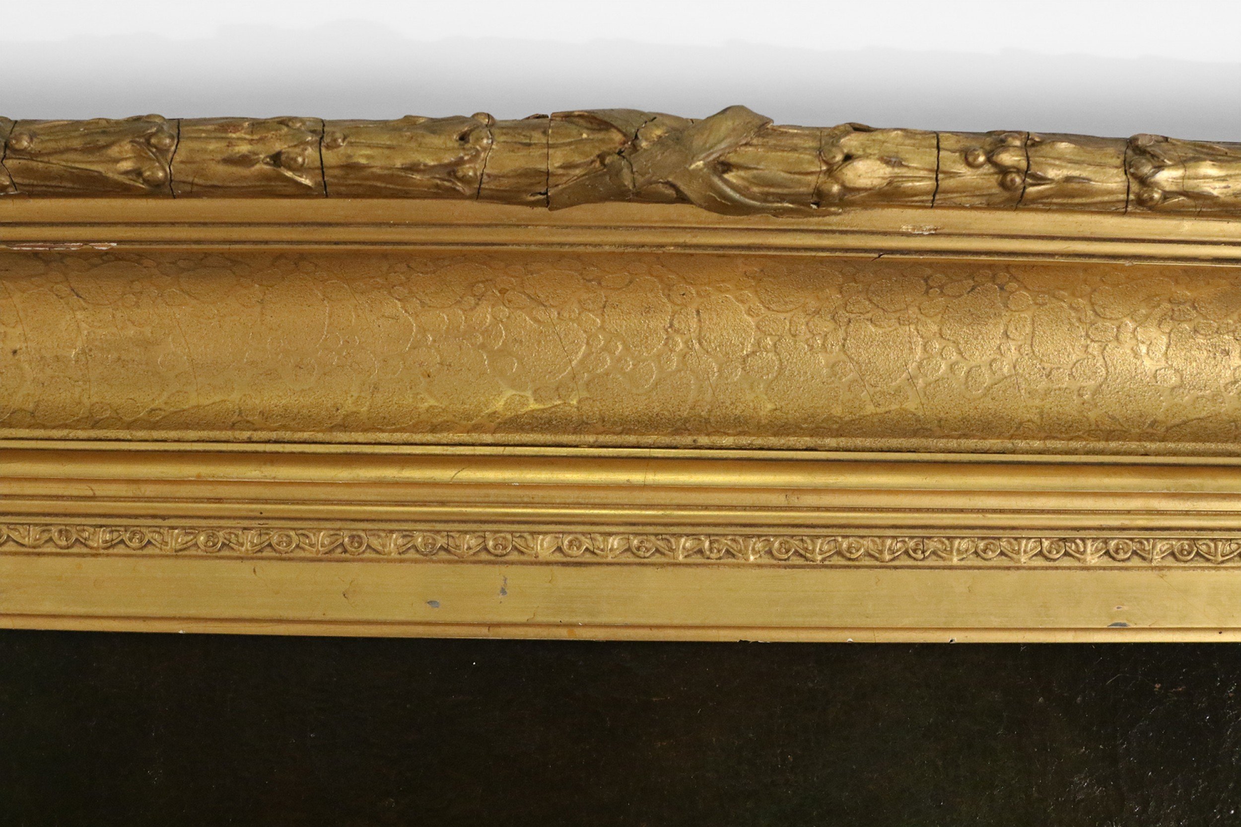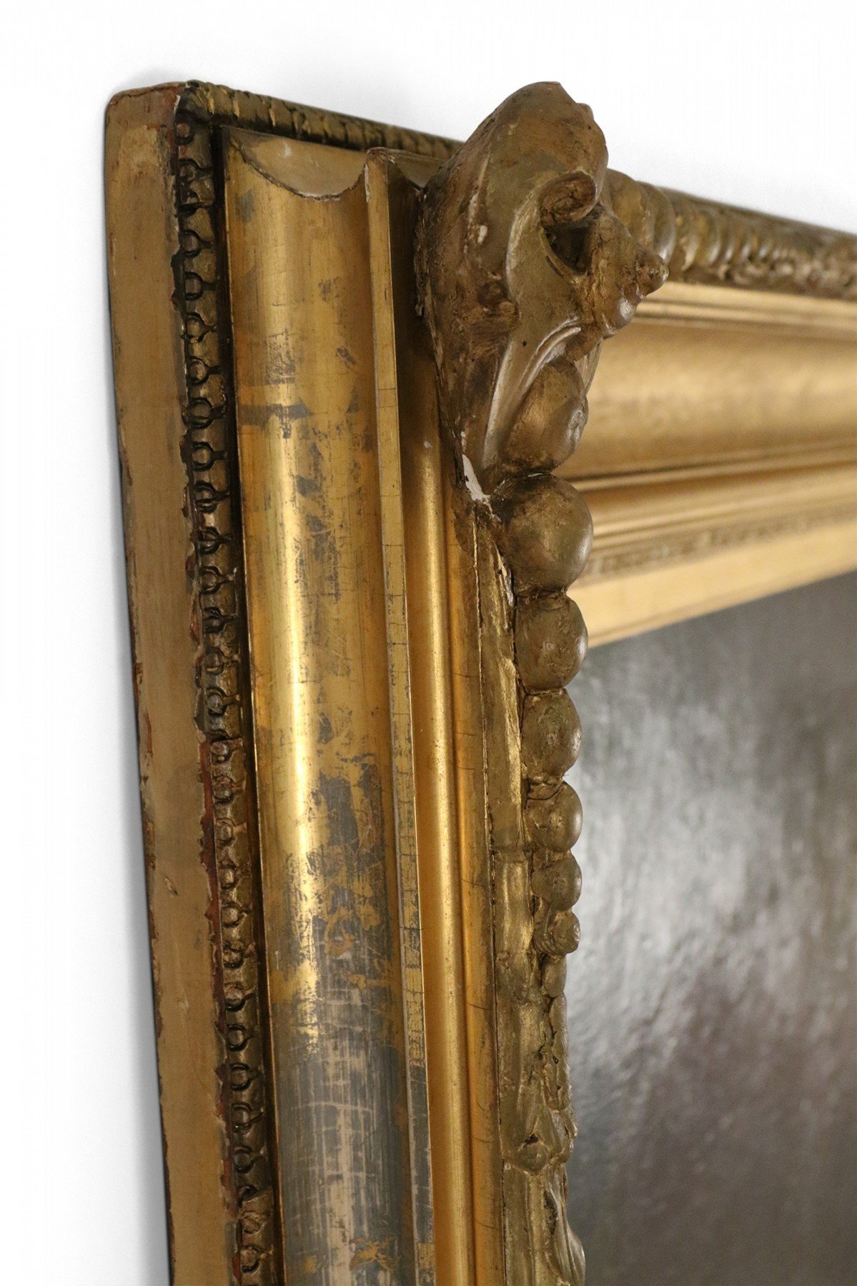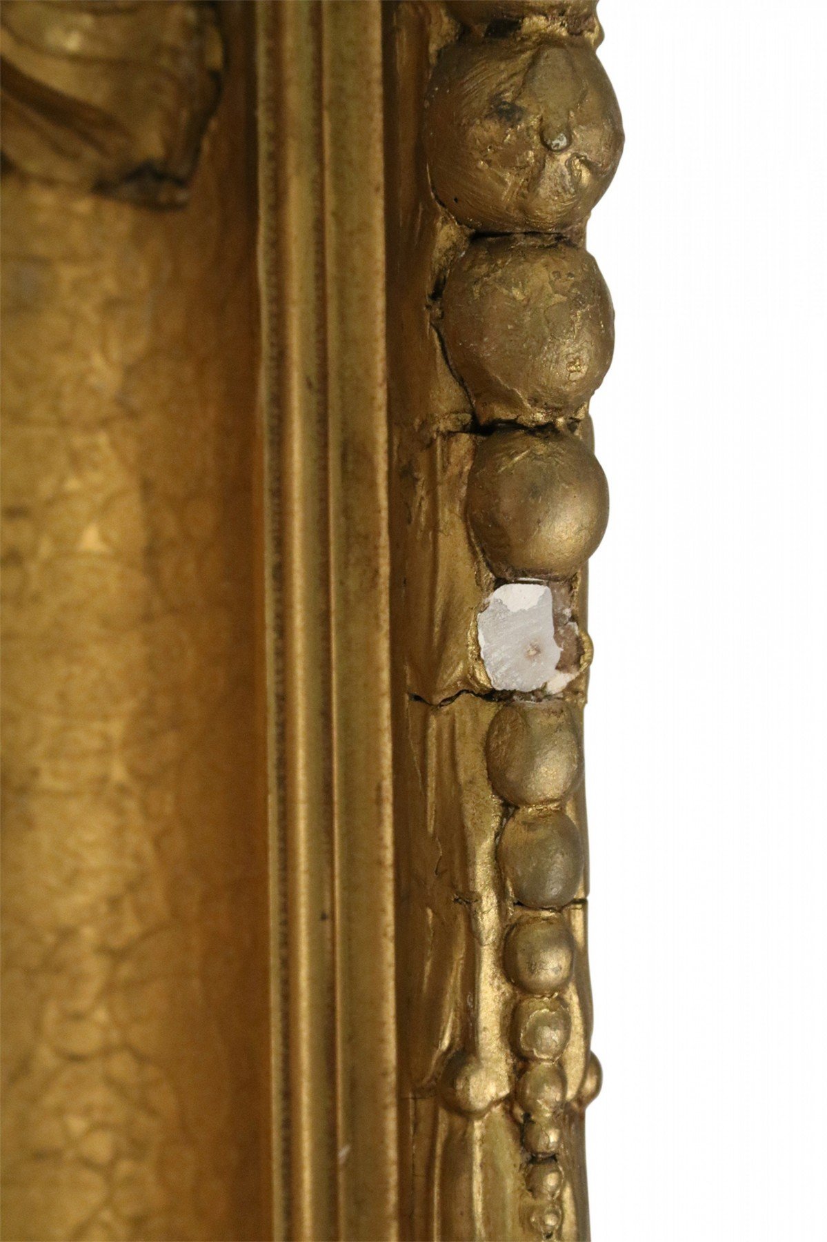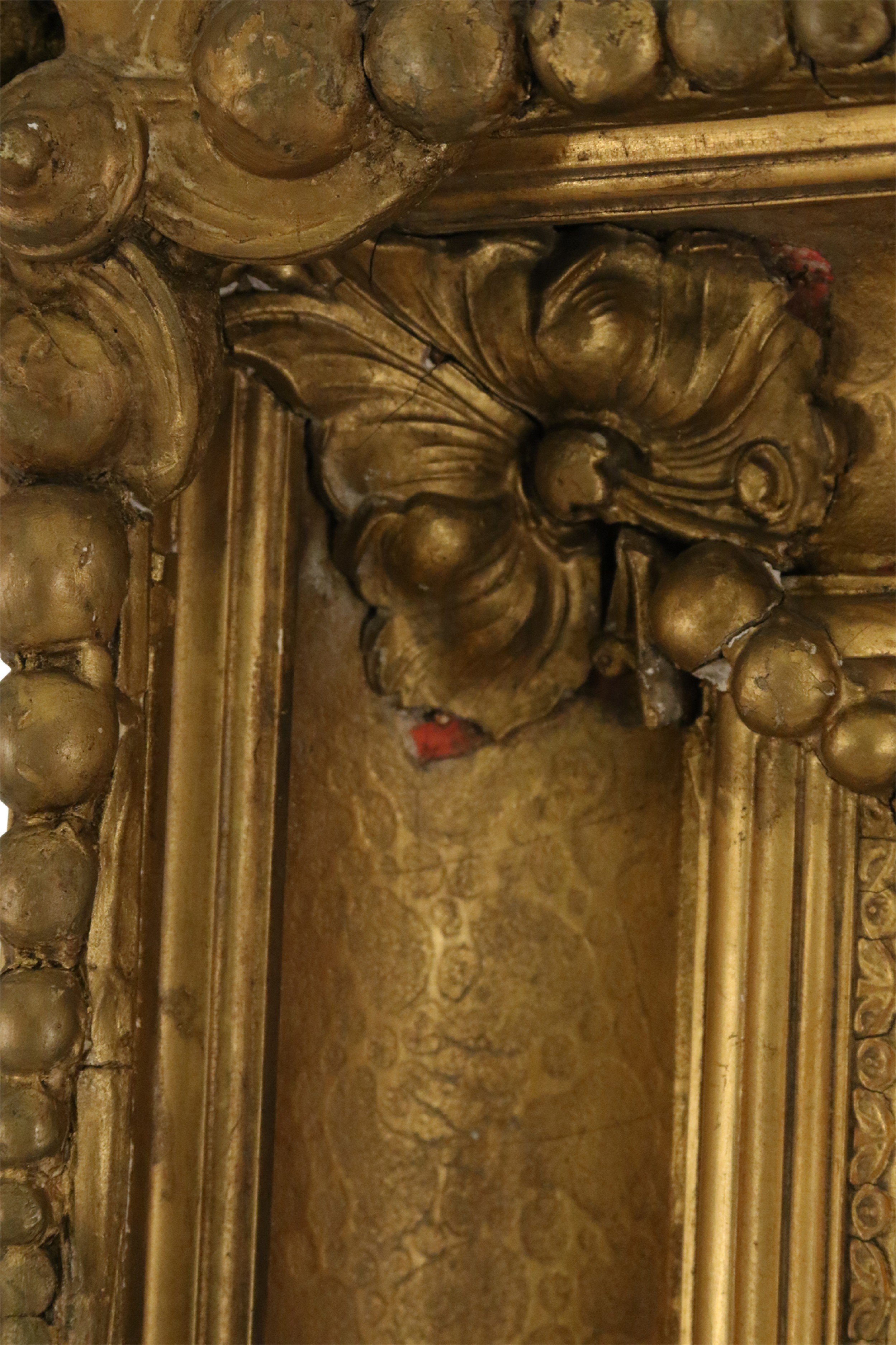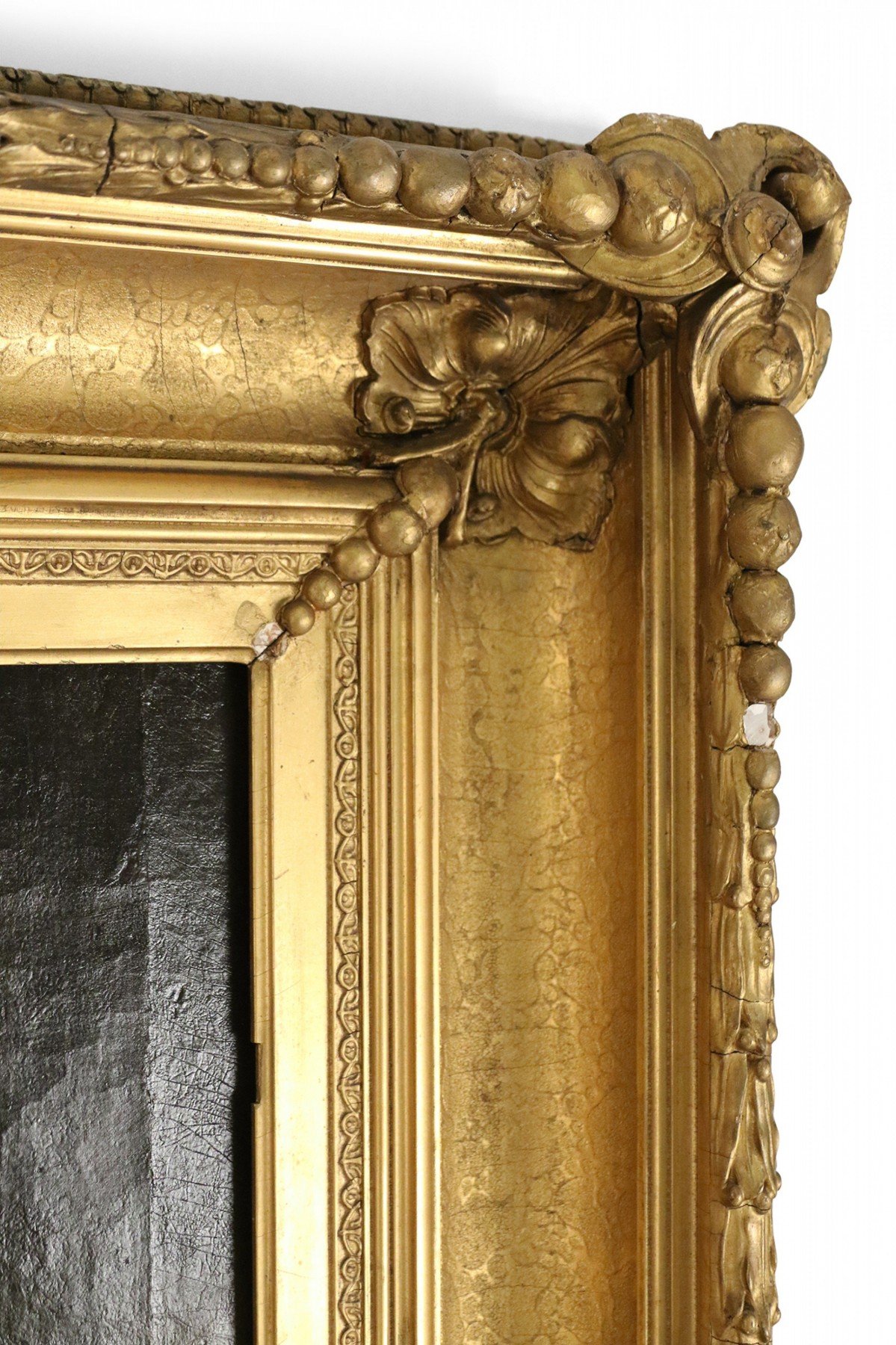 French large oil painting portrait of an 18th Century woman holding flowers and a child bearing a torch in an ornate carved rectangular giltwood frame.