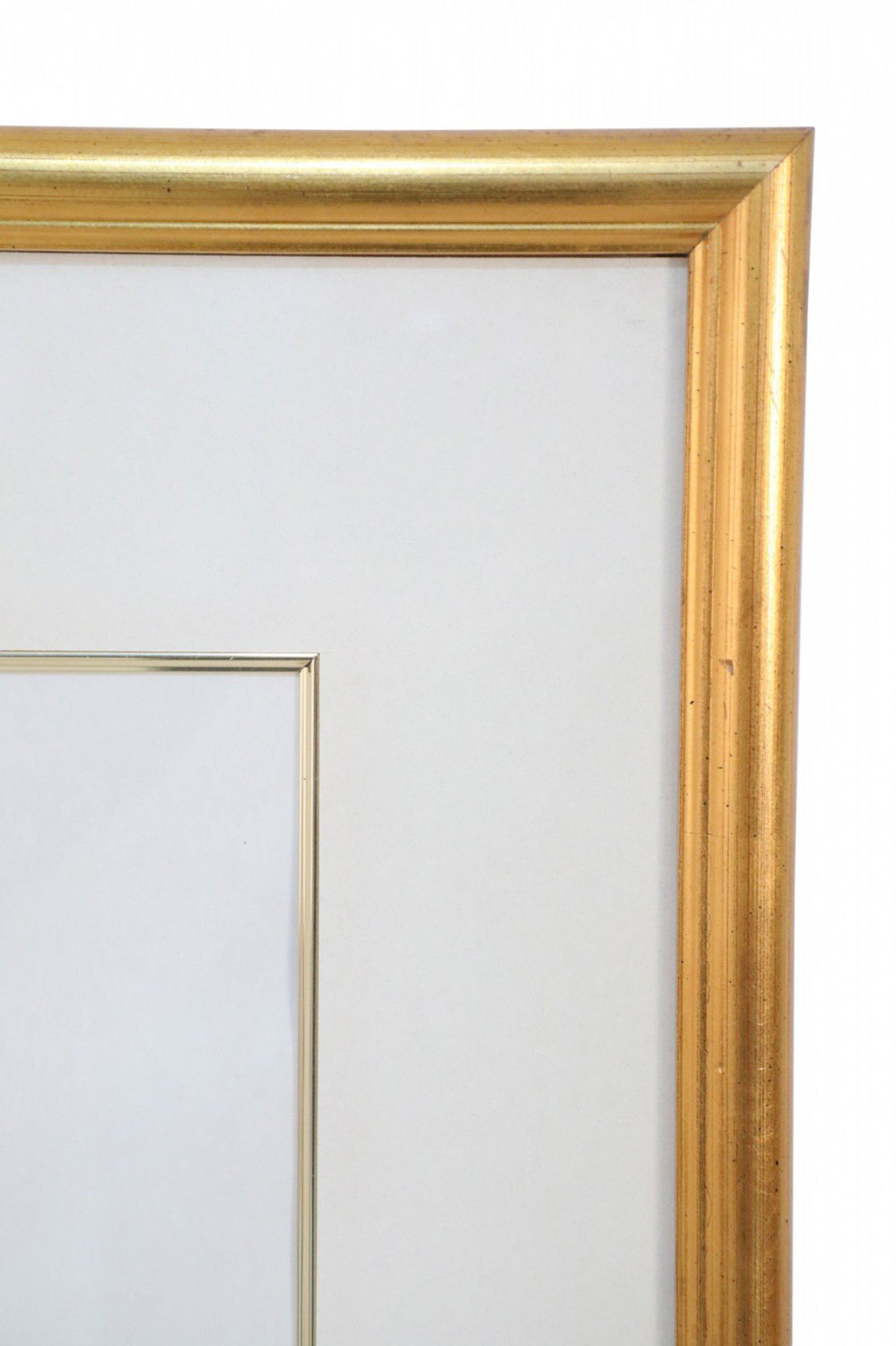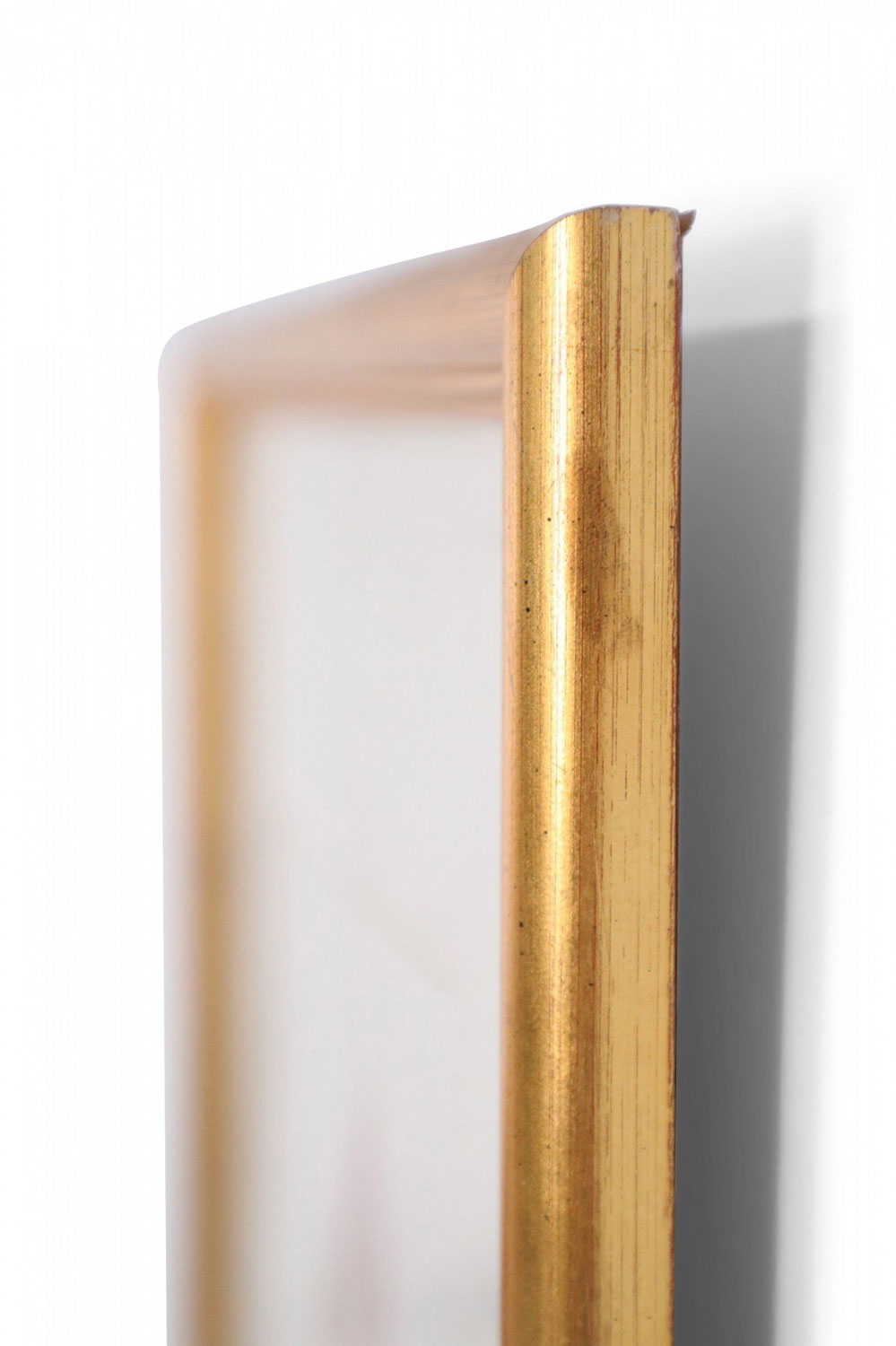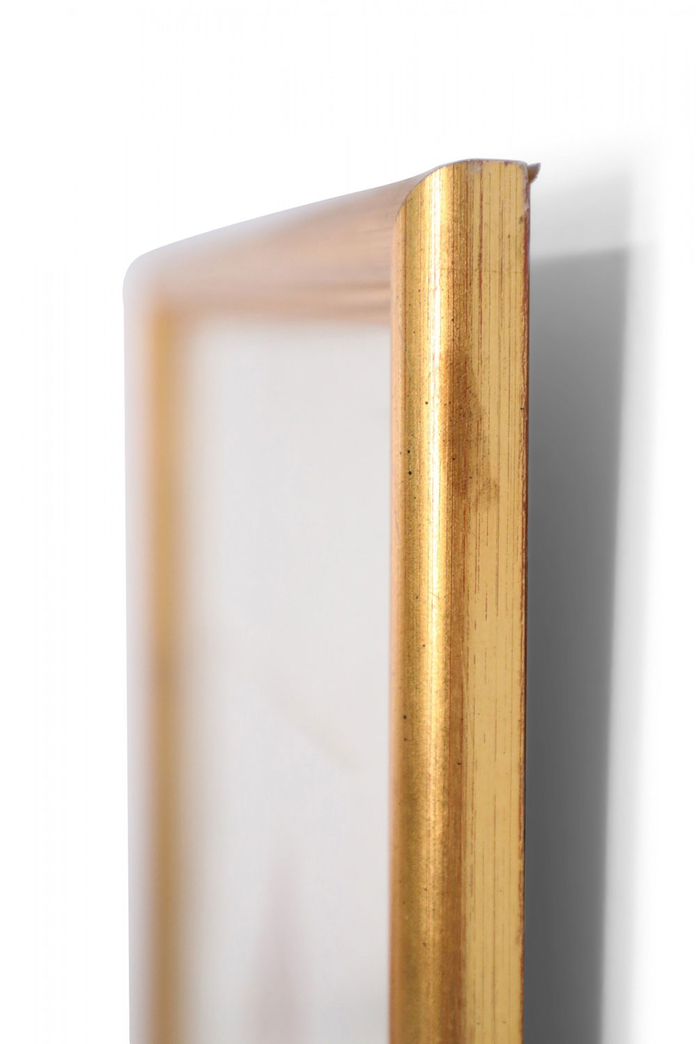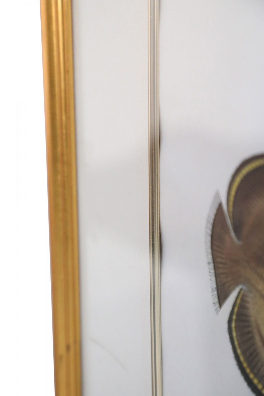 English Victorian style lithograph of two tropical fish, one brown, one pink and red, in a beige mat with gold bevel and a rectangular giltwood frame. (Companion piece: NWL2521)