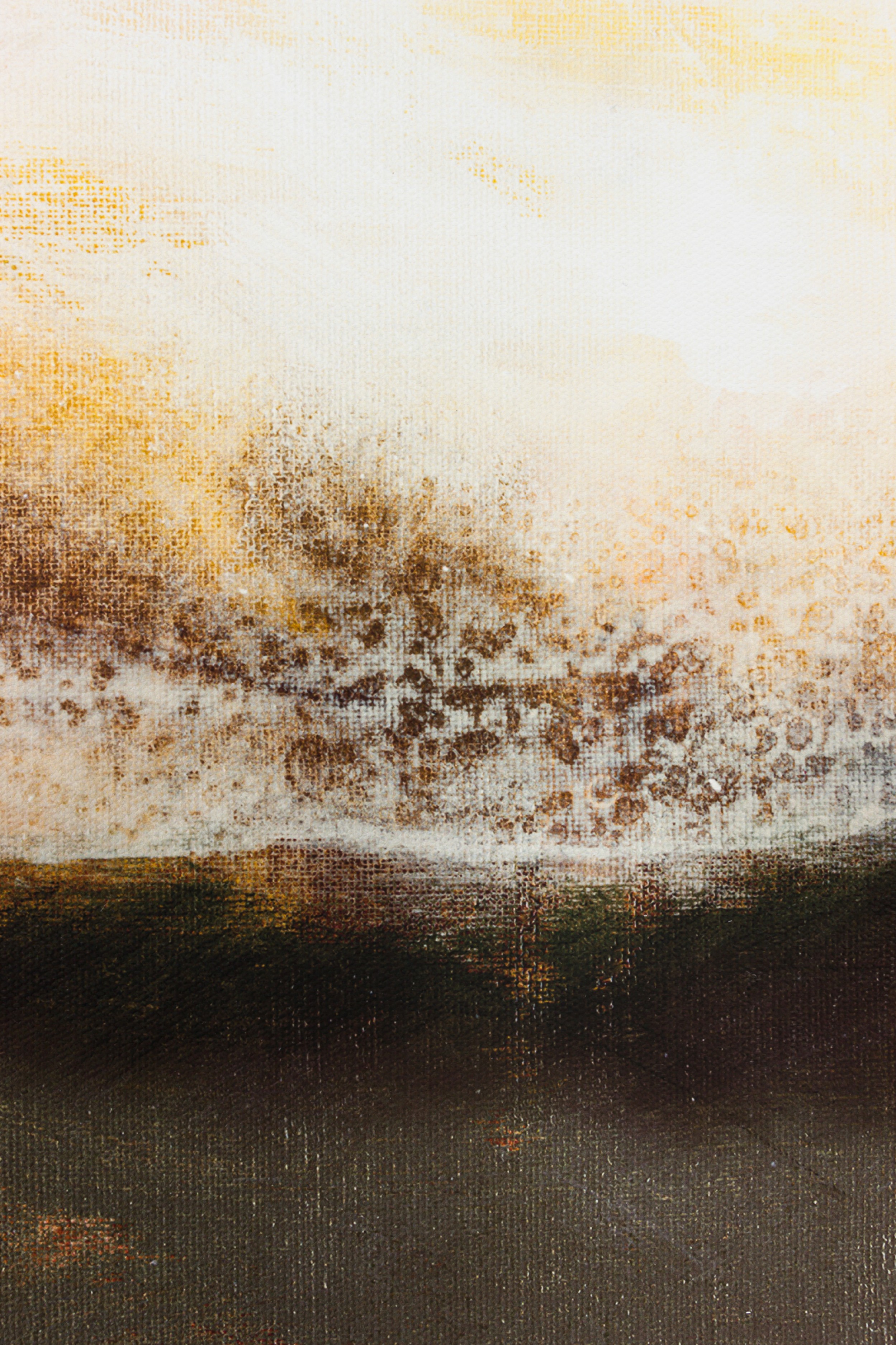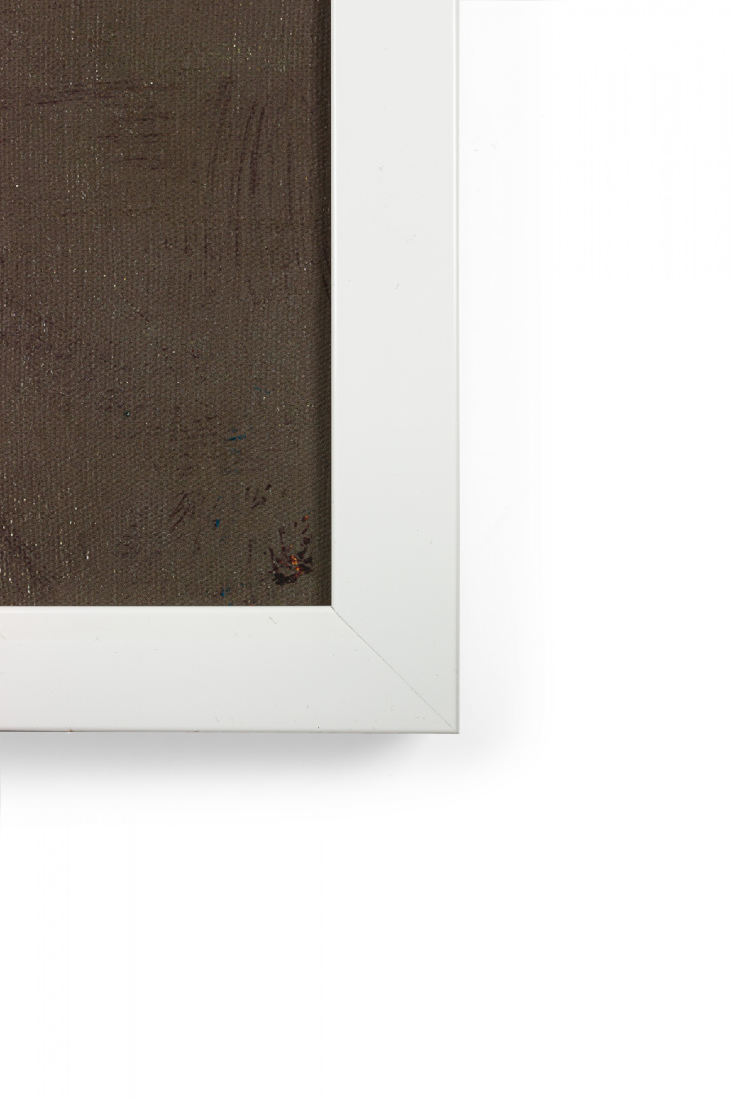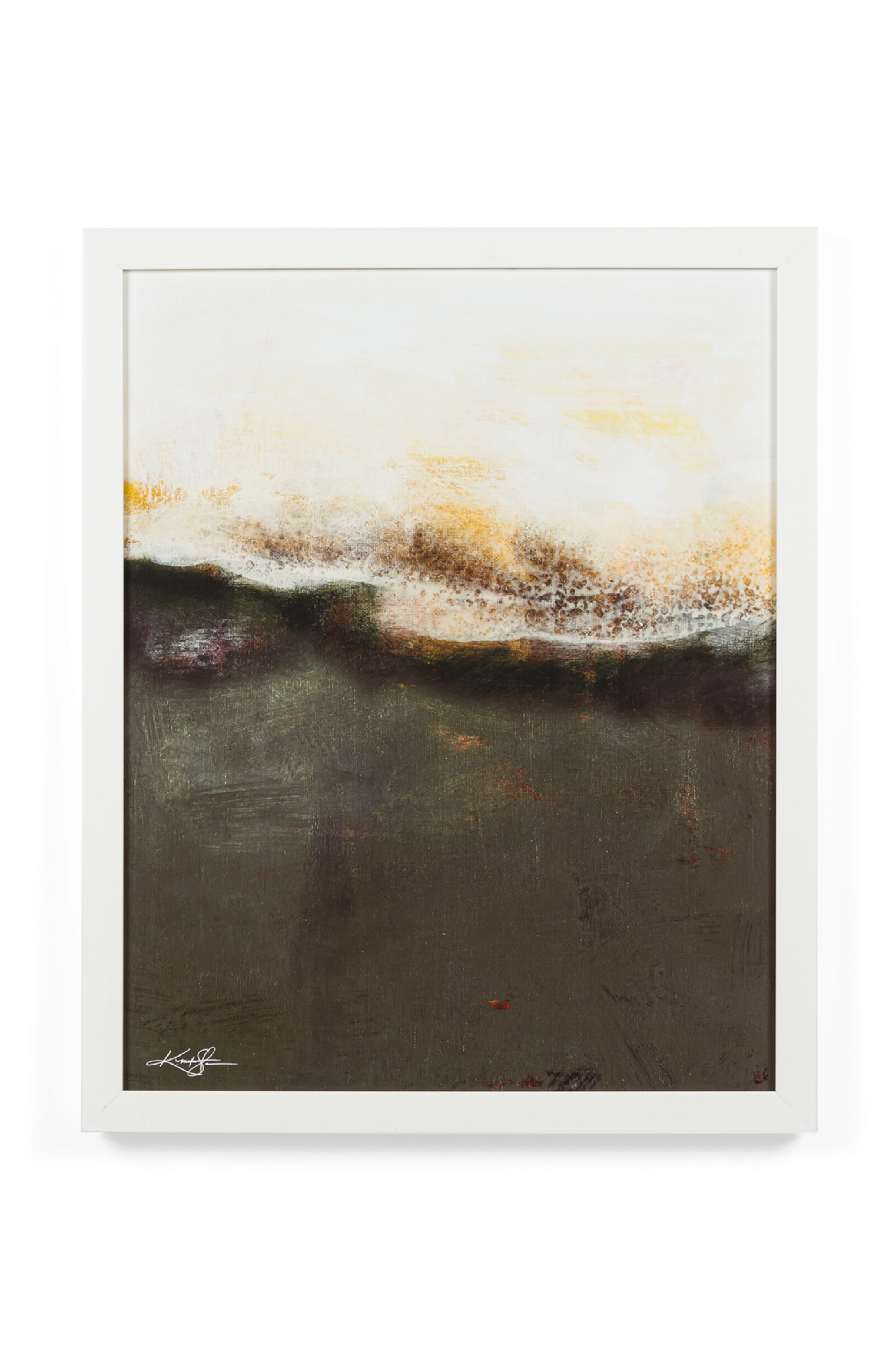 Contemporary print of an acrylic abstract painting depicting a taupe colored lower canvas and beige upper canvas with a central horizontal abstract division on canvas in a white rectangular frame.