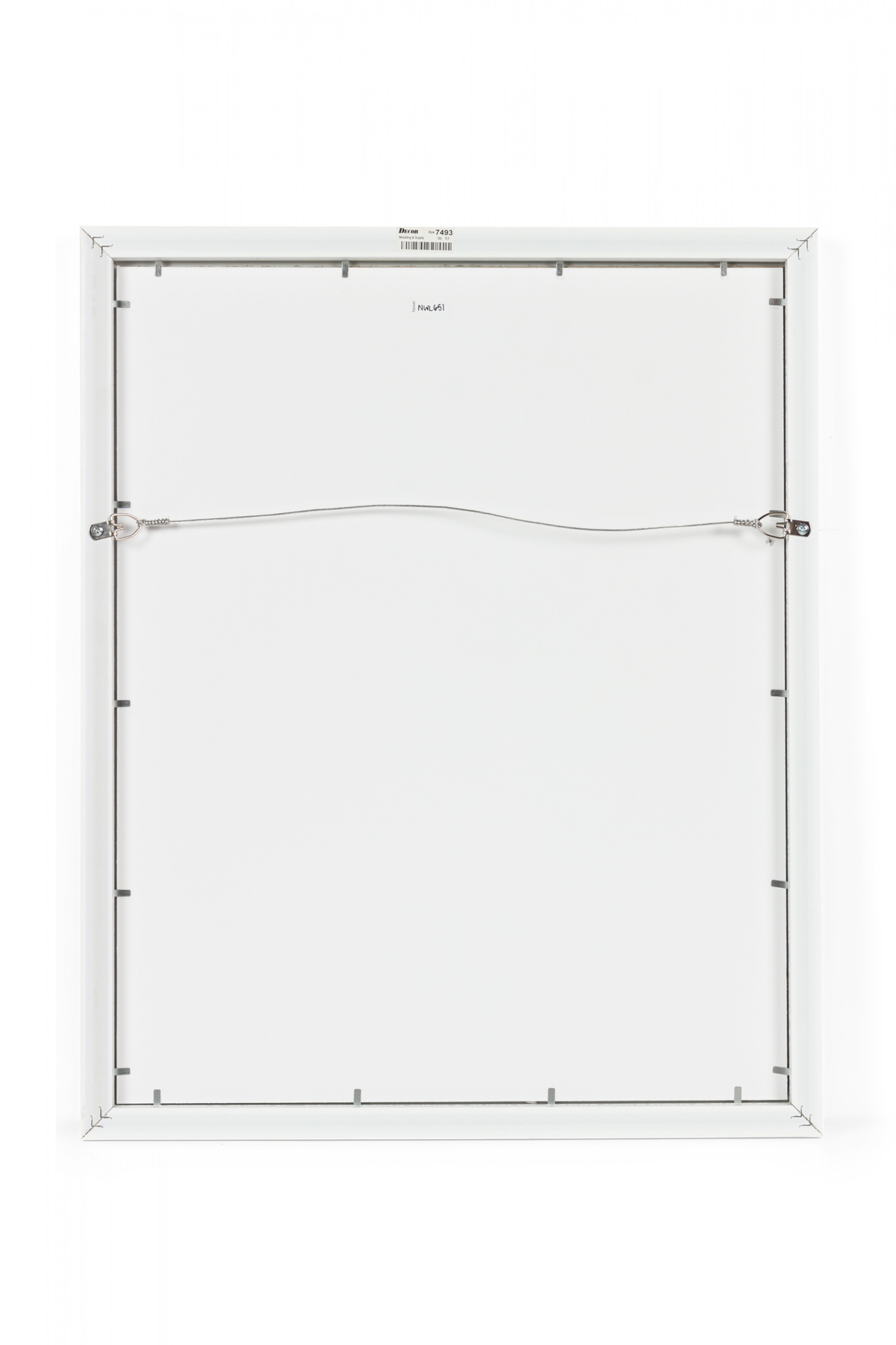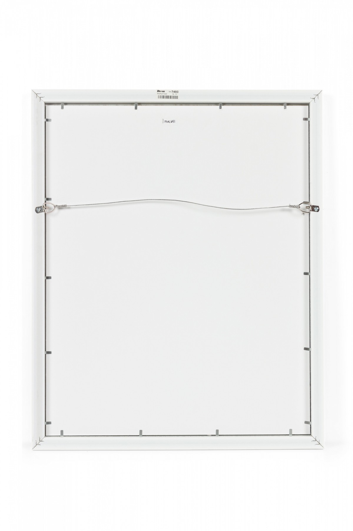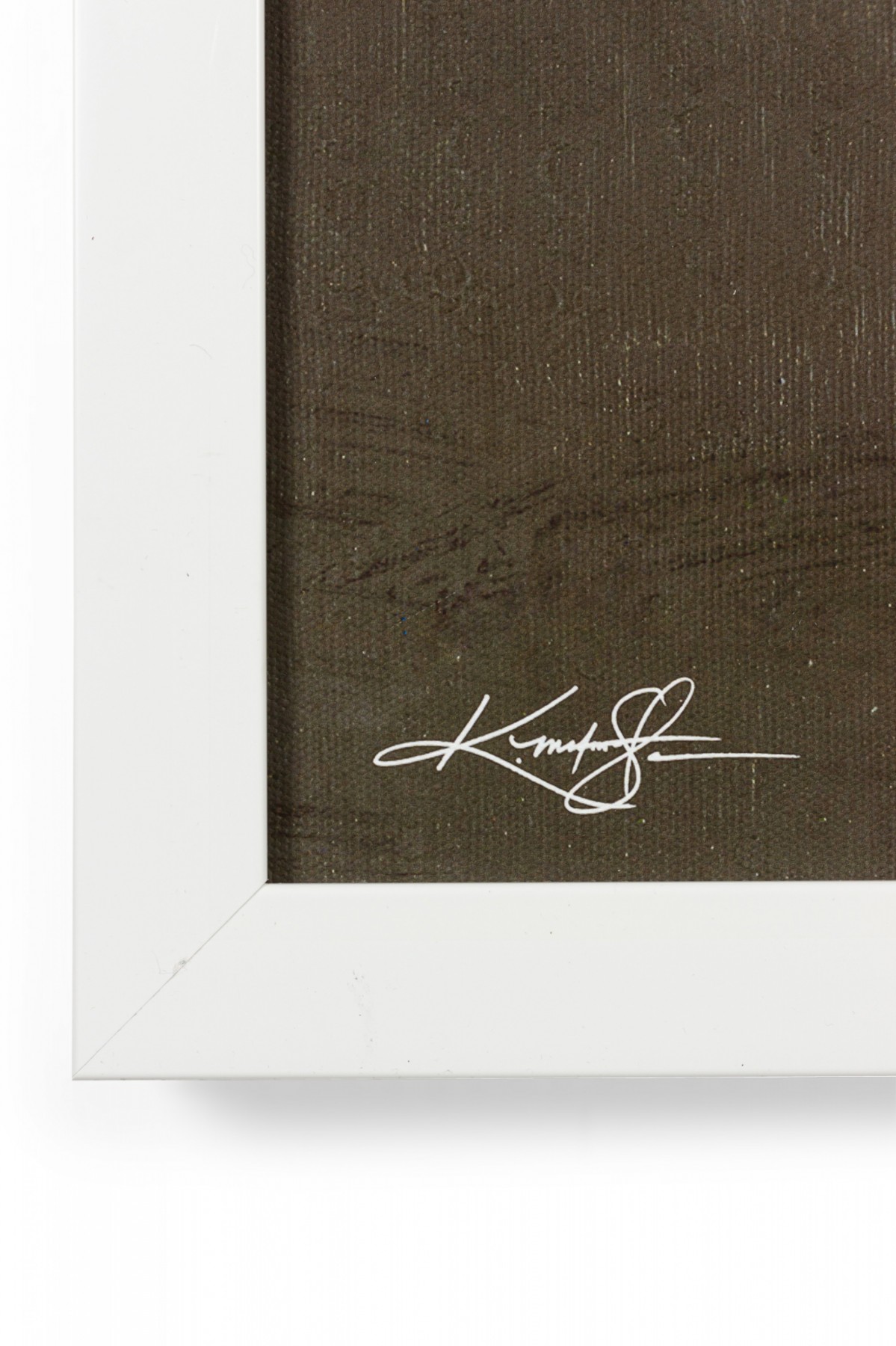 Contemporary print of an acrylic abstract painting depicting a taupe colored lower canvas and beige upper canvas with a central horizontal abstract division on canvas in a white rectangular frame.