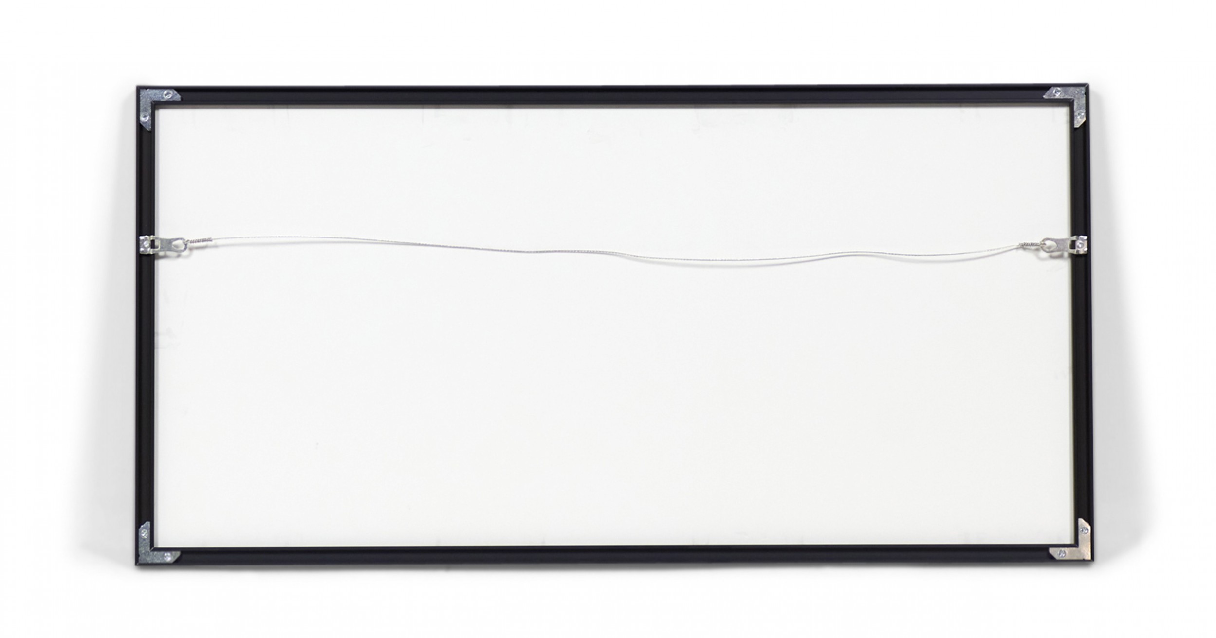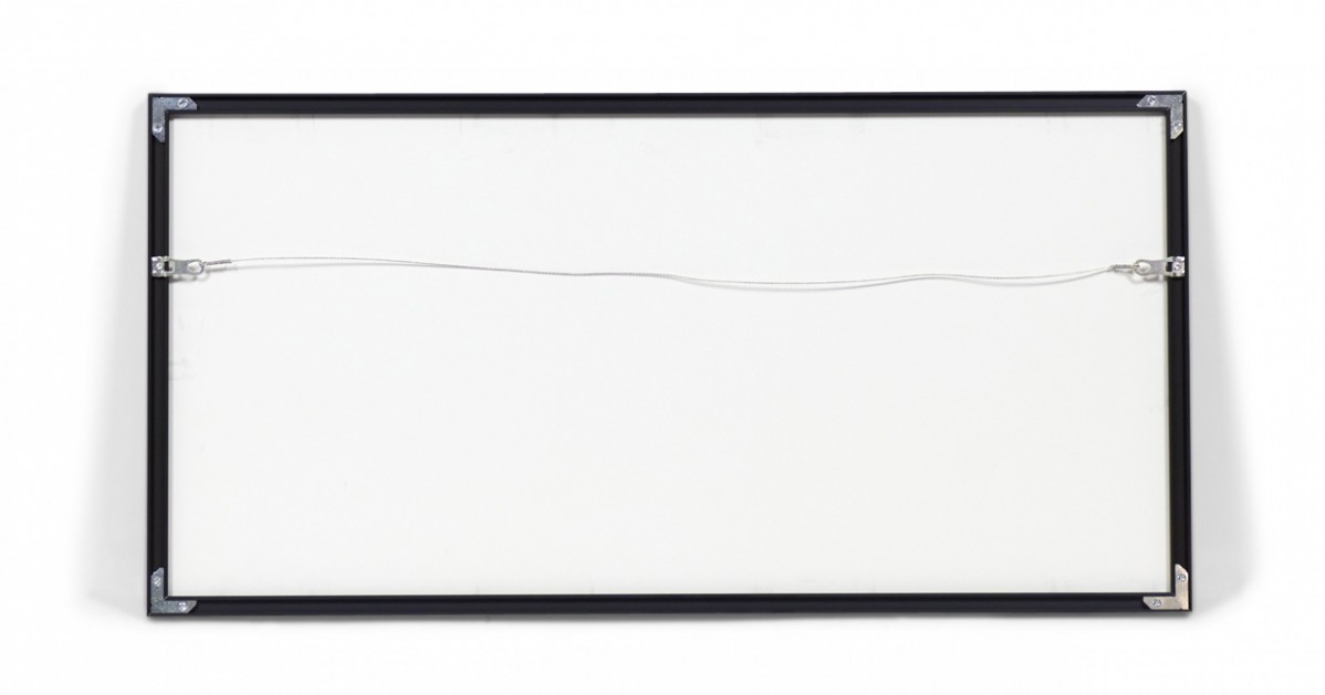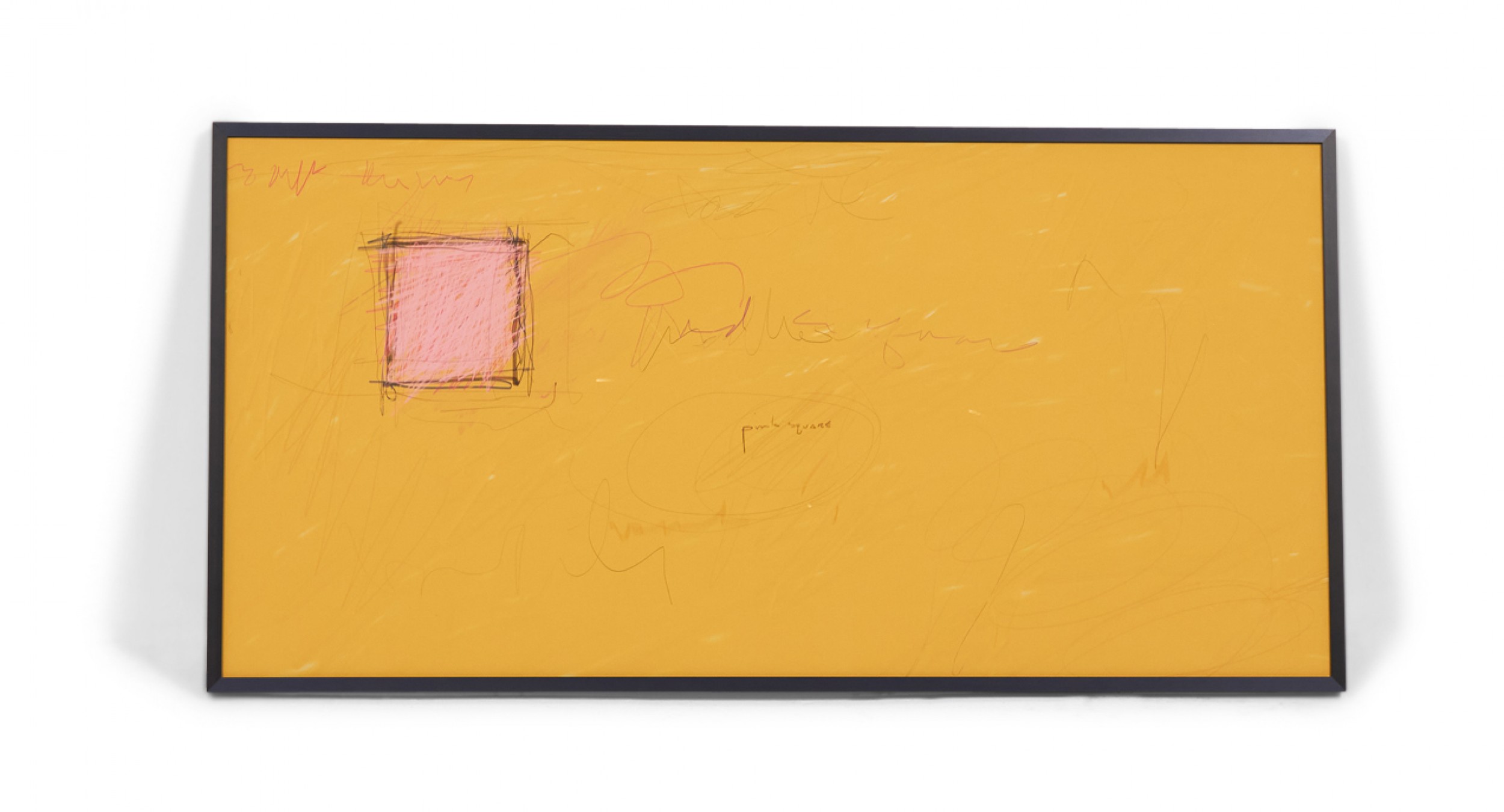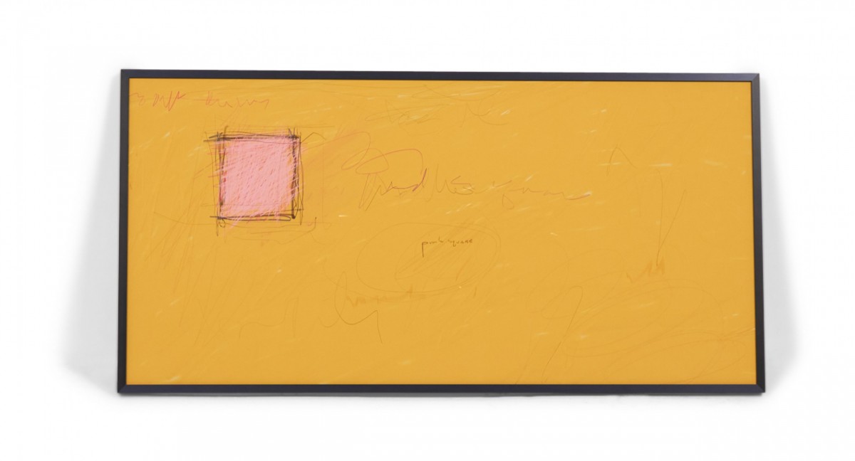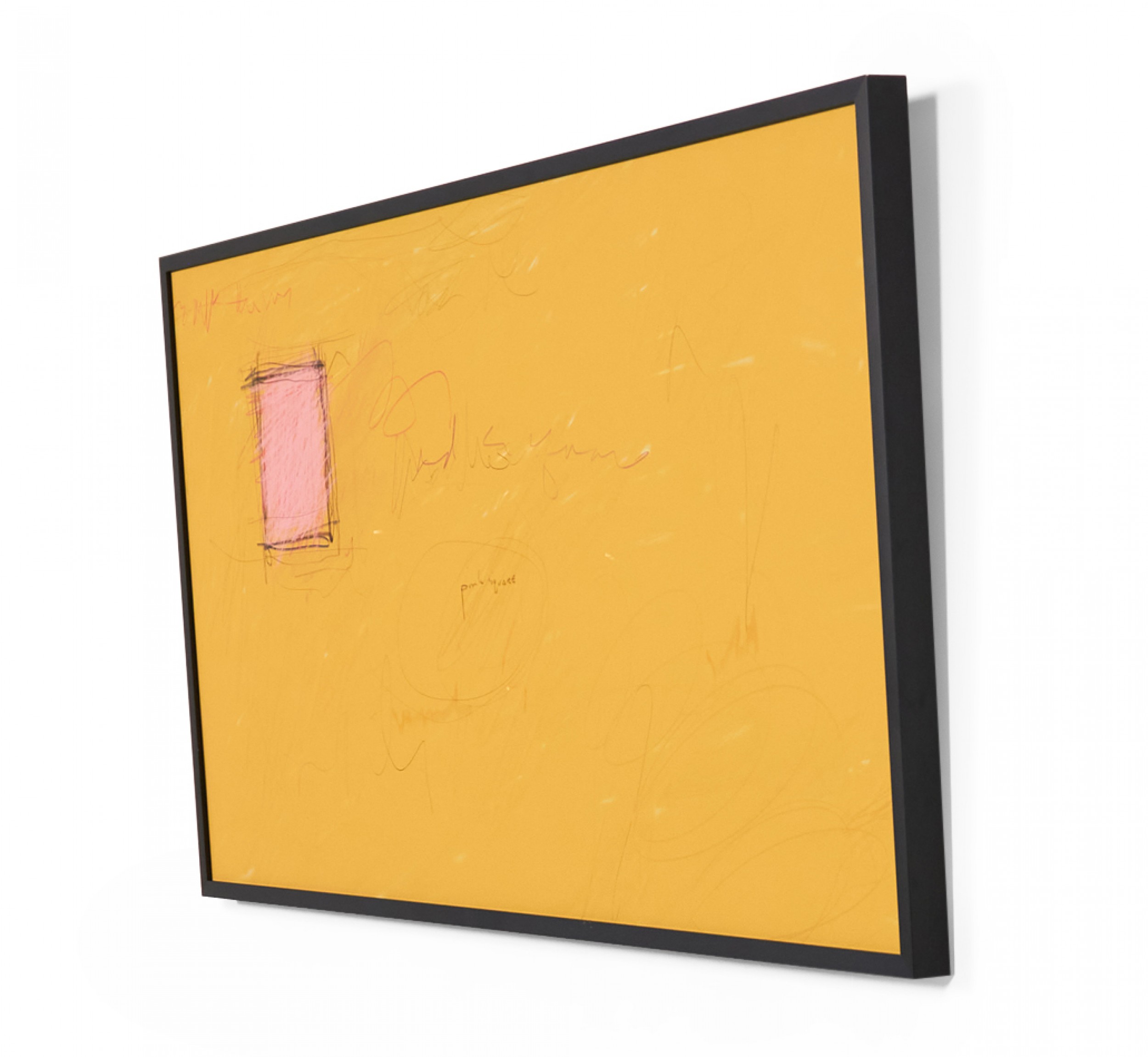 Contemporary print of an abstract acrylic painting featuring a pink square in the upper left corner against a tan / gold background on stretched canvas mounted in a long rectangular thin black metal frame.