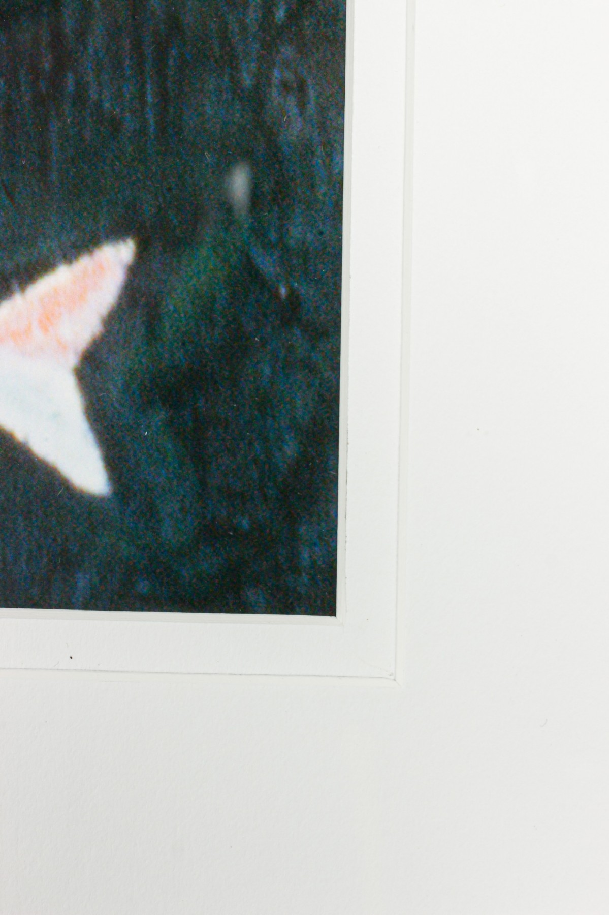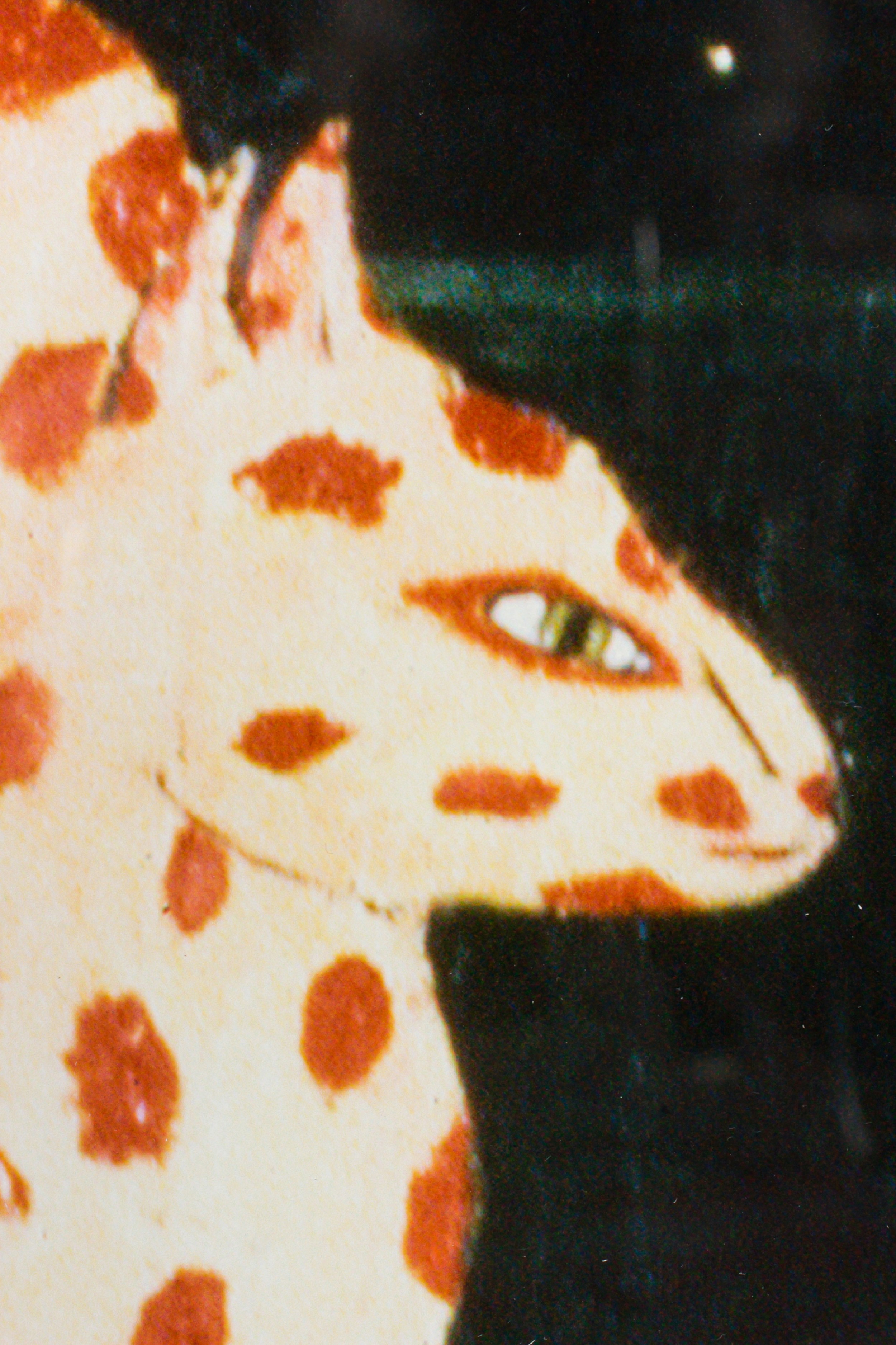 Contemporary print of an acrylic painting / illustration of two spotted cats, one orange and one black and white, against a black background next to a white fish skeleton on paper in a black wooden frame with a beige double mat.